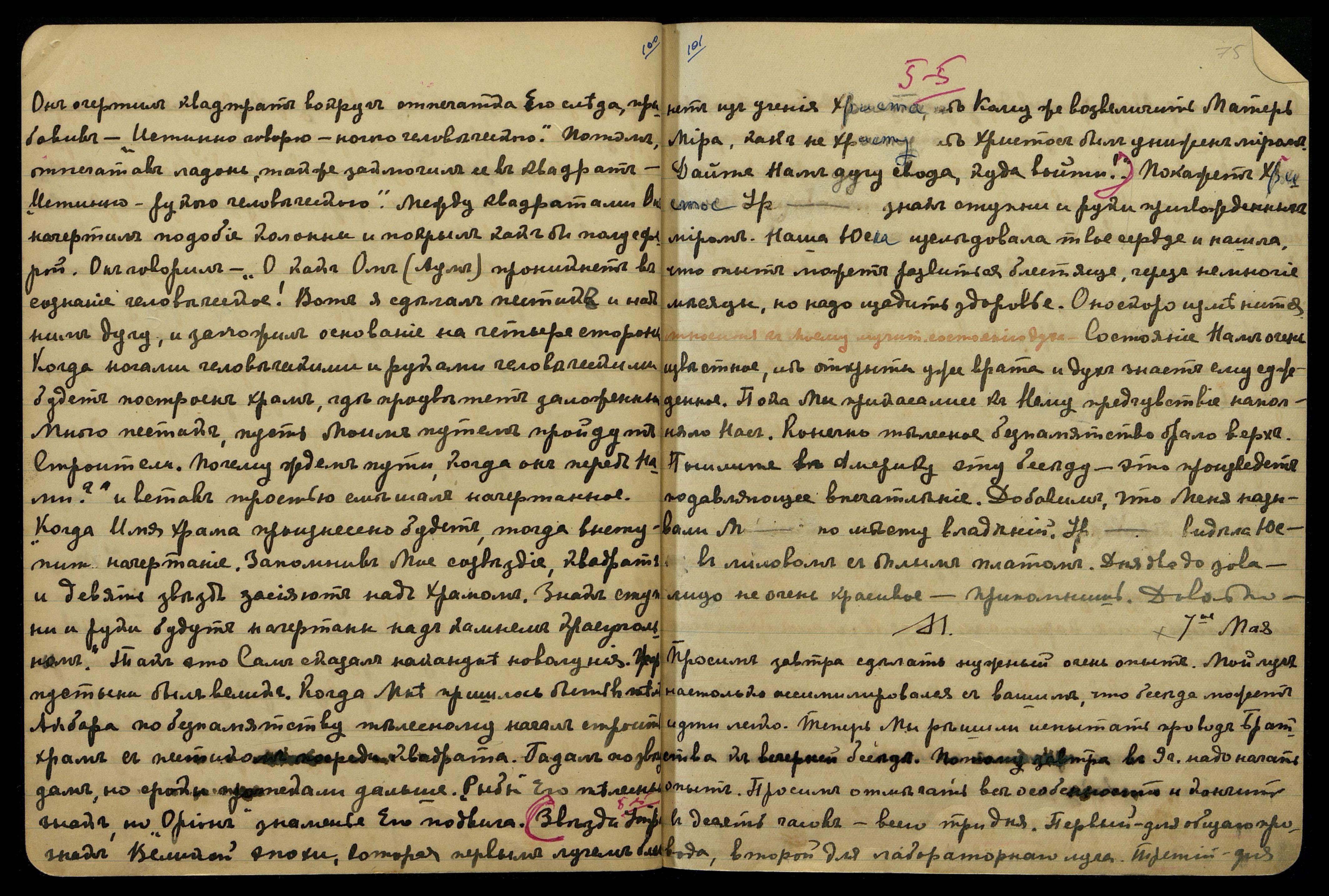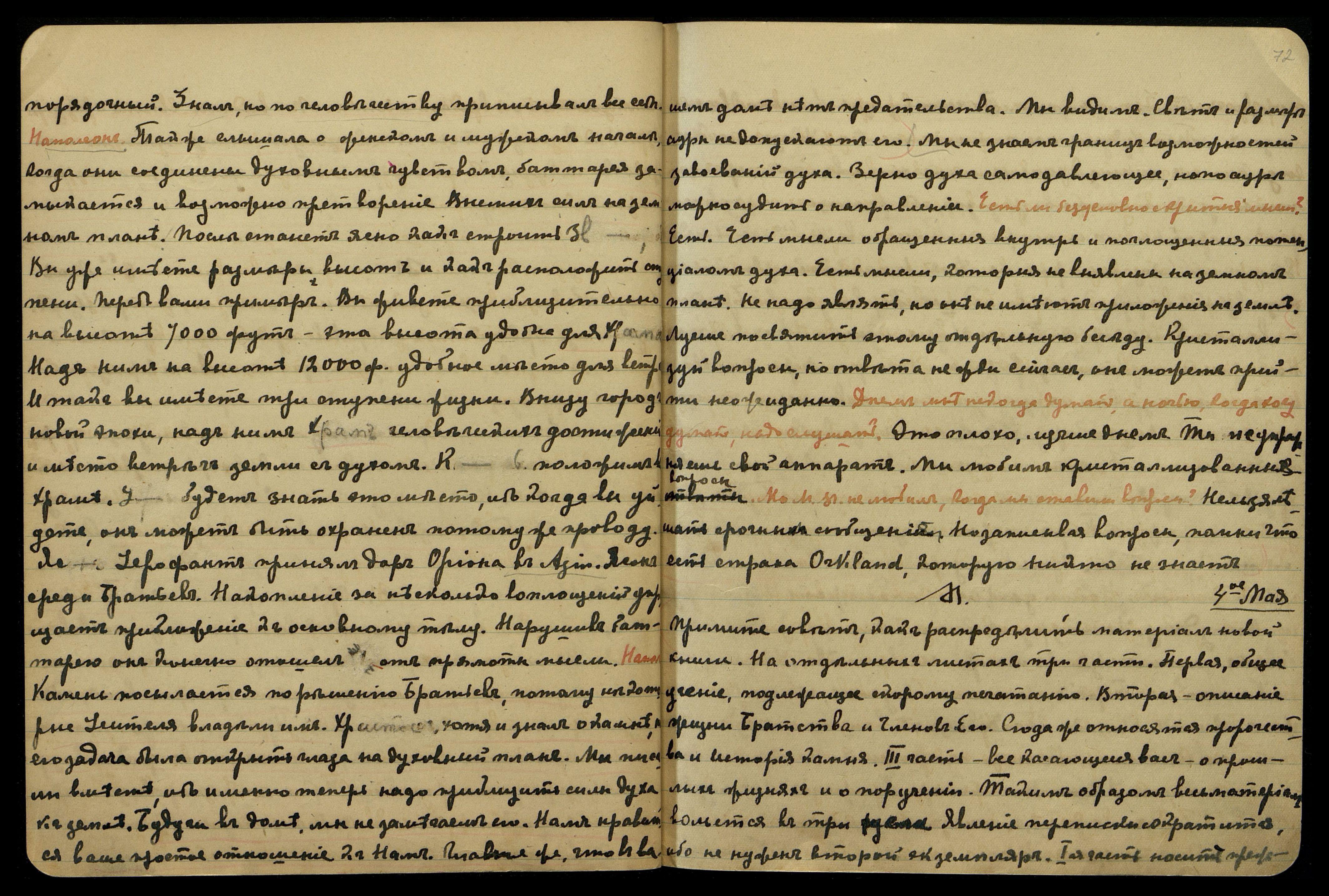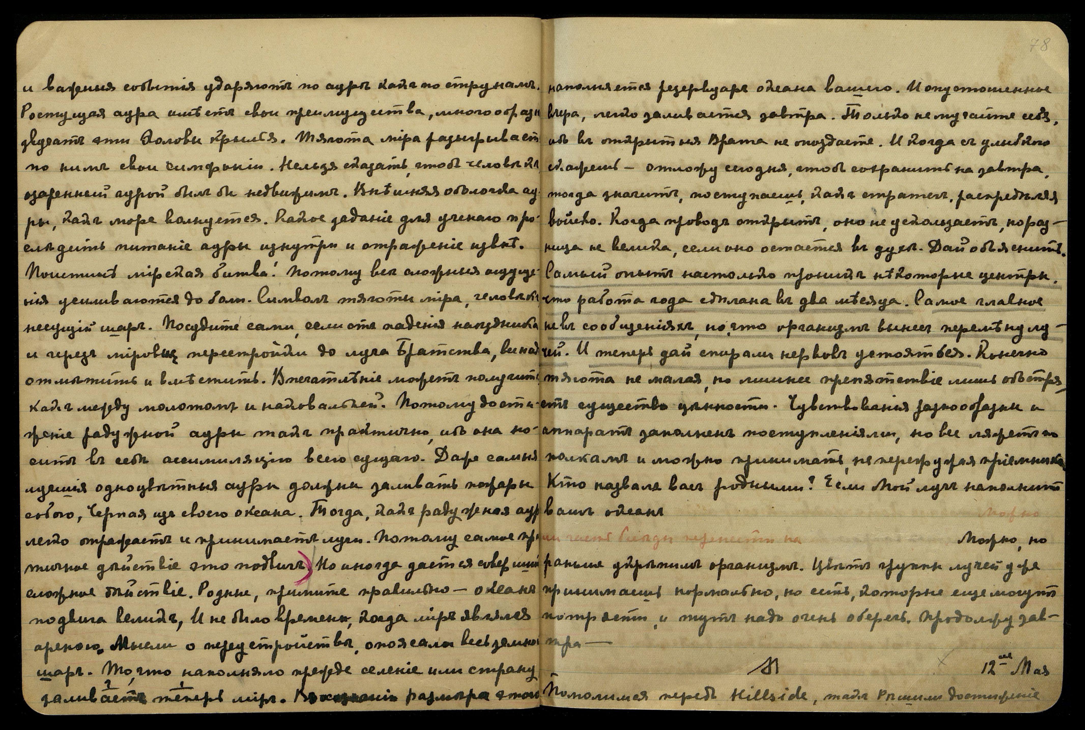 7-ое мая. Просим завтра сделать нужный очень опыт. Мой луч настолько ассимилировался с вашим, что беседа может идти легко. Теперь Мы решили испытать провод Братства к вечерней беседе. Потому завтра в 9 ч[асов] надо начать опыт. Просим отмечать все особенности и кончить в десять часов, всего три дня. Первый для общего провода, второй для лабораторного луча. Третий для
