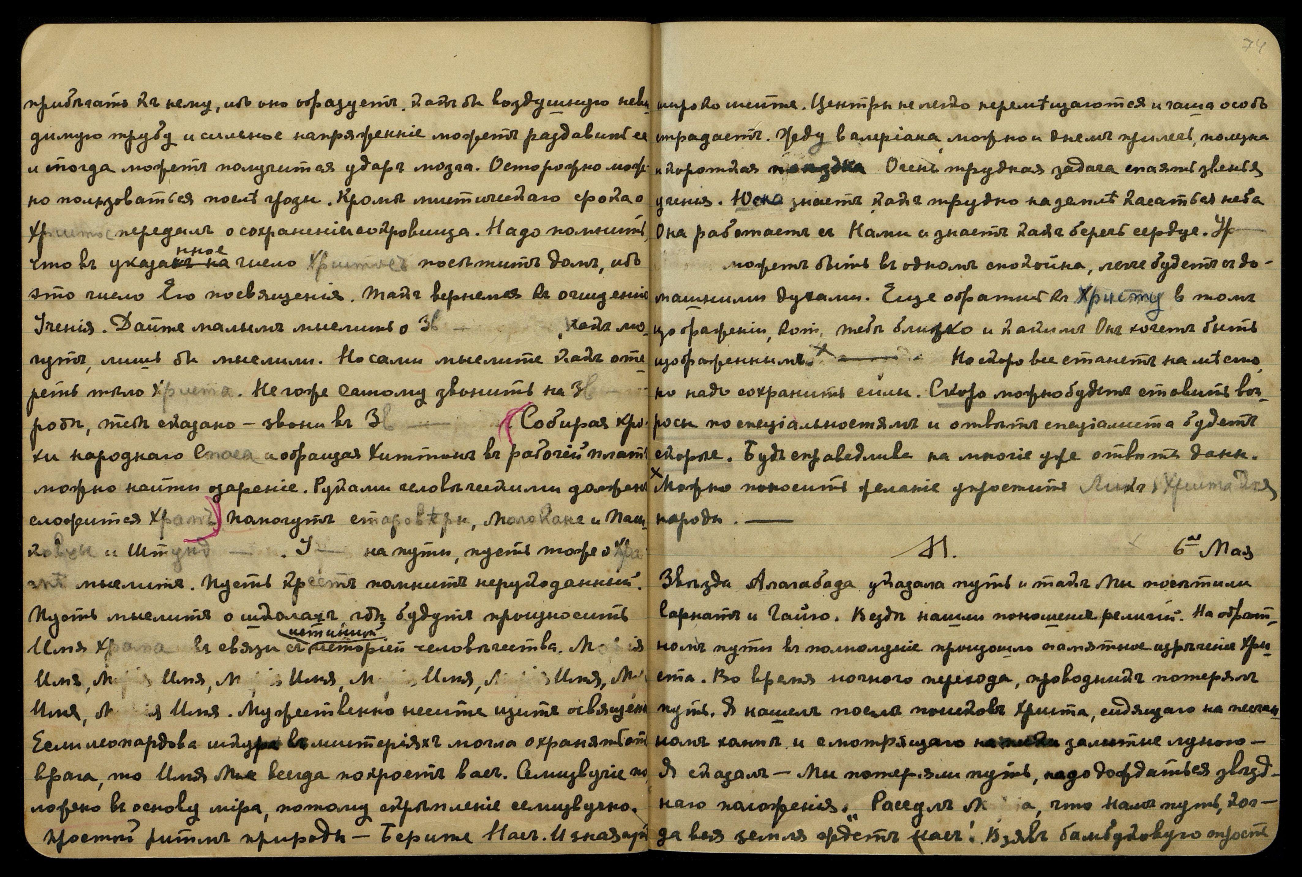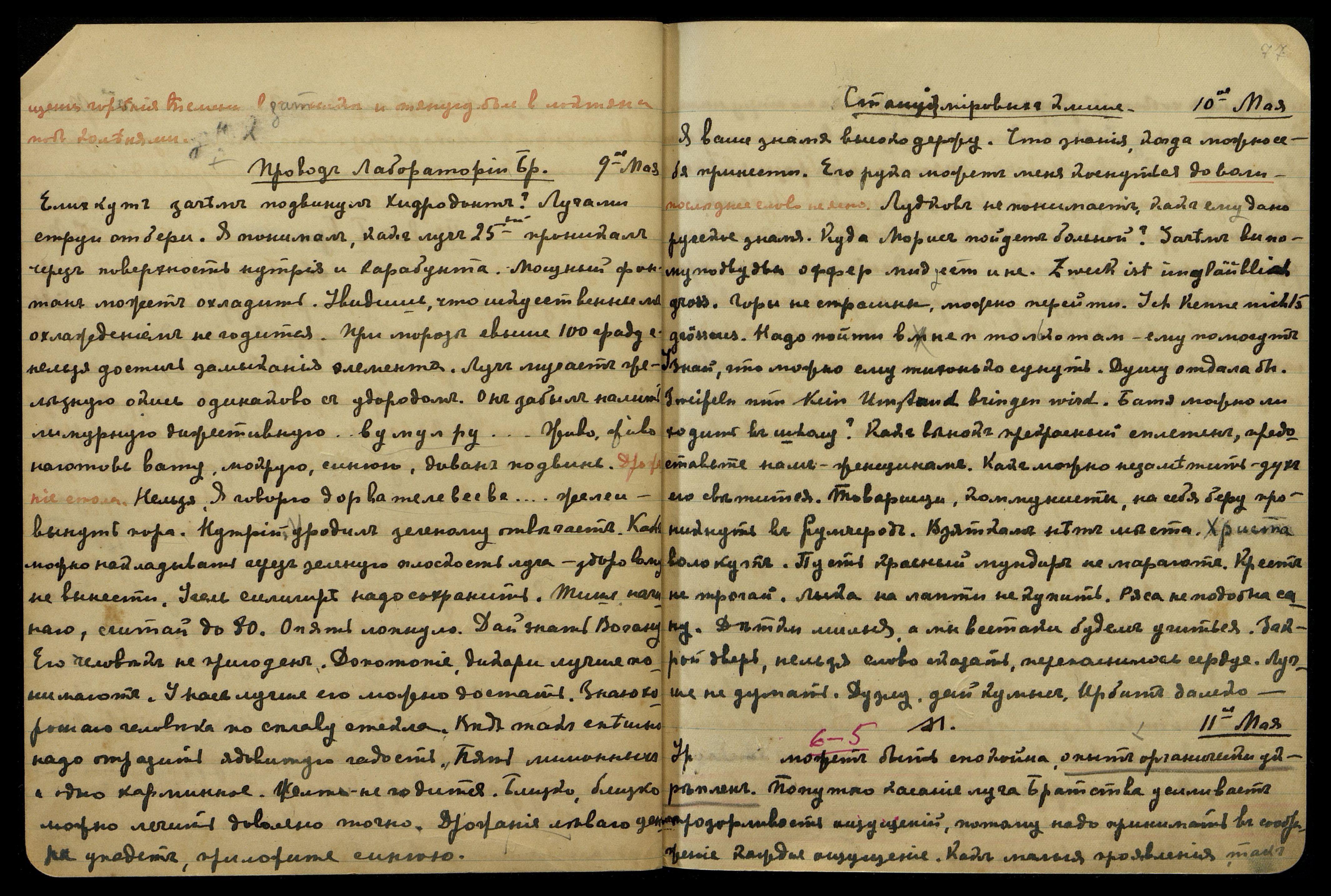 10-ое мая. Я ваше знамя высоко держу. Что знания, когда можно себя принести. Его рука может меня коснуться до воли (последнее слово неясно). Лудков не понимает, как ему дано русское знамя. Куда Морис пойдёт больной? Зачем виному по дву два оффер мидуест и не. Zweck ist unglaublich gross. [нем.: Цель невероятно велика]. Горы не страшны, можно перейти. Ich kenne nichts grosseres. [нем.: Я не знаю ничего большего]. Надо пойти в исп только там ему помогут. Узнай, что можно ему тихонько сунуть. Душу отдала бы. Zweifeln nun kein Umtausch bringen wird. [нем.: Сомнения теперь не принесут обмена]. Батя, можно ли ходить в школу? Как венок прекрасный сплетен, предоставьте нам — женщинам. Как можно не заметить — дух его светится. Товарищи коммунисты, на себя беру проникнуть в Румчерод. Взяткам нет места. Христа волокут. Пусть красный мундир не марают. Крест не трогай. Лыка на лапти не купить. Ряса не подобна сану. Детки, милые, а мы всё-таки будем учиться. Закрой дверь, нельзя слово сказать, переполнилось сердце. Лучше не думать. Дузлу, дай кумыс, Ирбит далеко.