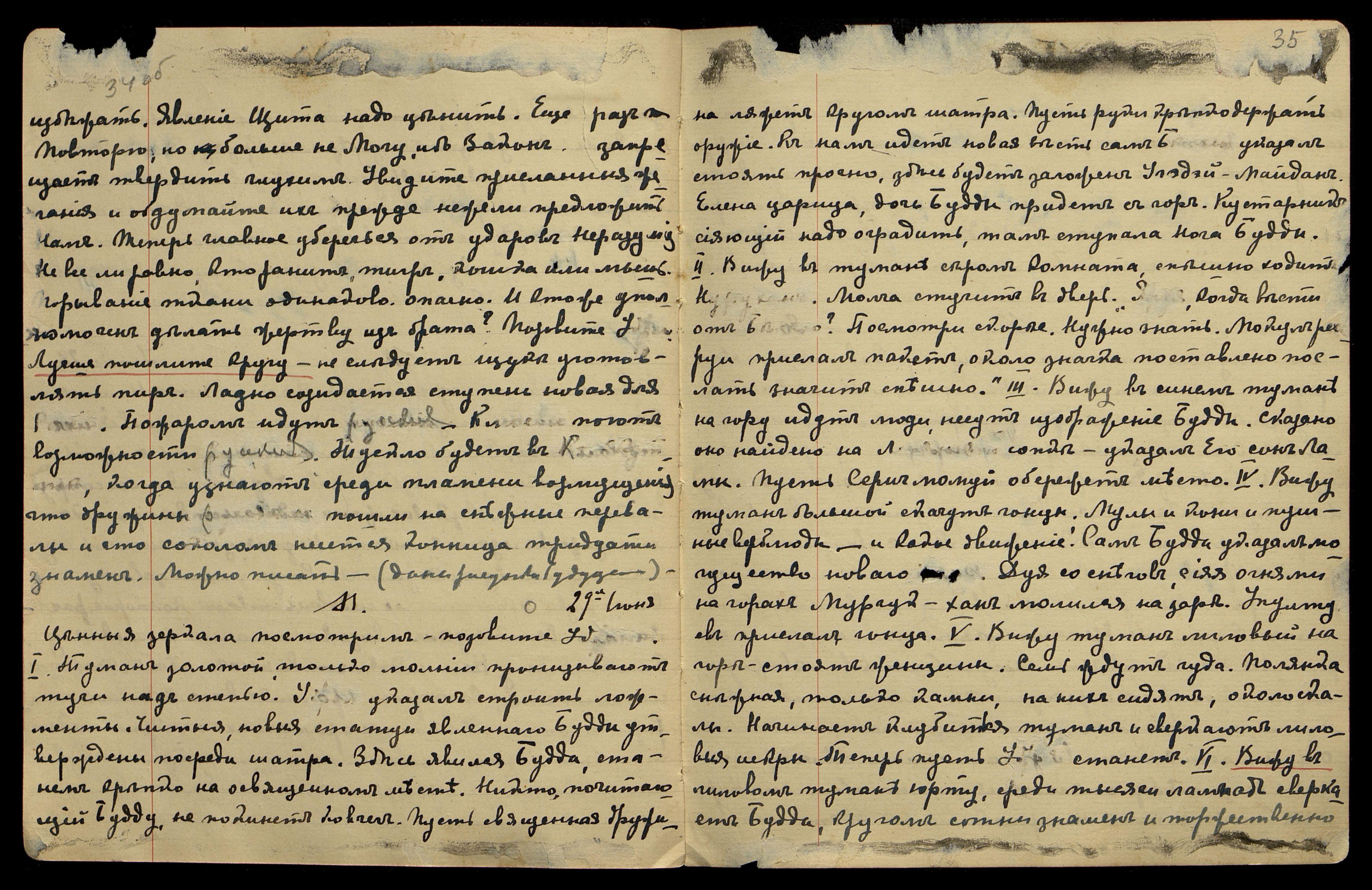 тонкие ряды пехоты. Налево трещат выстрелы, и гулко раздаётся орудийная стрельба. Вот вынесся полк и слышны крики солдат, мелькнуло лицо м[онгола] с х[анским] значком. Проснулся Л[ама] на лбу пот и увидел, что зажглись лампады у ног Благословенного и высокий человек совершает Таинство перед алтарем. Затем туман застлал нишу, и услышал Л[ама] ржание коней на дворе, выглянул за окно и увидел старого наставника монастыря, уезжающего со двора, позвал слугу и приказал привести лошадь. На улице заметил иностранцев, идущих на холм. Лет 20 тому назад видел таких же. Но продолжает свой путь Л[ама], завтра заедет в монастырь на реке. Довольно, можно писать.