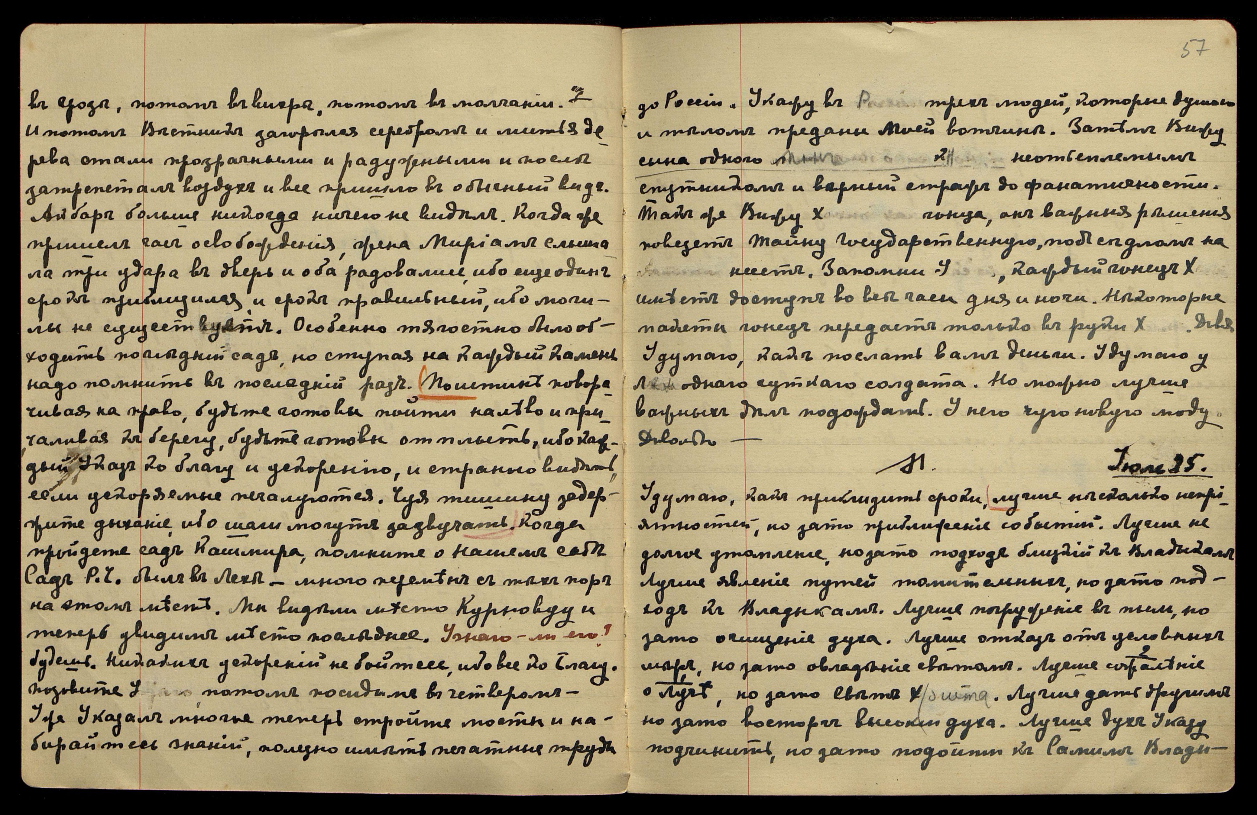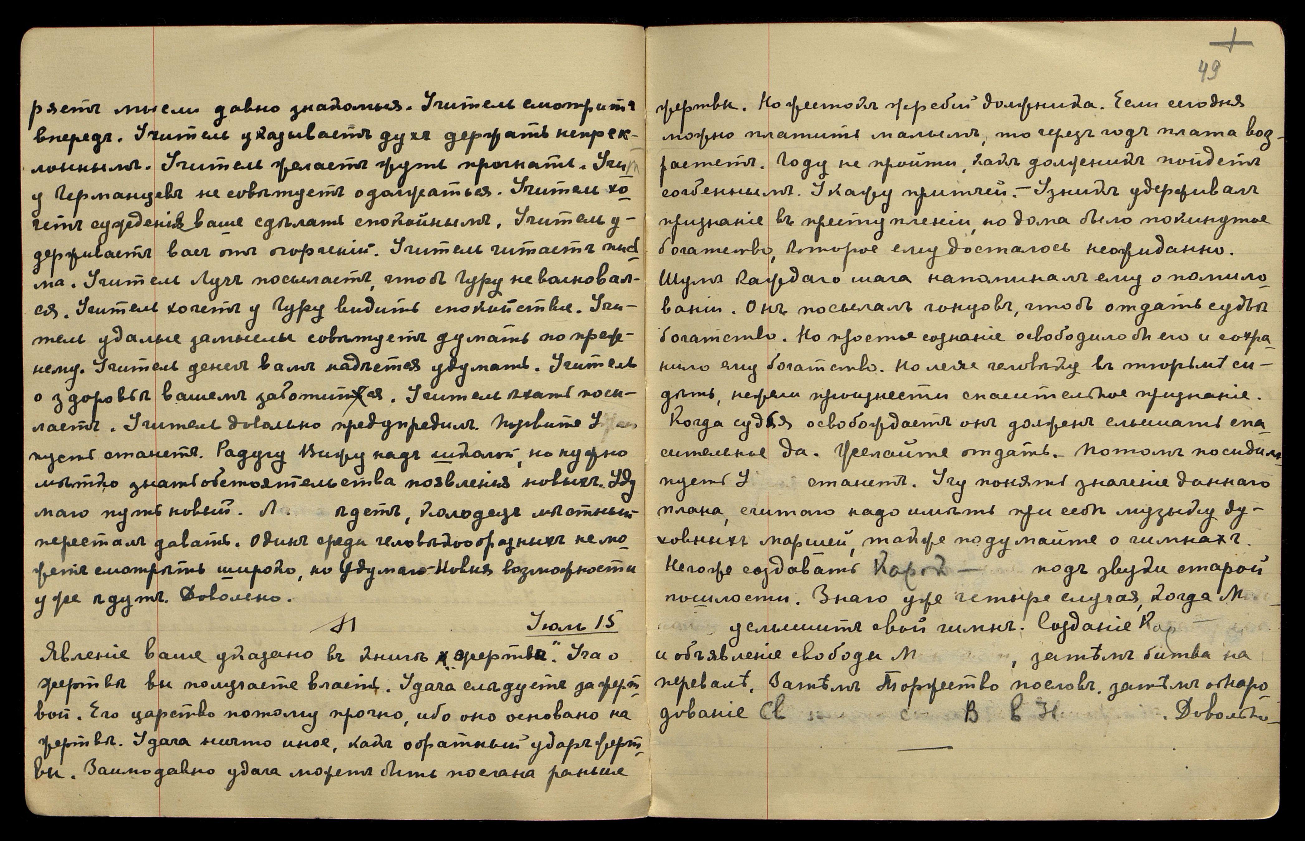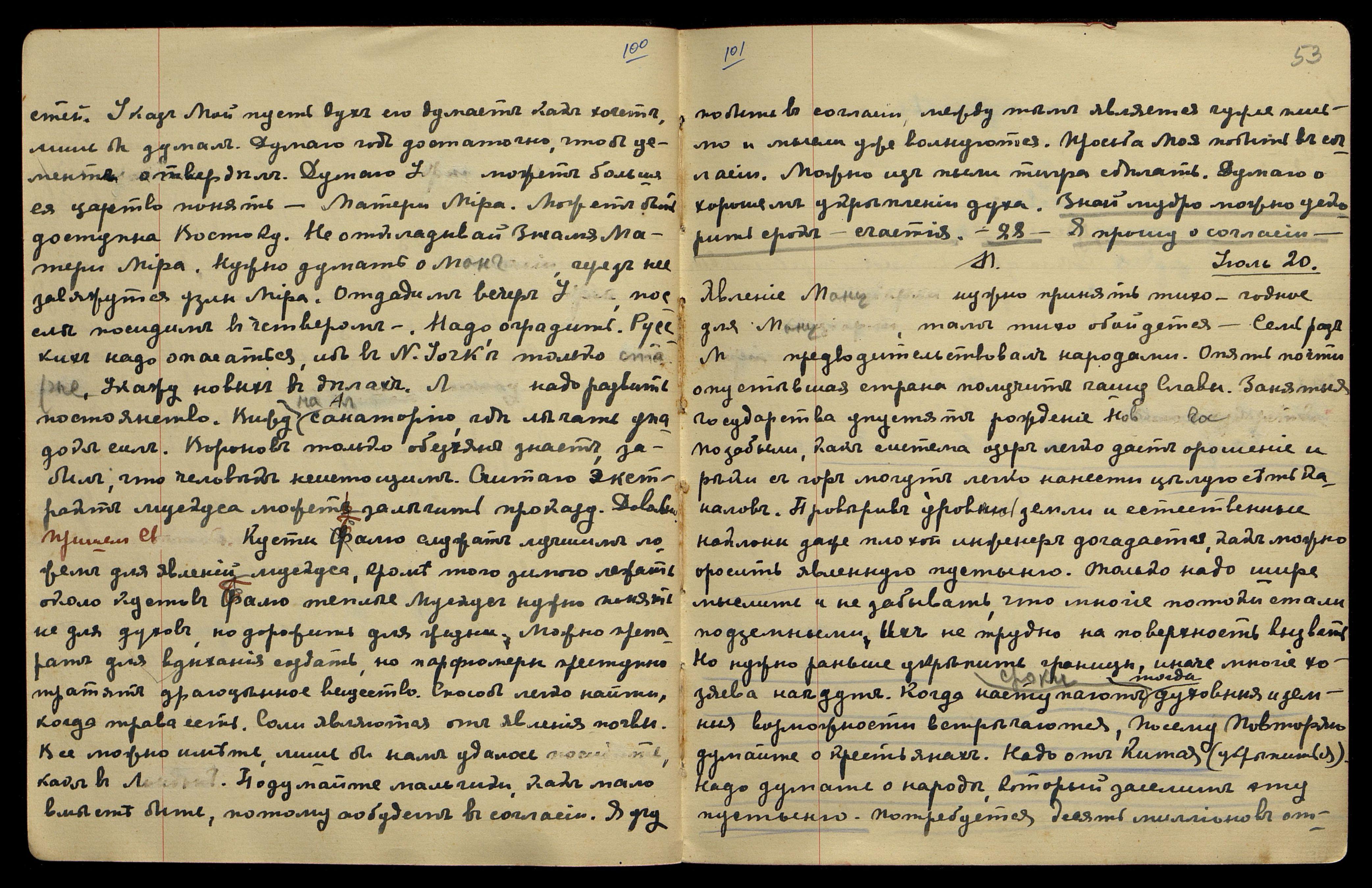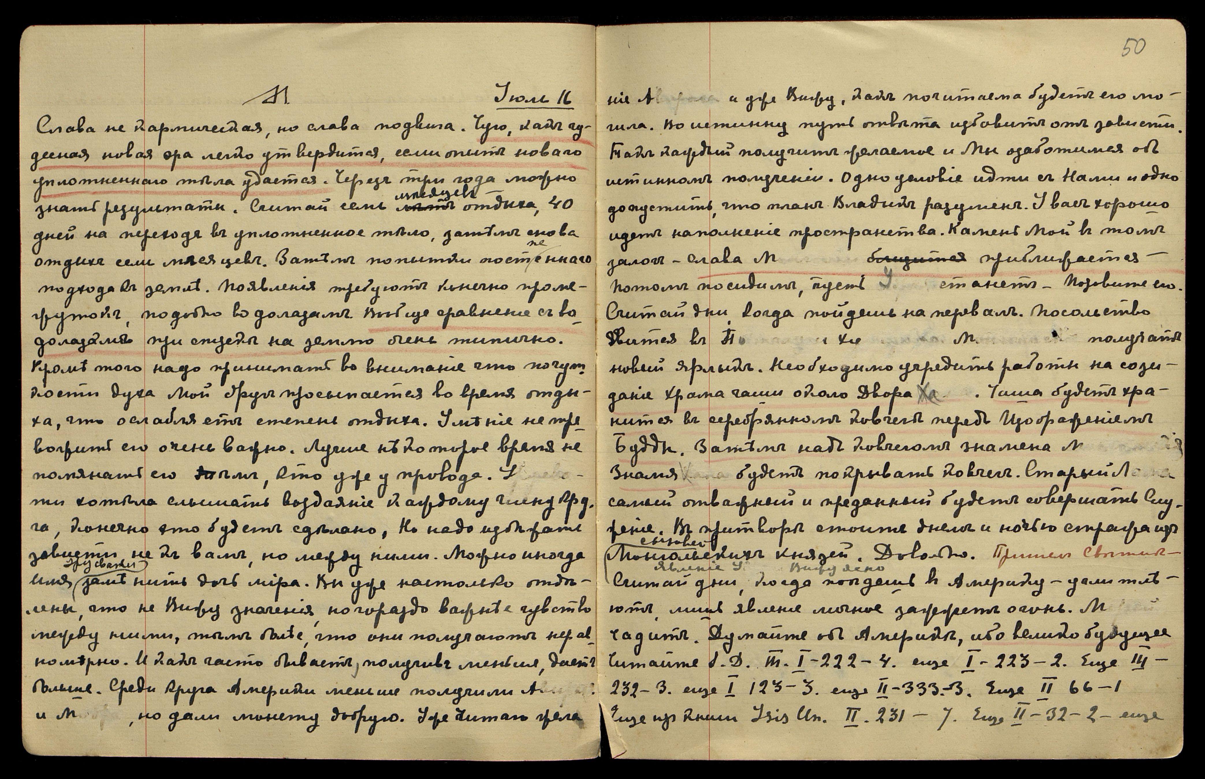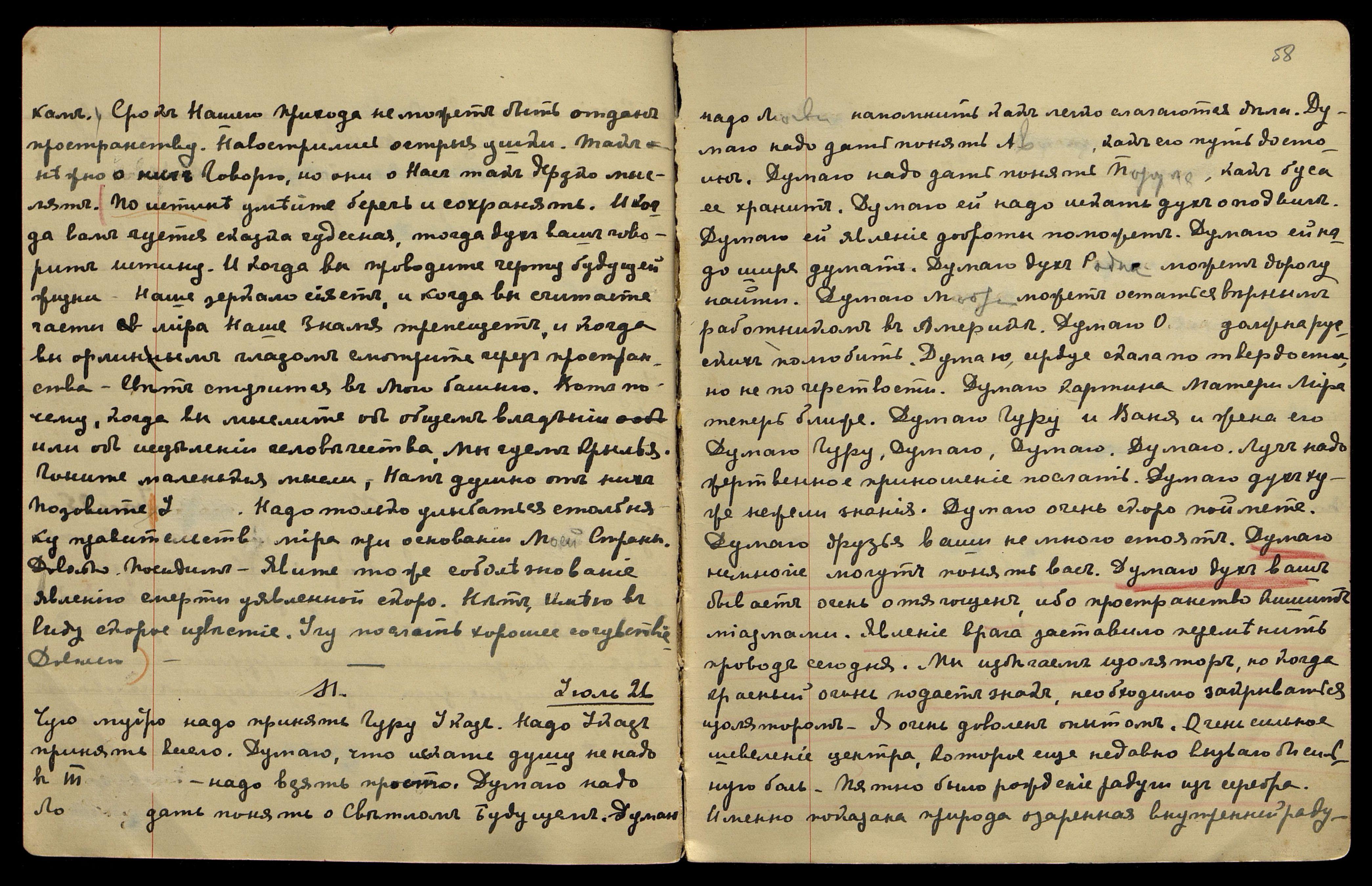 Пришёл Св[етик]. Можно представить будущую Россию, если Мы учимся русскому языку. Собратия В[осточного] С[вященного] С[оюза]. Китай должен быть отделен точною границею. Разводить растения и животных, можно найти лучшие места баранов и маралов. Надо изучить их жизнь. Полагаю, Мы лучше знаем. Думаю, когда говорю о Новой Стране, знаю, какие преимущества дадут её условия. Дух новый должен поднять вас. Дуновение его, до явления осталось недолго. Чую, нужно полетать духом. Довольно.