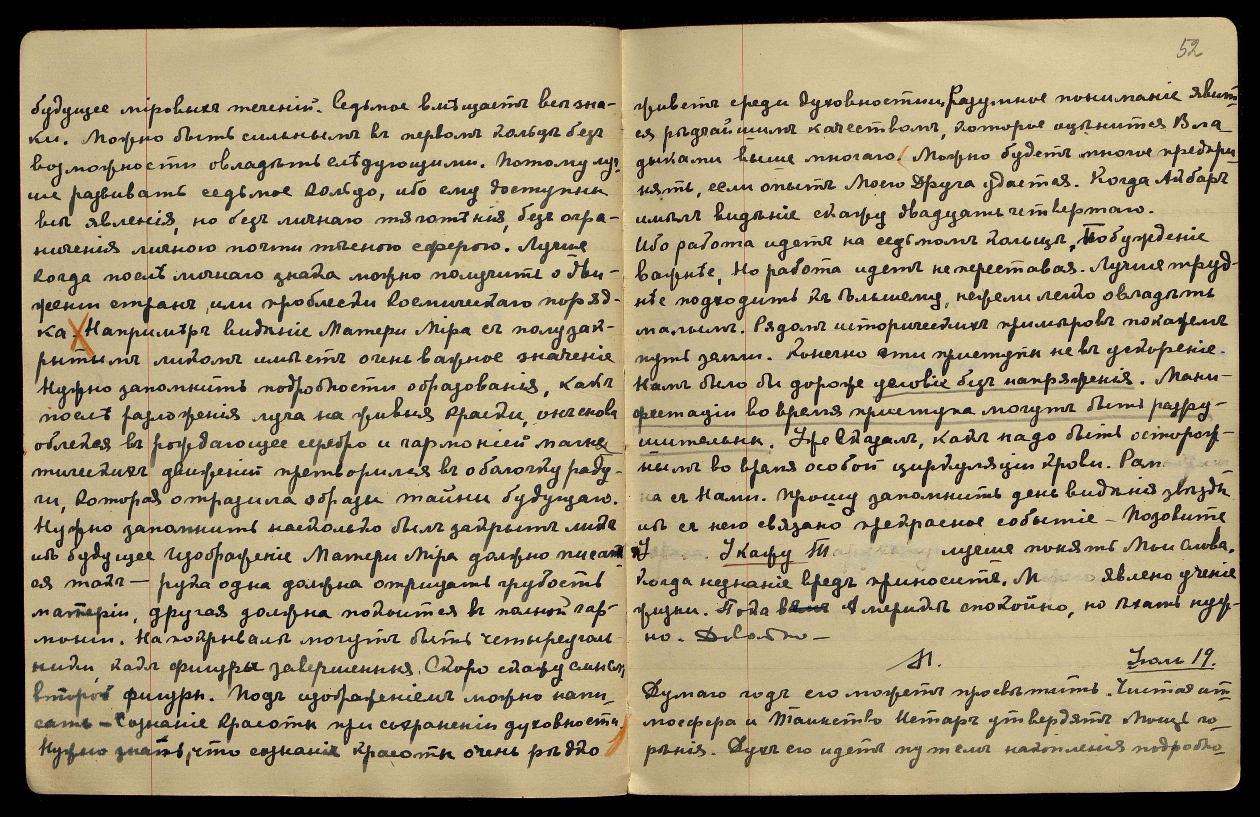 стей. Указ Мой — пусть дух его думает как хочет, лишь бы думал. Думаю, год достаточно, чтоб цемент отвердел. Думаю, У[драя] может больше её царство понять — Матери Мира. Может быть доступна Востоку. Не откладывай Знамя Матери Мира. Нужно думать о Монг[олии], через неё завяжутся узлы Мира. Отдадим вечер У[драе], после посидим вчетвером. Надо оградить. Русских надо опасаться, ибо в N[ew] York'e только старые. Укажу новых в делах. Л[юмоу] надо развить постоянство. Вижу на Ал[тае] санаторий, где лечат упадок сил. Воронов только обезьян знает, забыл, что человек неистощим. Считаю, экстракт мускуса может залечить проказу. Довольно.