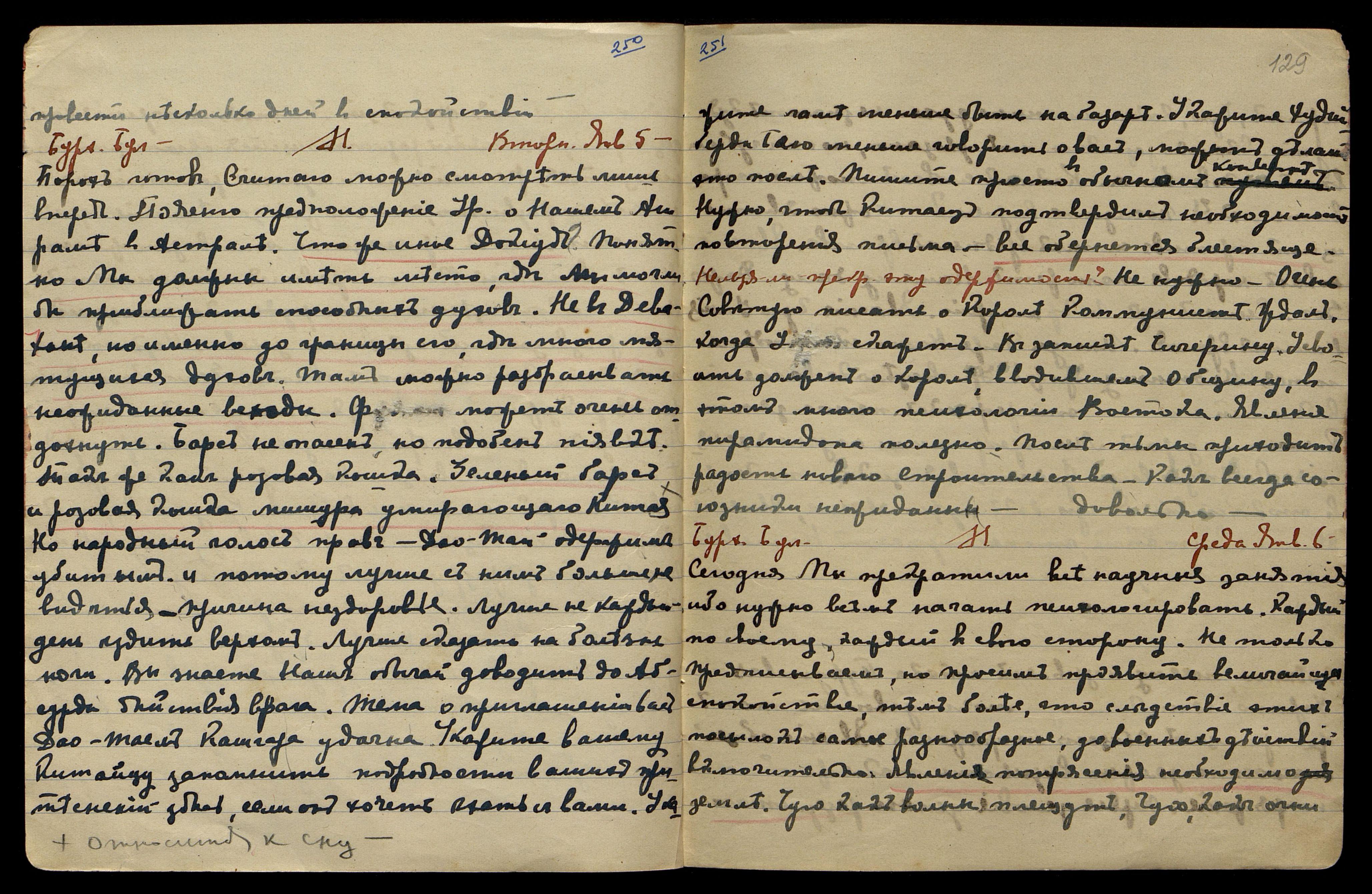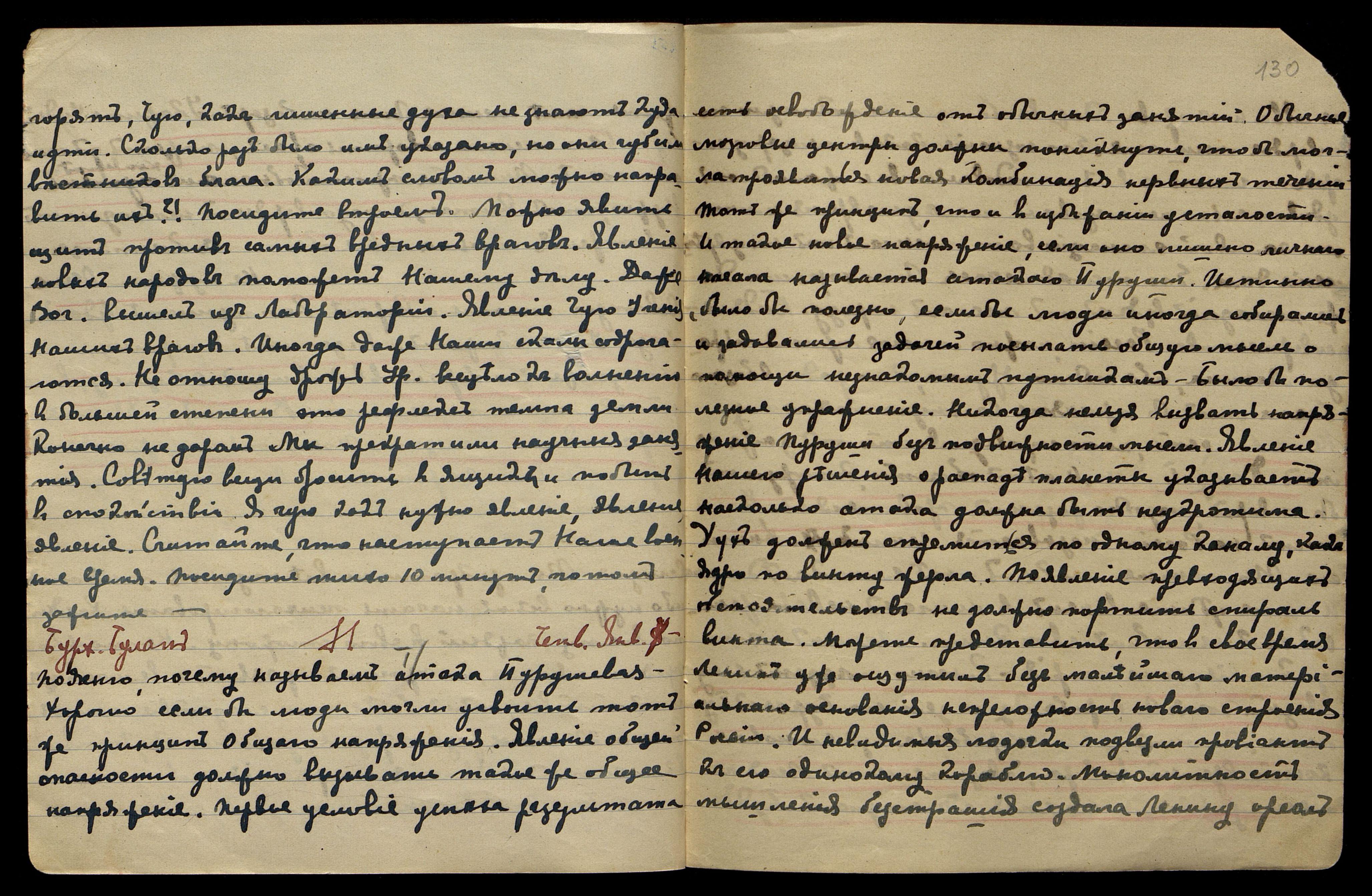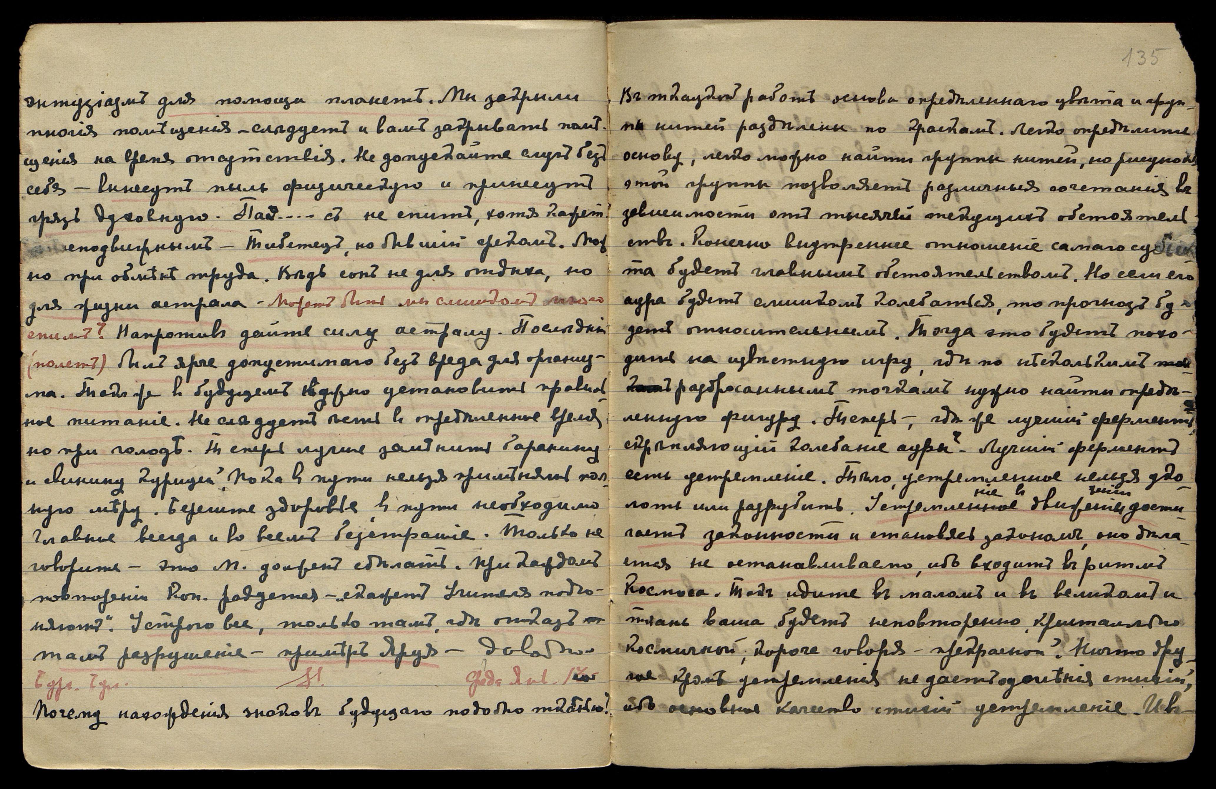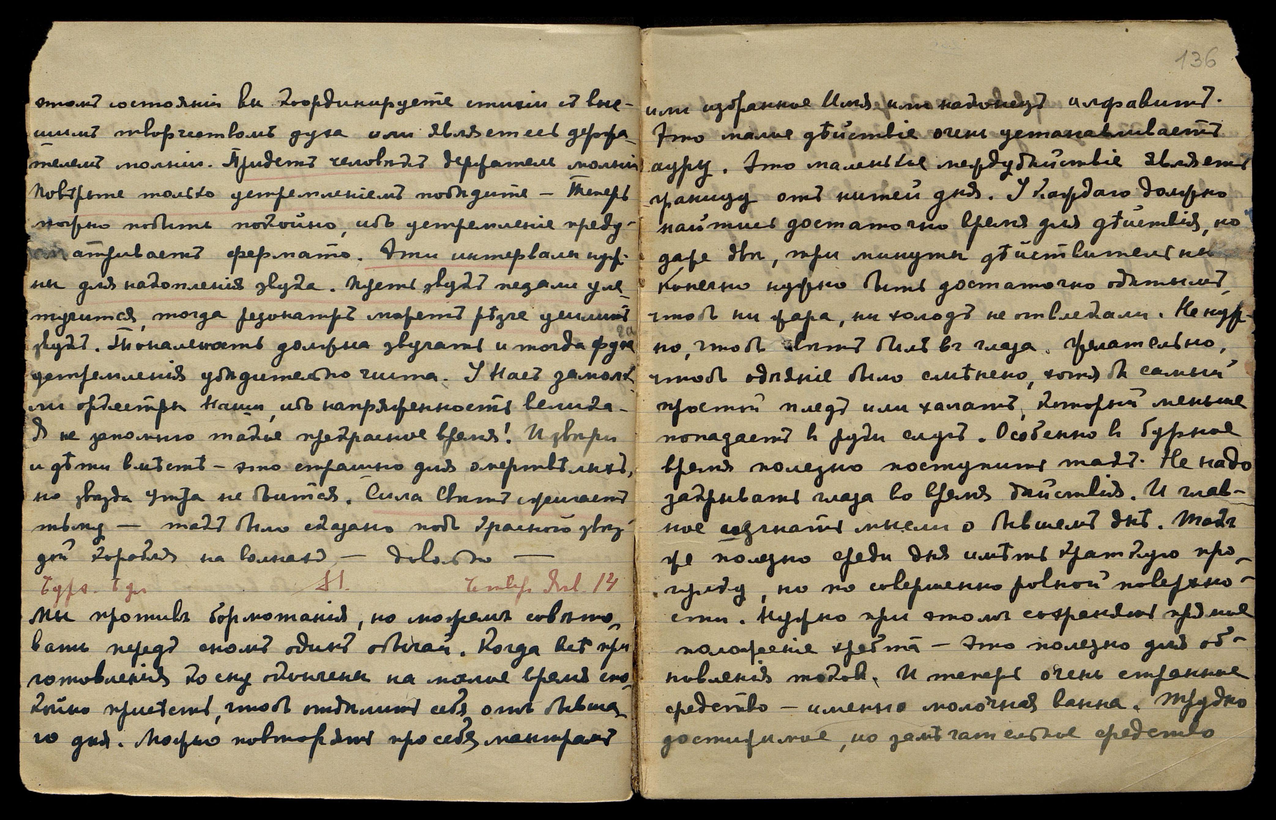 Всё-таки У[драе] придётся иметь малиновый кафтан. У[драя] может похожий на ламу иметь. Не нужно мешковатости. У[драя] легко может кафтан оторочить золотой тесьмой. Чую, как не только трудно, но и радостно будет. Завтра Советую не завидовать (Сёстрам), ибо Они идут на чёрную работу. Но быть в астрале среди людей нестерпимо.