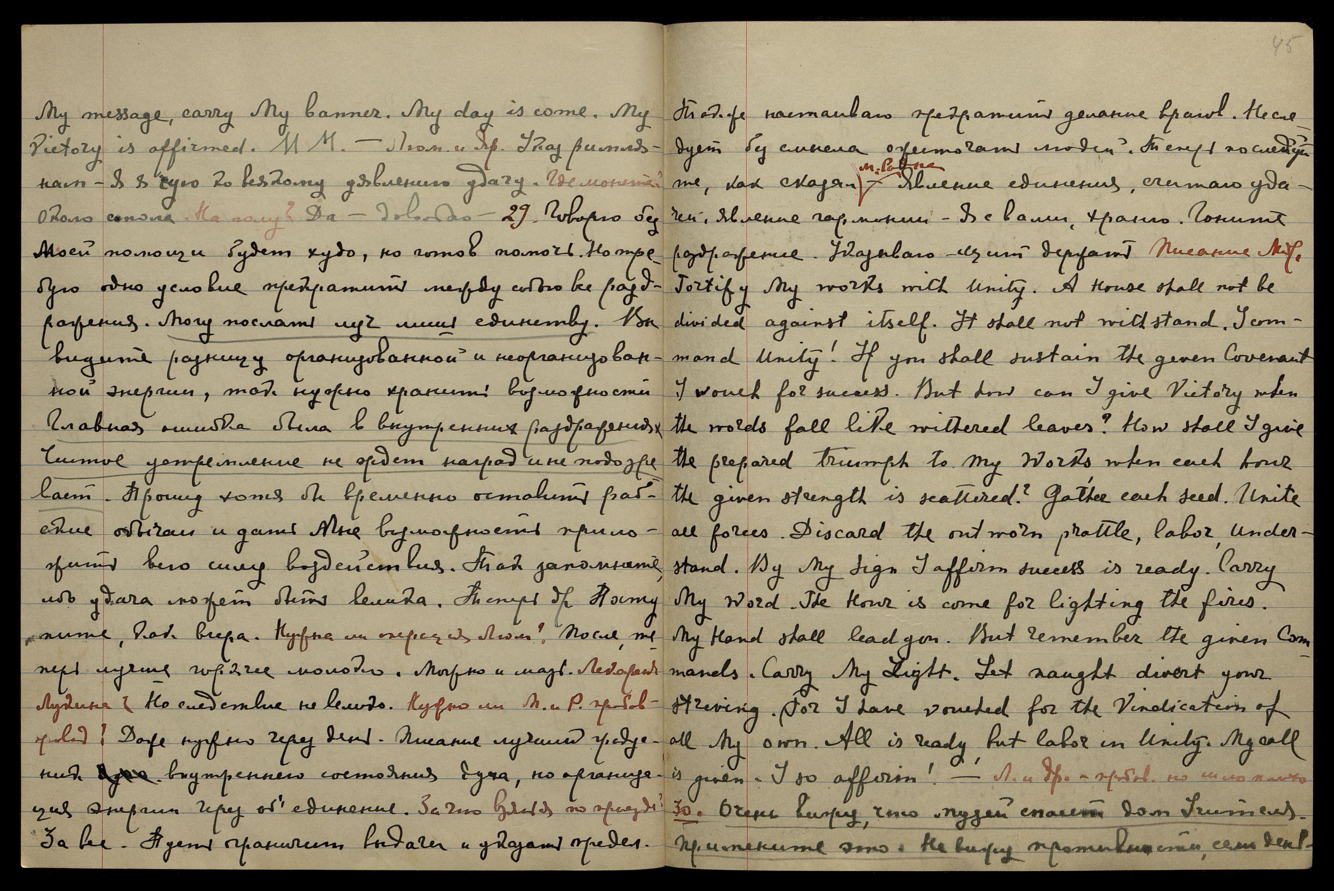 Модр[ы] Writings [англ.: писание]. M. Wings! Sword! Shield! All have I given you. Prepared is the way. Out of the space catch the Message of the Eternal fire. Out of the Infinite feel the great transmission of Light! Come is the hour for the transmission of the Truth! The forces of Eternity are pronouncing the battle of the last hour. Lift up your swords for righteousness. Gather the forces for My Host, because the day is not far hence. And the battle of the Elements shall be a mighty one. Gather and prepare! Wings, sword, shield! My strength be your guaranty. My seal is set upon the Victory. But raise up the sword and carry the shield. Glorify My hour! Pronounce