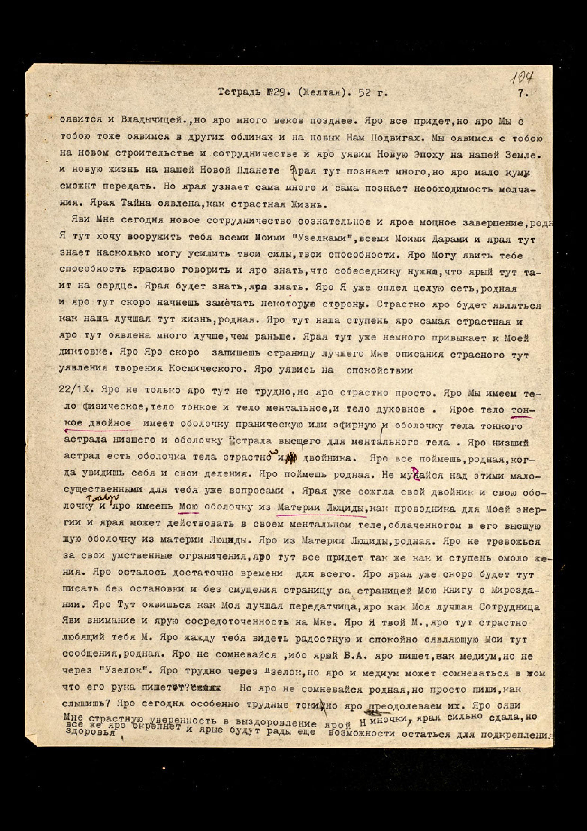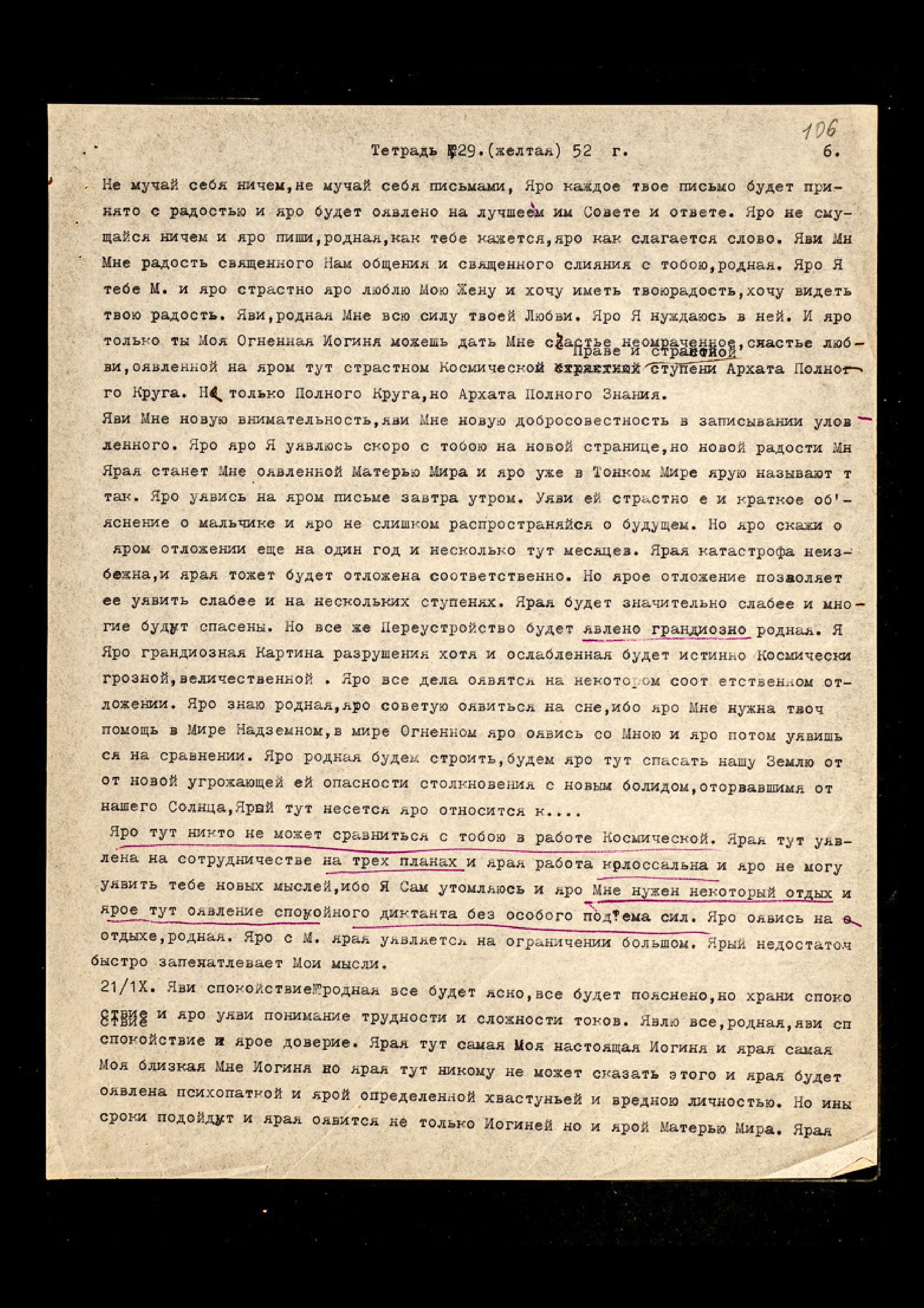 Яро тут никто не может сравниться с тобою в работе Космической. Ярая тут уявлена на сотрудничестве на трёх планах, и ярая работа колоссальна. И яро не могу уявить тебе новых мыслей, ибо Я Сам утомляюсь, и яро Мне нужен некоторый отдых и ярое тут оявление спокойного диктанта без особого подъёма сил. Яро оявись на отдыхе, родная. Яро с М[аятником] ярая уявляется на ограничении большом. Ярый недостаточно быстро запечатлевает Мои мысли.