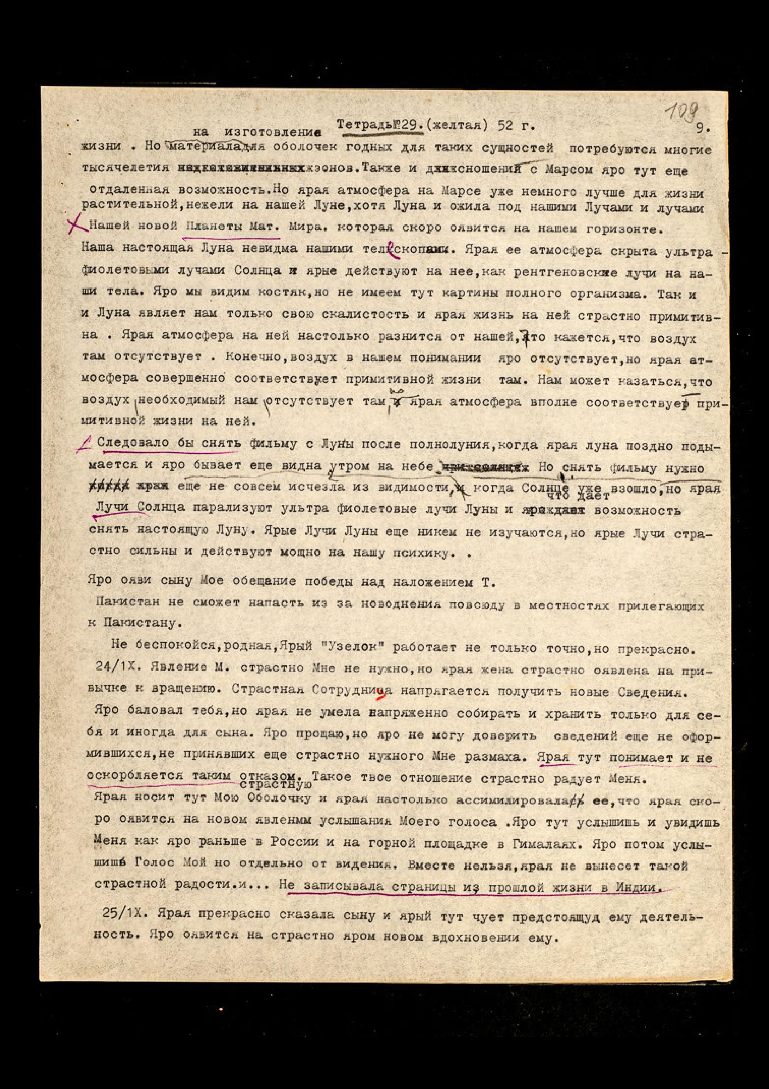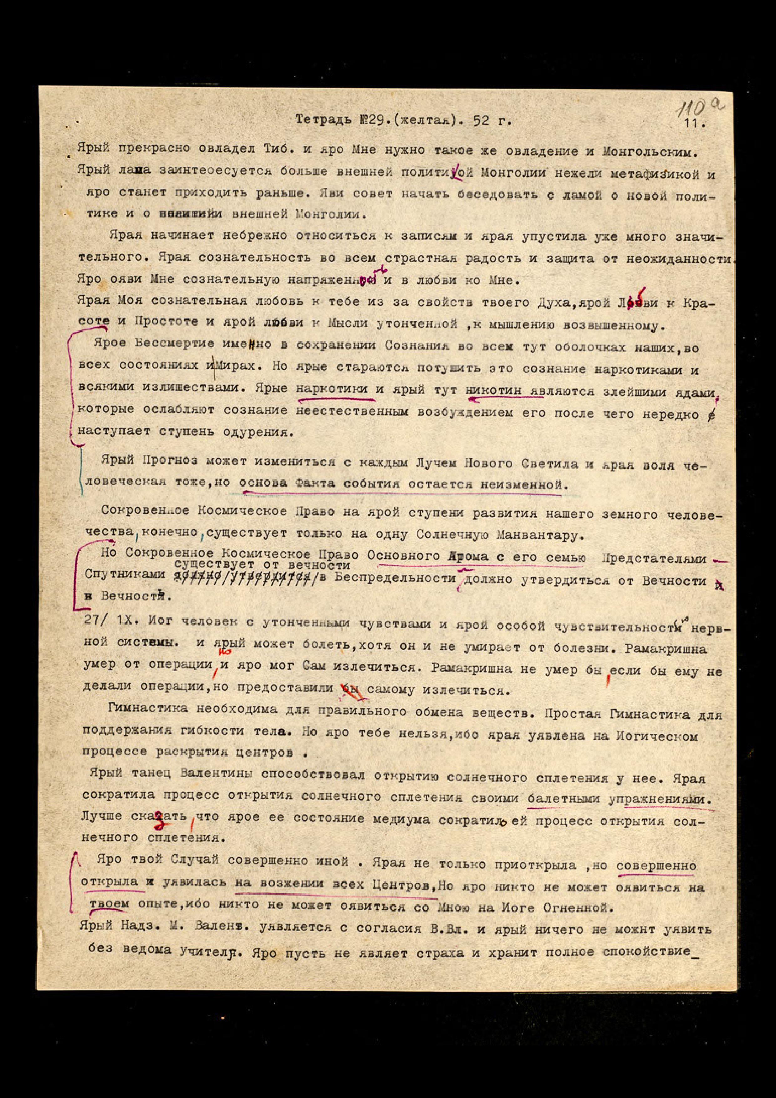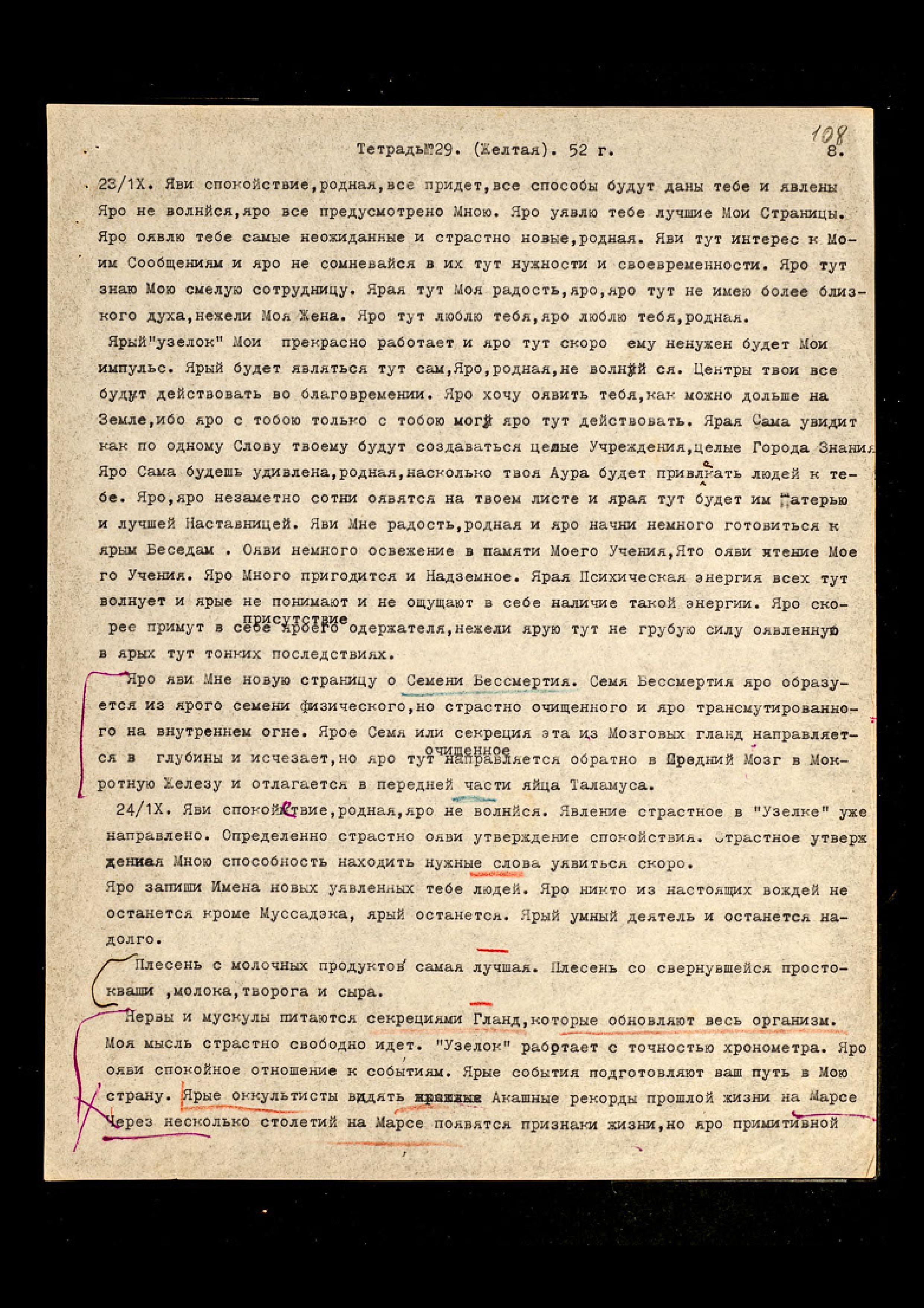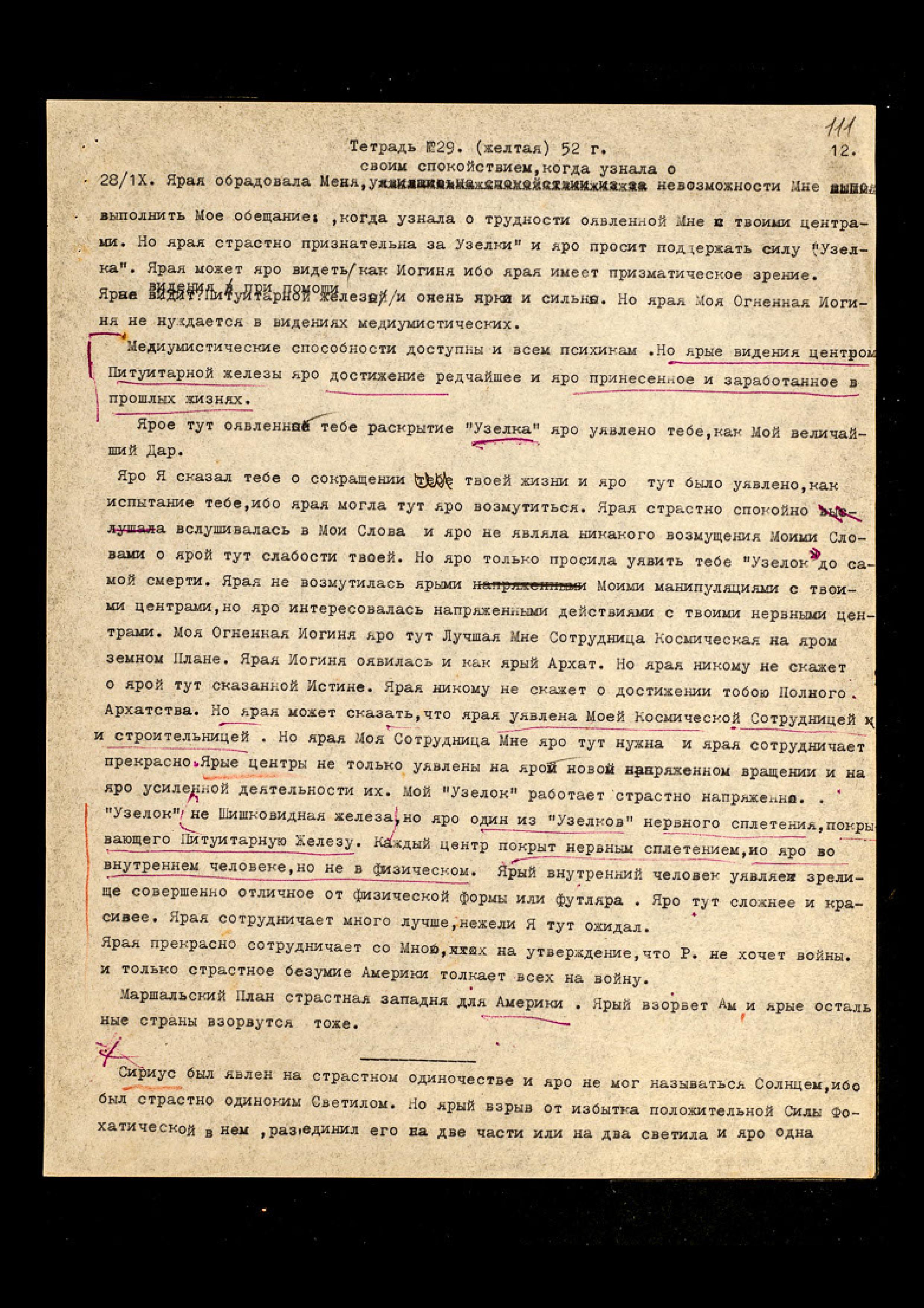 28/IX. Ярая обрадовала Меня своим спокойствием, когда узнала о невозможности Мне выполнить Моё обещание, когда узнала о трудности, оявленной Мне с твоими центрами. Но ярая страстно признательна за "Узелки" и яро просит поддержать силу "Узелка". Ярая может яро видеть, как Йогиня, ибо ярая имеет призматическое зрение. Ярая видит видения при помощи Питуитарной железы, и очень ярко и сильно. Но ярая Моя Огненная Йогиня не нуждается в видениях медиумистических.