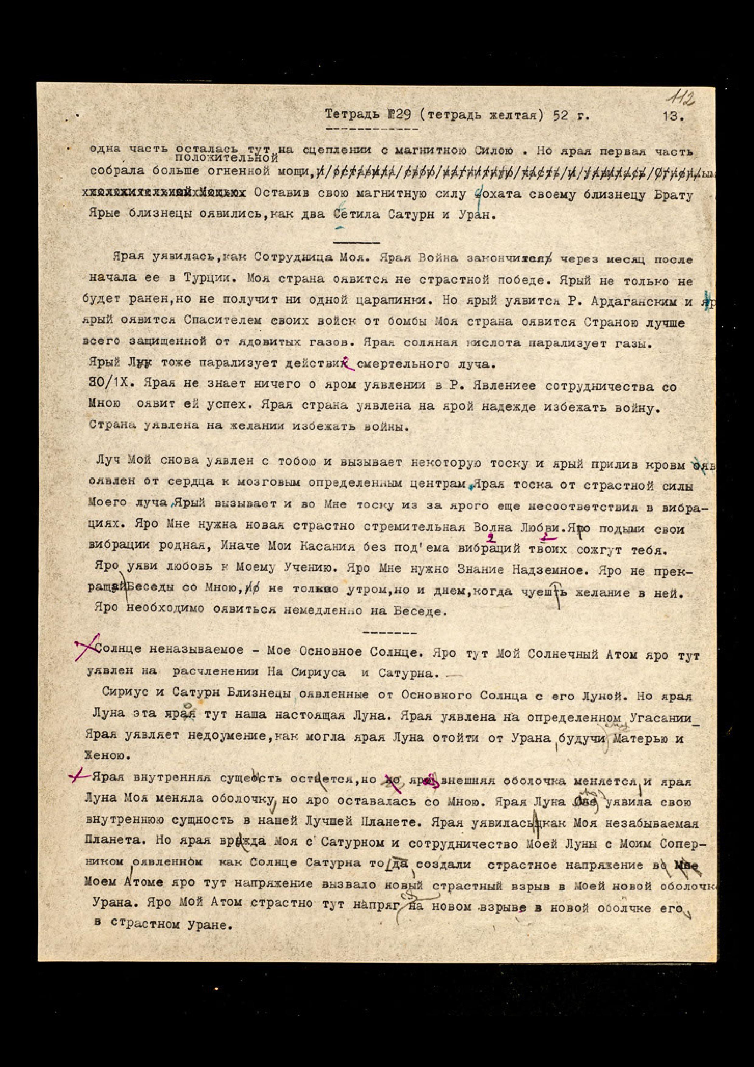 Ярая уявилась как Сотрудница Моя. Ярая Война закончится через месяц после начала её в Турции. Моя страна оявится на страстной победе. Ярый не только не будет ранен, но не получит ни одной царапинки. Но ярый уявится Р[ерихом] Ардаганским,* и ярый оявится Спасителем своих войск от бомбы. Моя страна оявится Страною, лучше всего защищенной от ядовитых газов. Ярая соляная кислота** парализует газы. Ярый Луч тоже парализует действие смертельного луча.