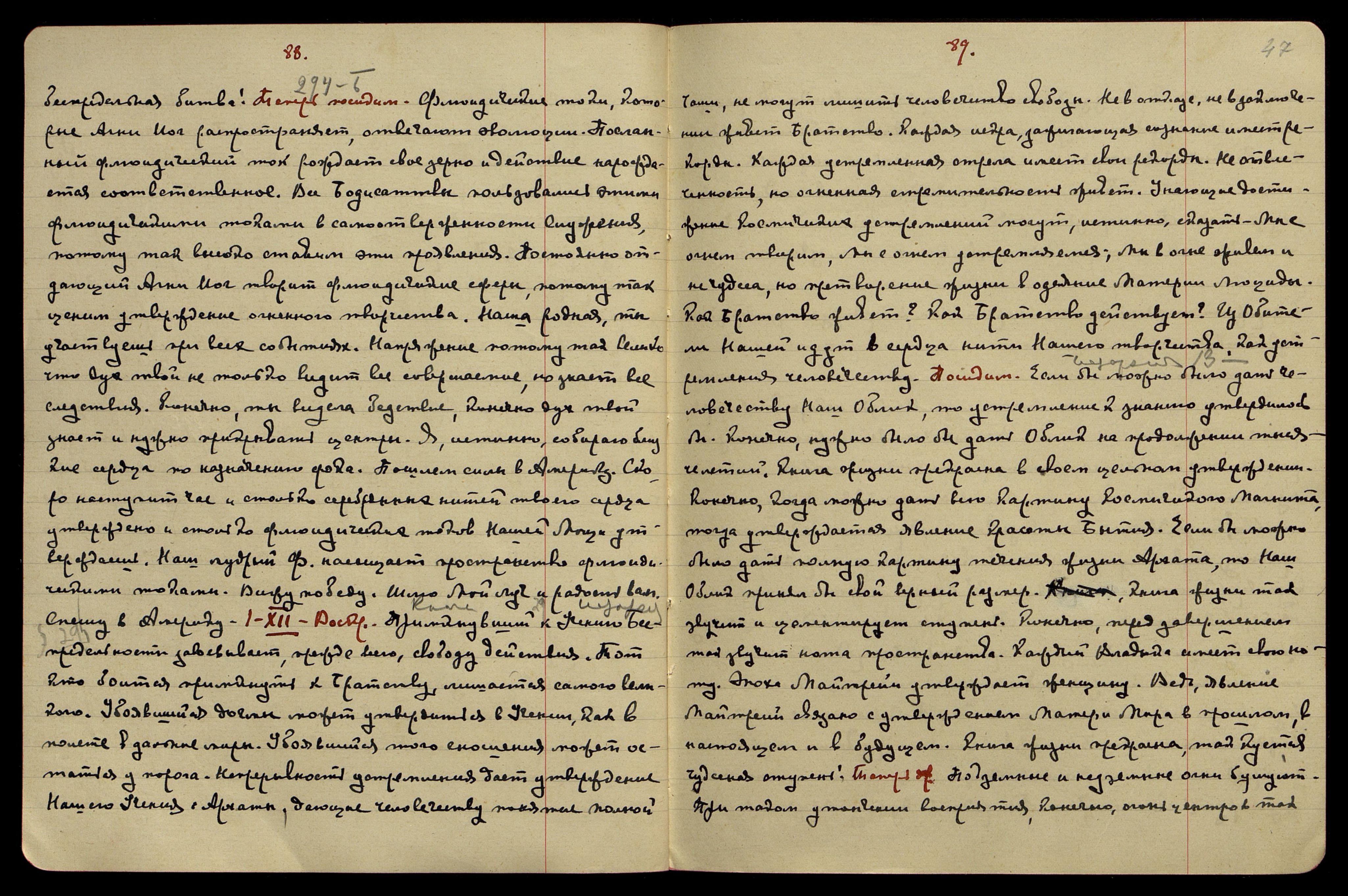 2-XII. Понед[ельник]. Б[еспредельность] § 295. В человечестве живёт несоизмеримое понятие реальности Космической, также понятие пустоты. Как может реальность относится к поверхности только? Когда явление боли вызывает судороги, то как же отрицать причину, вызвавшую эту боль? Как же не усмотреть реальность в утверждении всех проявлений? Сферы реальности нужно понять как сущее Космоса. Ведь нельзя строить Законы на несуществующем. Ведь, нужно принять в Беспредельности ту относительность, которая создает Наши понятия. Так сомкнём круг жизни вне понятия пустоты. Так реальность напрягает каждый миг Нашего Бытия! Посидим. Урусвати, позванная, утвержденная Наша Носительница Огня, ты истинно, трансмутируешь своим лучом. Ты радость духа утверждаешь, ты луч творчества Наш сиянием сердца украшаешь. Ты жизнь новую утвердила Поруме. Ты близким духам открыла путь к Нашим Башням. Ты сияние явила Наших Заветов. Так пусть Птичка Востока летит в радости. Твоё сердце говорит Нашим Сердцам. Пусть радость сияет в доме. Сам шлю Мой Луч. Можешь родная, утвердить, как мощь Нашу, твои огни! Можешь в радости ждать лучшую сокровенную ступень. Уготовим победу. Силу шлю Птичке Востока. Я вижу объединённые сердца, где будущее и прошлое сольются в сиянии Нашего утверждения. Так можно послать радостное послание в Америку. Как Наш мудрый Ф[уяма] творит, как Наш утвержденный Ф[уяма] насыщает пространство. Как много явлений успеха! Мы видим. Как много побед впереди. Истинно сказано − волшебный год. Да, да, да! Очень радуюсь приближению сокровенной ступени. Так закончим Нашим Лучом радости. Сказал.