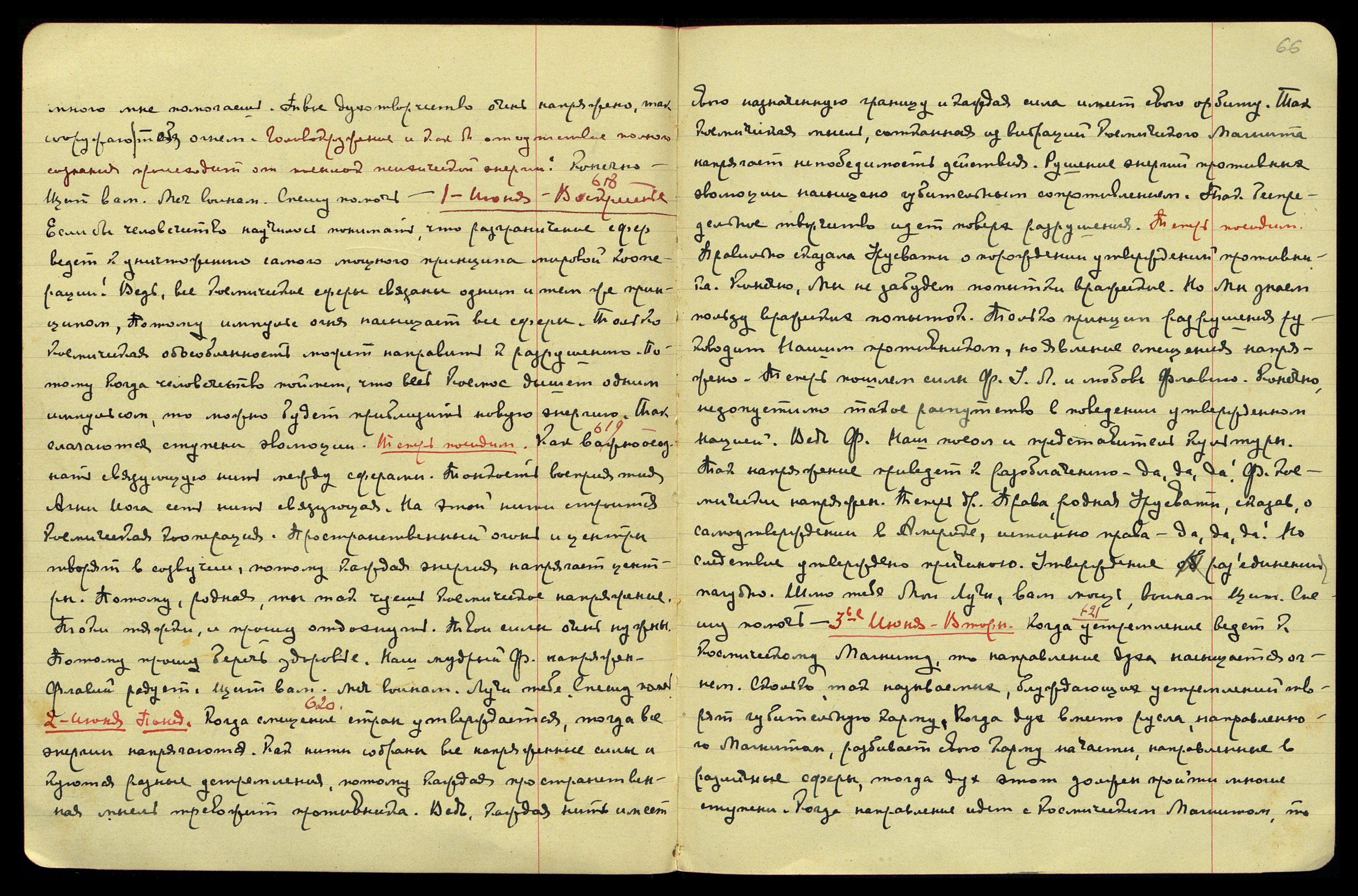 3-ье июня. Вторн[ик]. [Беспредельность] § 621. Когда устремление ведёт к Космическому Магниту, то направление духа насыщается огнём. Сколько так называемых блуждающих устремлений творят губительную карму. Когда дух вместо русла, направленного Магнитом, разбивает свою карму на части, направленные в различные сферы, тогда дух этот должен пройти многие ступени. Когда направление идёт с Космическим Магнитом, то
