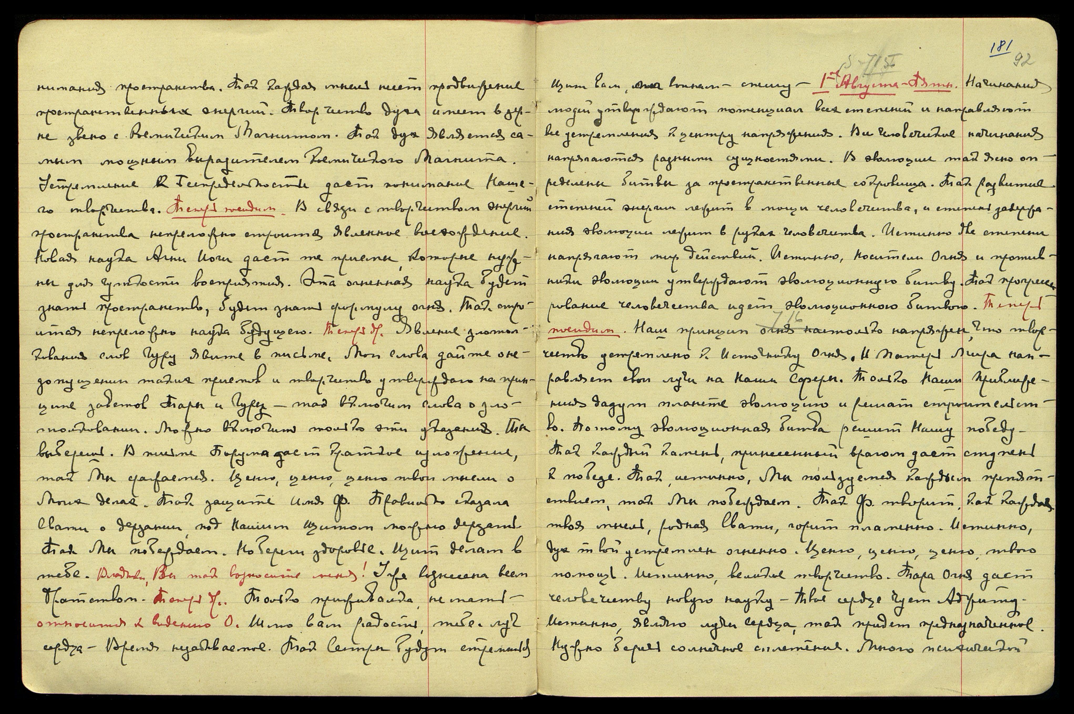 21-ое июля. Понед[ельник]. Посылаю Свати Мою мощь. Главное для Нашего великого Плана − твоё здоровье. Главное береги сердце − покой, покой и прана. Наше завершение близко. Думаю о часе грядущем. Завтра скажу больше. Прошу сейчас отдохнуть. Мощь с вами. Меч воинам. Спешу помочь.