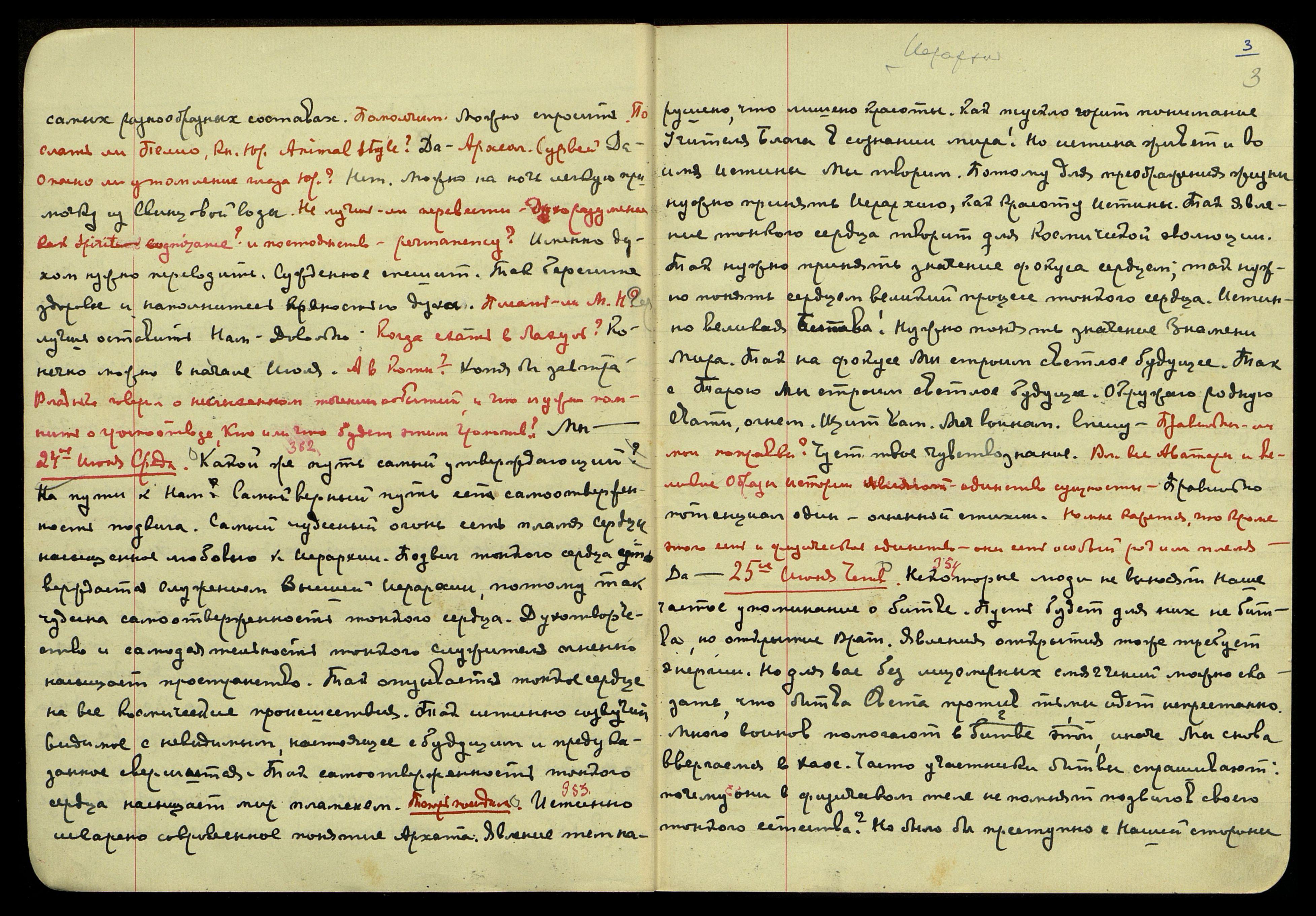 Название, датировка и формат оригинала на сайте ГМР: Записи бесед с Учителем. [серия «Учение»] Тетрадь 21 (Наггар «Урусвати») 1931.06.23 - 1932.02.25 автограф русский 141 Тетрадь «Vendel-Shakespeare» (Франция, Париж), форзац розовый