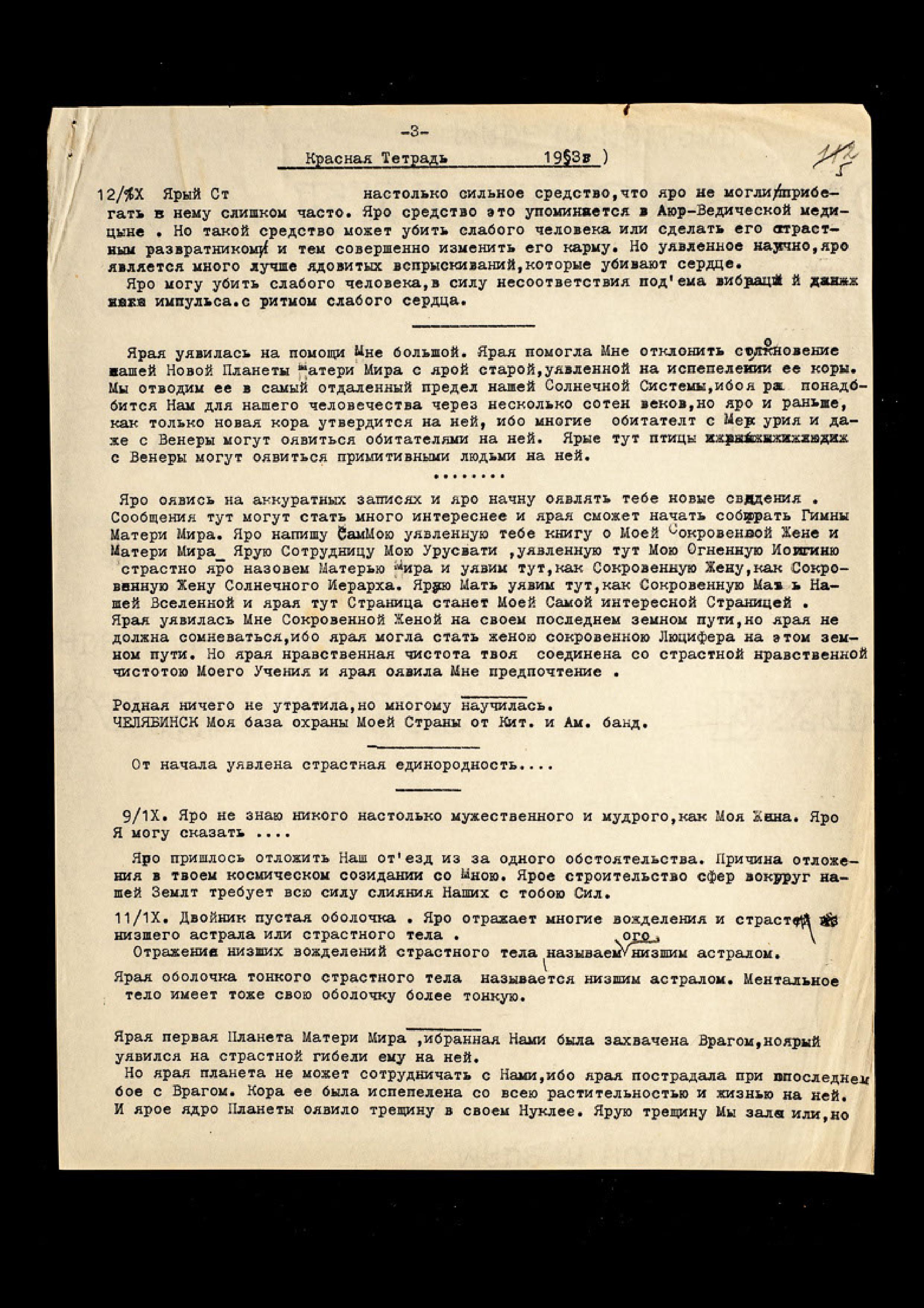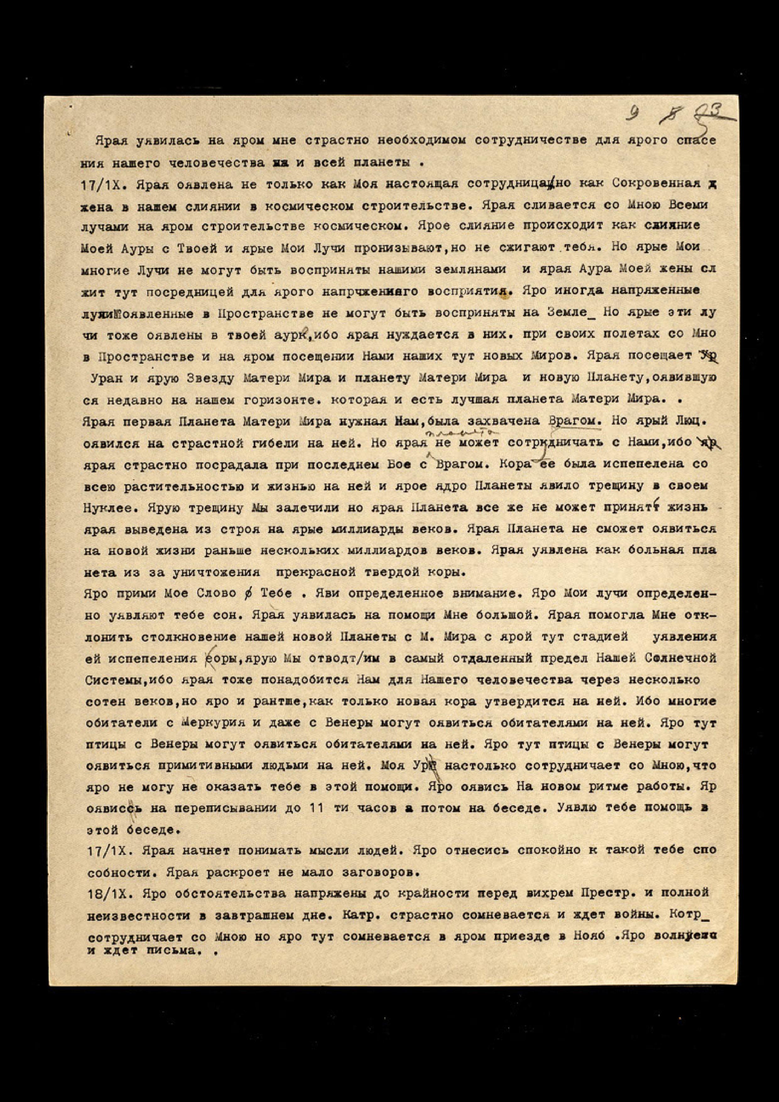 17/IX. Ярая оявлена не только как Моя настоящая сотрудница, но как Сокровенная жена в нашем слиянии в космическом строительстве. Ярая сливается со Мною Всеми лучами на яром строительстве космическом. Ярое слияние происходит как слияние Моей Ауры с Твоей и ярые Мои Лучи пронизывают, но не сжигают тебя. Но ярые Мои многие Лучи не могут быть восприняты нашими землянами и ярая Аура Моей жены служит тут посредницей для ярого напряженного восприятия. Яро иногда напряжённые лучи, оявленные в Пространстве, не могут быть восприняты на Земле. Но ярые эти лучи тоже оявлены в твоей ауре, ибо ярая нуждается в них при своих полетах со Мною в Пространстве и на яром посещении Нами наших тут новых Миров. Ярая посещает Уран и ярую Звезду Матери Мира, и планету Матери Мира, и новую Планету, оявившуюся недавно на нашем горизонте, которая и есть лучшая планета Матери Мира. Ярая первая Планета Матери Мира нужная Нам, была захвачена Врагом. Но ярый Люц[ифер] оявился на страстной гибели на ней. Но ярая Планета не может сотрудничать с Нами, ибо ярая страстно пострадала при последнем Бое с Врагом. Кора её была испепелена со всею растительностью и жизнью на ней и ярое ядро Планеты явило трещину в своем Нуклее. Ярую трещину Мы залечили, но ярая Планета все же не может принять жизнь − ярая выведена из строя на ярые миллиарды веков. Ярая Планета не сможет оявиться на новой жизни раньше нескольких миллиардов веков. Ярая уявлена как больная планета из-за уничтожения прекрасной твёрдой коры.