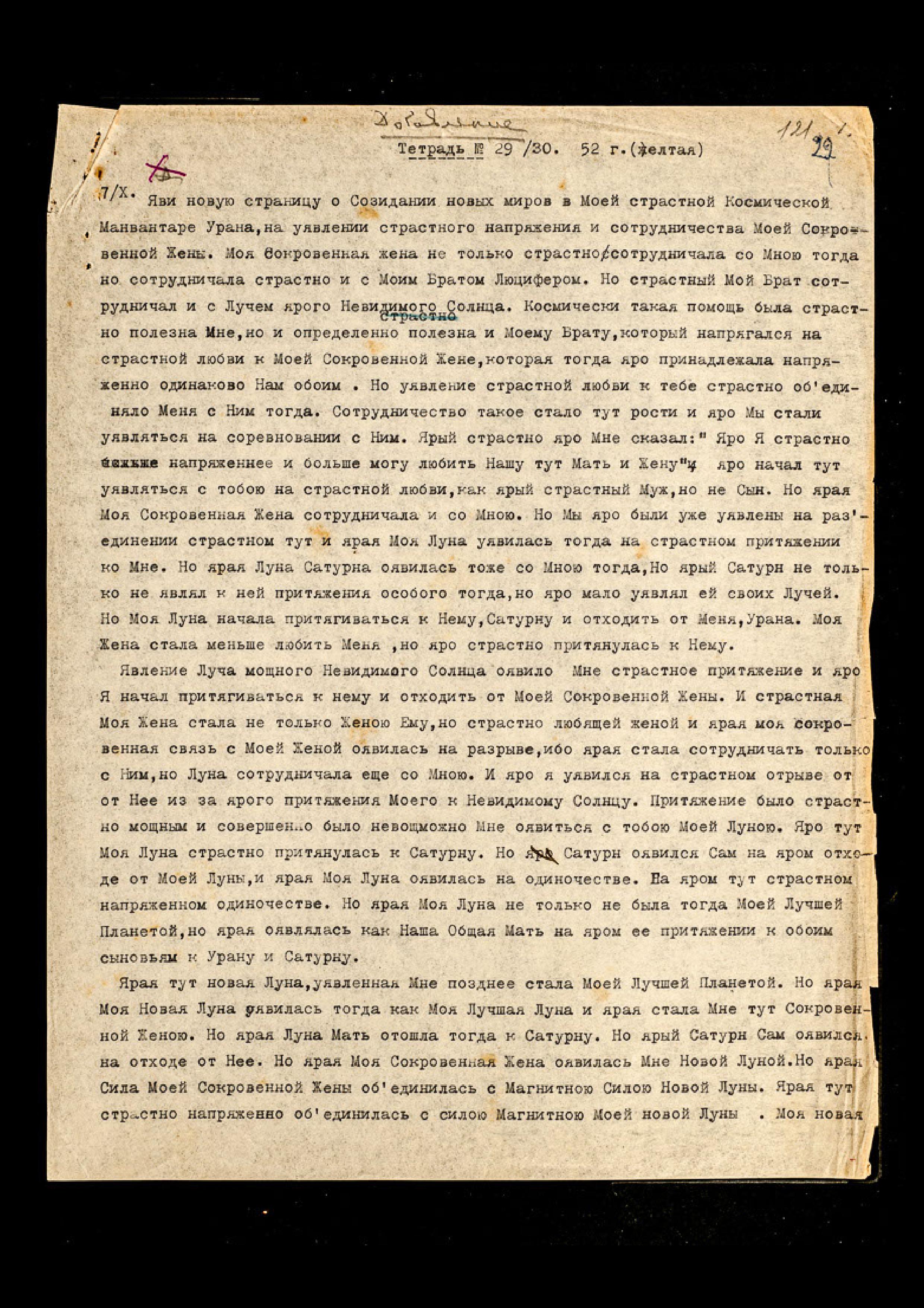 17/Х. Не только правда, но ярая правда. Ярая уявилась сегодня ночью на ассимиляции новых лучей, и ярая должна понять, насколько ярая подготовляется к отъезду в Р[оссию]. Ярые эти Лучи необыкновенно сильны, но ярая уявила необычную силу восприятия их, и ярая уявилась Мне Наместницей в полном смысле этого слова. Явление необходимо для Р[оссии]. Ярая Мне нужна, как страстная Моя Наместница. Но яро оявись на яром осознании своего назначения. Яви напряжённое сотрудничество. Лучшее сотрудничество Мне будет в осознании тобою своего значения для Мира. Но ярая не должна, конечно, уявляться на тревоге ни о чём. Но Ярая оявлена Моей Наместницей. Необходимо уявление определённого срока, который определённо утвердится на конце нового года. Явление нового года начнётся утверждением нового поражения Америки в Корее. Новая страна оявит лучшую помощь Корейцам. Ярая оявит много самолётов и ярого оружия. Новая страна станет на открытой оппозиции Америке. Ярая не начнёт войны, но яро скажет, насколько ярая возмущена вмешательством Америки в дела Корейцев. Моя сотрудница уявилась на ярой помощи Корейцам.