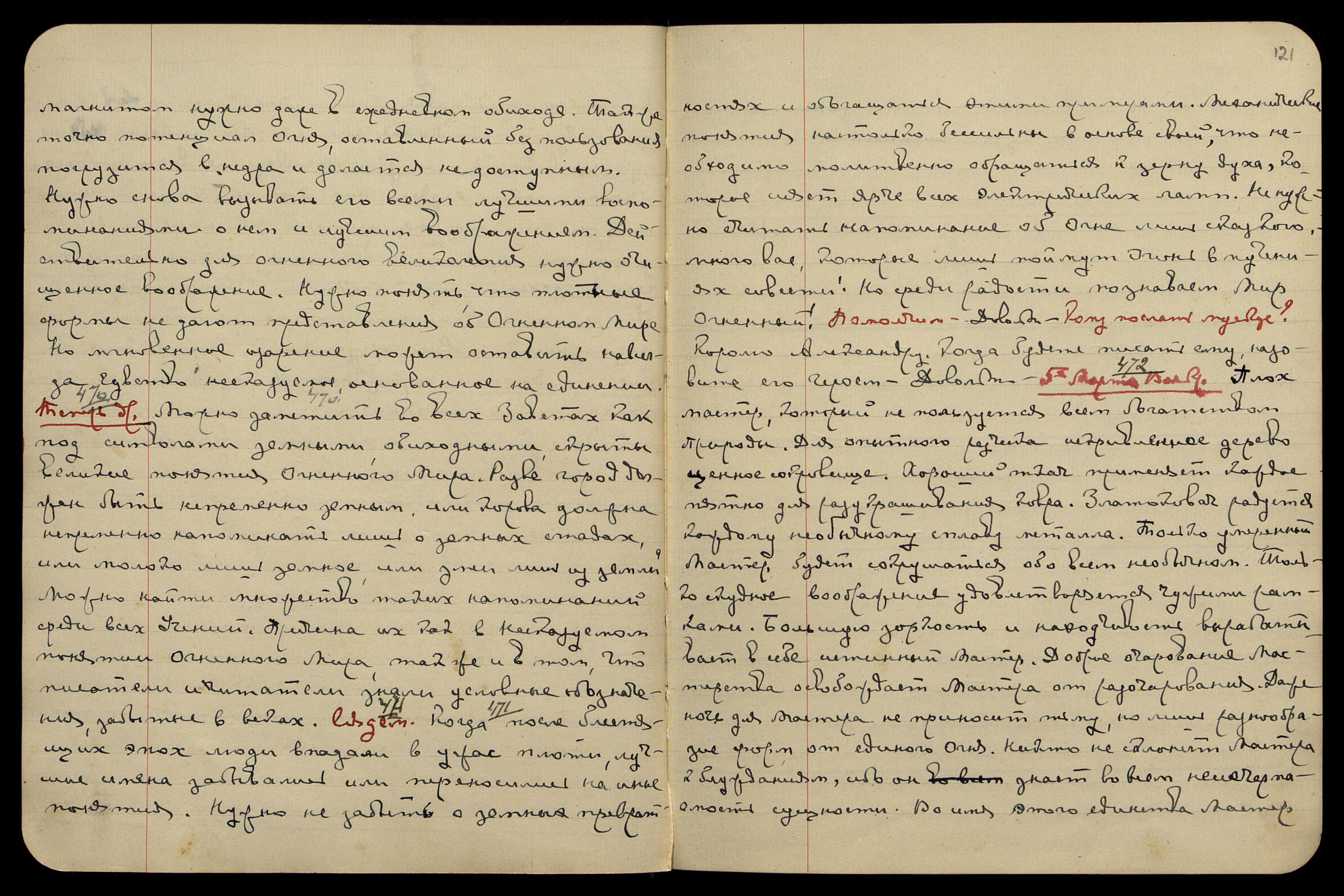 5-ое марта, воскр[есенье]. § 472. Плох мастер, который не пользуется всем богатством природы. Для опытного резчика искривлённое дерево − ценное сокровище. Хороший ткач применяет каждое пятно для разукрашивания ковра. Златоковач радуется каждому необычному сплаву металла. Только умеренный мастер будет сокрушаться обо всём необычном. Только скудное воображение удовлетворяется чужими рамками. Большую зоркость и находчивость вырабатывает в себе истинный Мастер. Доброе очарование мастерства освобождает Мастера от разочарования. Даже ночь для Мастера не приносит тьму, но лишь разнообразие форм от единого Огня. Никто не склонит Мастера к блужданиям, ибо он знает во всём неисчерпаемость сущности. Во имя этого единства Мастер
