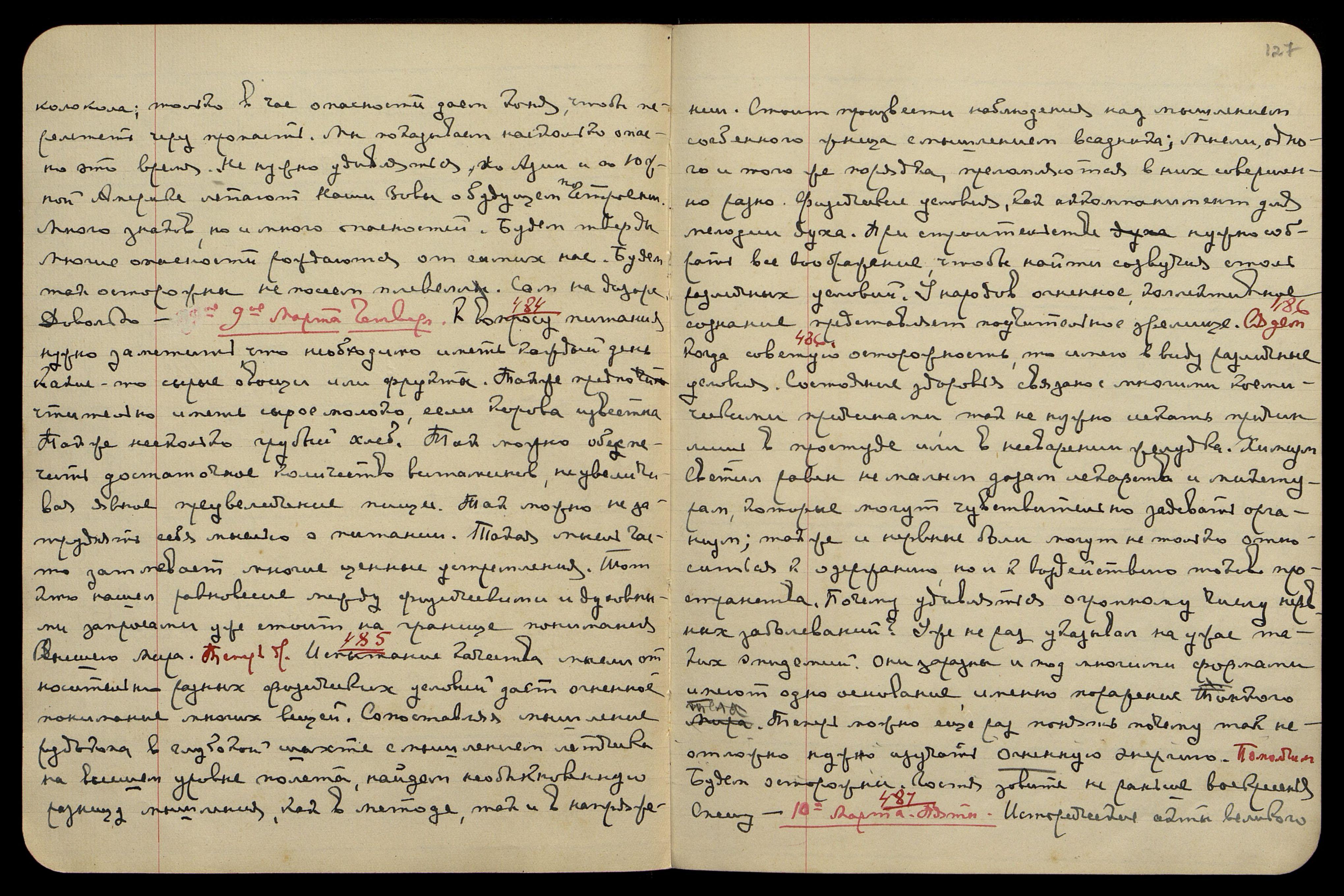 9-ое марта, четверг. § 484. К вопросу питания нужно заметить, что необходимо иметь каждый день какие-то сырые овощи или фрукты. Также предпочтительно иметь сырое молоко, если корова известна. Также несколько грубый хлеб. Так можно обеспечить достаточное количество витаминов, не увеличивая явное преувеличения пищи. Так можно не затруднять себя мыслью о питании. Такая мысль часто затмевает многие ценные устремления. Тот, кто нашёл равновесие между физическими и духовными запросами, уже стоит на границе понимания Высшего Мира. Теперь др[угое]. § 485. Испытание качества мысли относительно разных физических условий даст огненное понимание многих вещей. Сопоставляя мышление рудокопа в глубокой шахте с мышлением лётчика на высшем уровне полёта, найдём необыкновенную разницу мышления, как в методе, так и в напряжении. Стоит произвести наблюдения над мышлением согбенного жнеца с мышлением всадника; мысли одного и того же порядка преломляются в них совершенно разно. Физические условия − как аккомпанемент для мелодии духа. При строительстве нужно собрать всё воображение, чтобы найти созвучия столь различных условий. У народов огненное коллективное сознание представляет поучительное зрелище. Сядем. § 486. Когда советую осторожность, то имею в виду различные условия. Состояние здоровья связано со многими космическими причинами, так не нужно искать причин лишь в простуде или в несварении желудка. Химизм Светил равен немалым дозам лекарства и микстур, которые могут чувствительно задевать организм; также и нервные боли могут не только относиться к одержанию, но и к воздействию токов пространства. Почему удивляться огромному числу нервных заболеваний? Уже не раз указывал на ужас таких эпидемий. Они заразны и под многими формами имеют одно основание, именно − поражение тонкого тела. Теперь можно ещё раз понять, почему так неотложно нужно изучать Огненную Энергию. Помолчим. Будем осторожны. Гостя зовите не раньше воскресенья. Спешу.