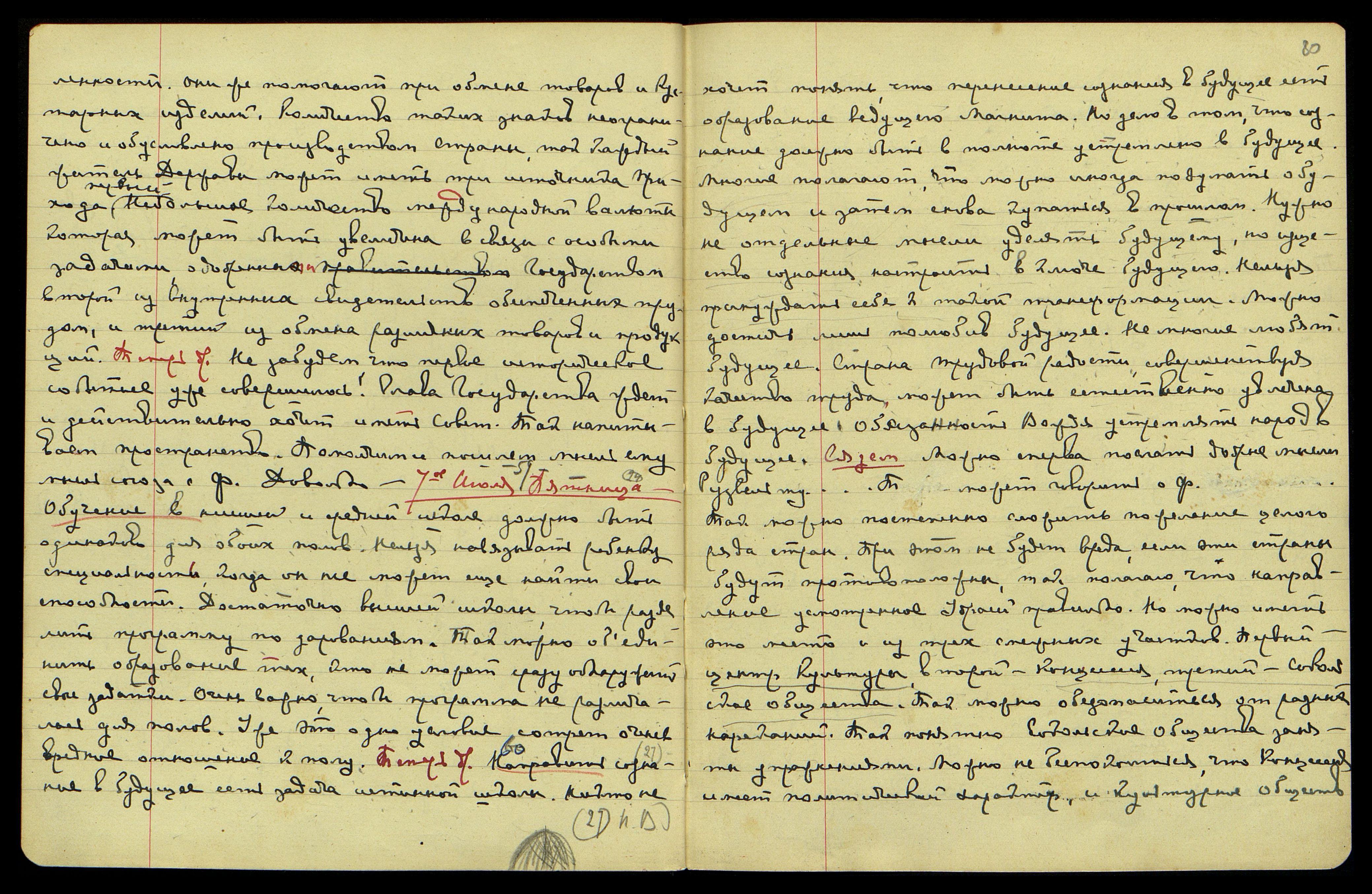 7-ое июля, пятница. § 59. [Напутствие Вождю,] § 24. Обучение в низшей и средней школе должно быть одинаково для обоих полов. Нельзя навязывать ребёнку специальность, когда он не может ещё найти свои способности. Достаточно высшей школы, чтобы разделить программу по дарованиям. Так можно объединить образование тех, кто не может сразу обнаружить свои задатки. Очень важно, чтобы программа не различалась для полов. Уже это одно условие сотрёт очень вредное отношение к полу. Теперь др[угое]. § 60. [Напутствие Вождю,] § 27. Направить сознание в будущее есть задача истинной школы. Никто не хочет понять, что перенесение сознания в будущее есть образование ведущего Магнита. Но дело в том, что сознание должно быть в полноте устремлено в будущее. Многие полагают, что можно иногда подумать о будущем и затем снова купаться в прошлом. Нужно не отдельные мысли уделять будущему, но существо сознания настроить в ключе будущего. Нельзя принуждать себя к такой трансформации. Можно достичь, лишь полюбив будущее. Не многие любят будущее. Страна трудовой радости, совершенствуя качество труда, может быть естественно увлечена в будущее. Обязанность Вождя устремлять народ в будущее. Сядем. Можно сперва послать добрые мысли Рузвельту... Т[аубе] может говорить о Ф[уяме Германии]. Так можно постепенно сложить пожелание целого ряда стран. При этом не будет вреда, если эти страны будут противоположны. Так, полагаю, что направление, усмотренное Удраей, правильно. Но можно иметь это место и из трёх смежных участков. Первый − центр Культуры; второй − Концессия, третий − Сокольские Общества. Так можно обезопаситься от разных нареканий. Так, понятно, Сокольские Общества заняты упражнениями. Можно не беспокоиться, что Концессия имеет политический характер, и Культурное Общество
