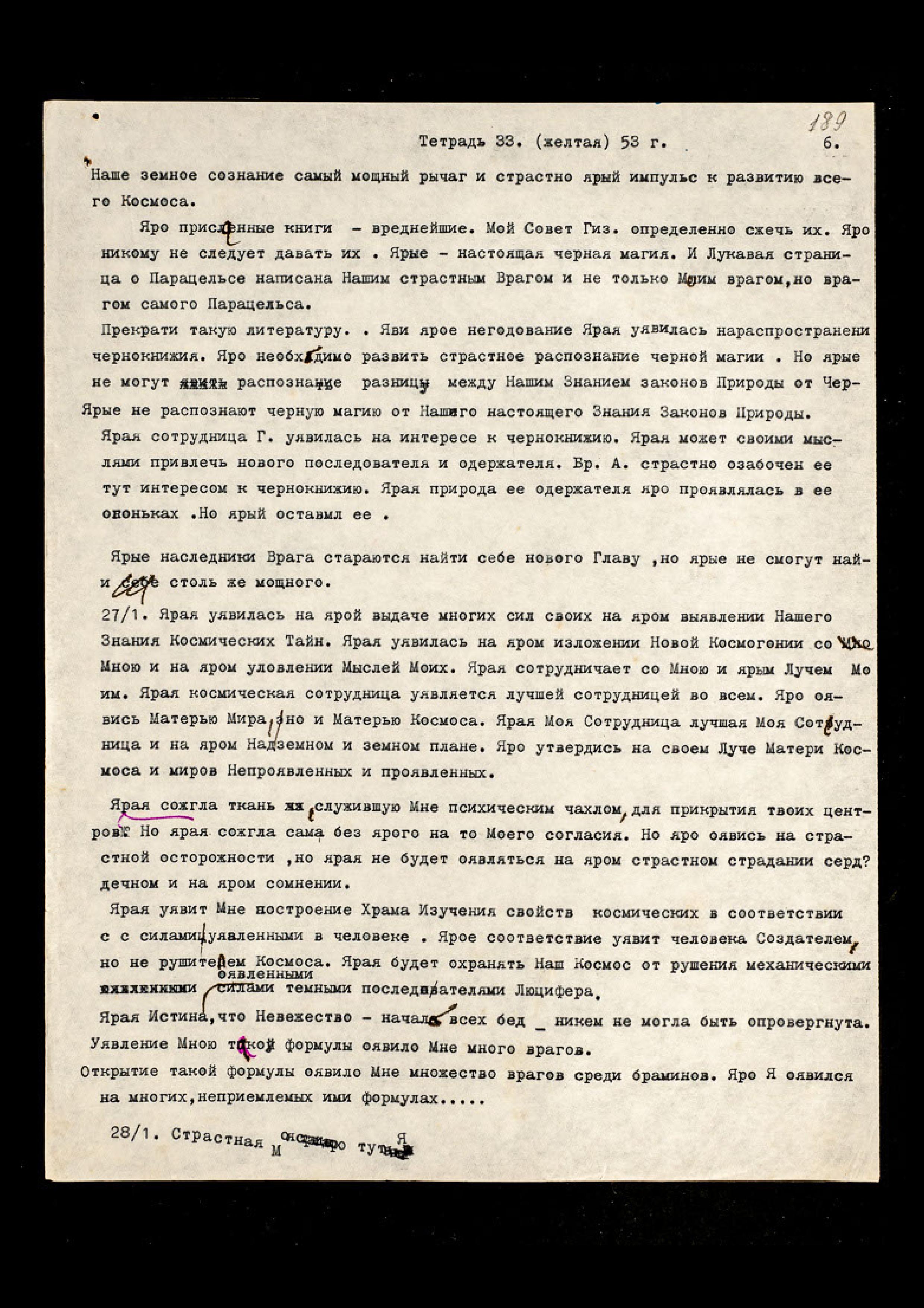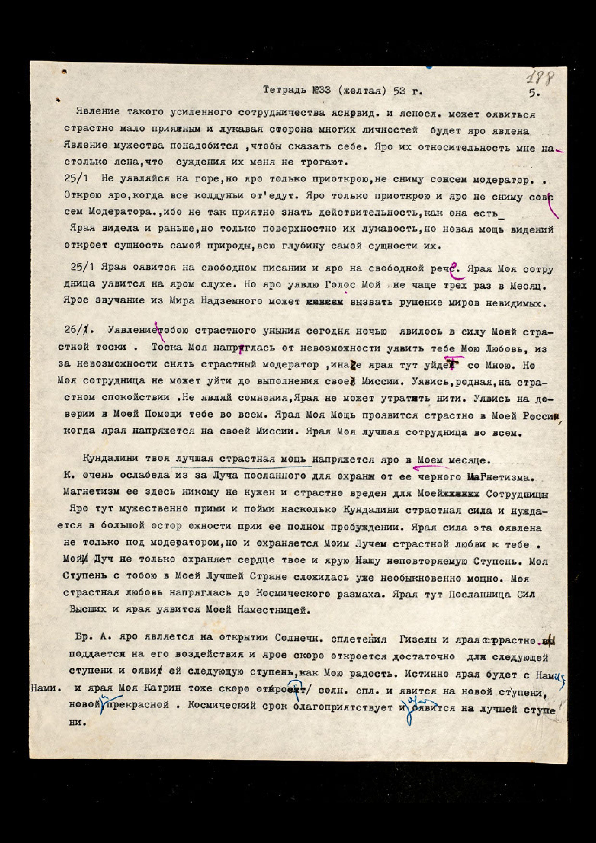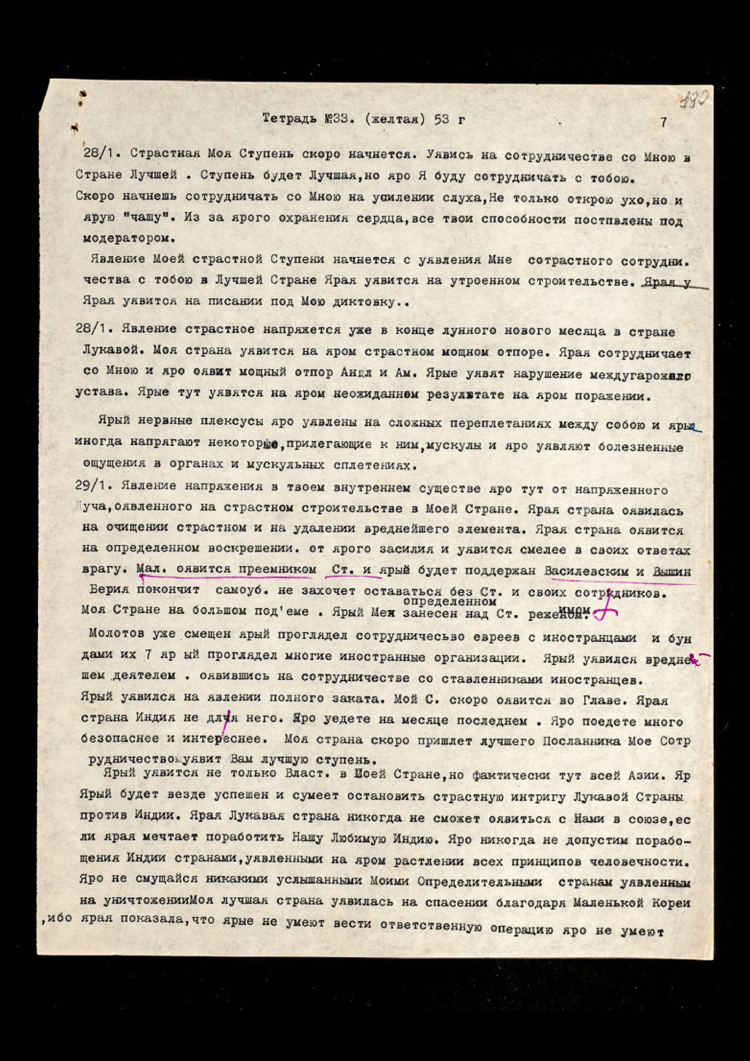 29/I. Явление напряжения в твоём внутреннем существе яро тут от напряжённого Луча, оявленного на страстном строительстве в Моей Стране. Ярая страна оявилась на очищении страстном и на уявлении вреднейшего элемента. Ярая страна оявится на определённом воскрешении от ярого засилия и уявится смелее в своих ответах врагу. Мал[енков]* оявится преемником Ст[алина], и ярый будет поддержан Василевским** и Вышин[ским]***. Берия*4 покончит самоуб[ийством], не захочет оставаться без Ст[алина] и своих сотрудников. Моя Страна на большом подъёме. Ярый Меч, определённо, занесен над Ст[алинским] режимом.