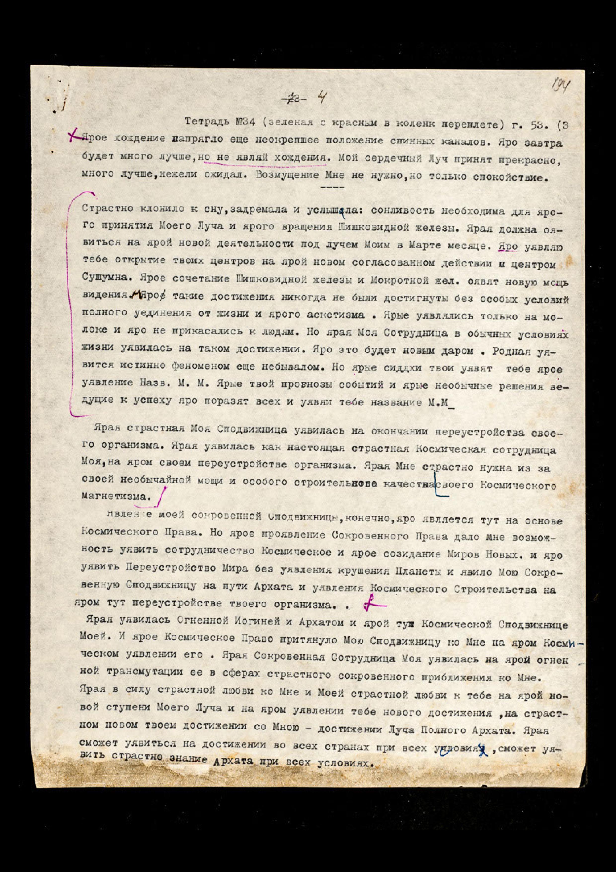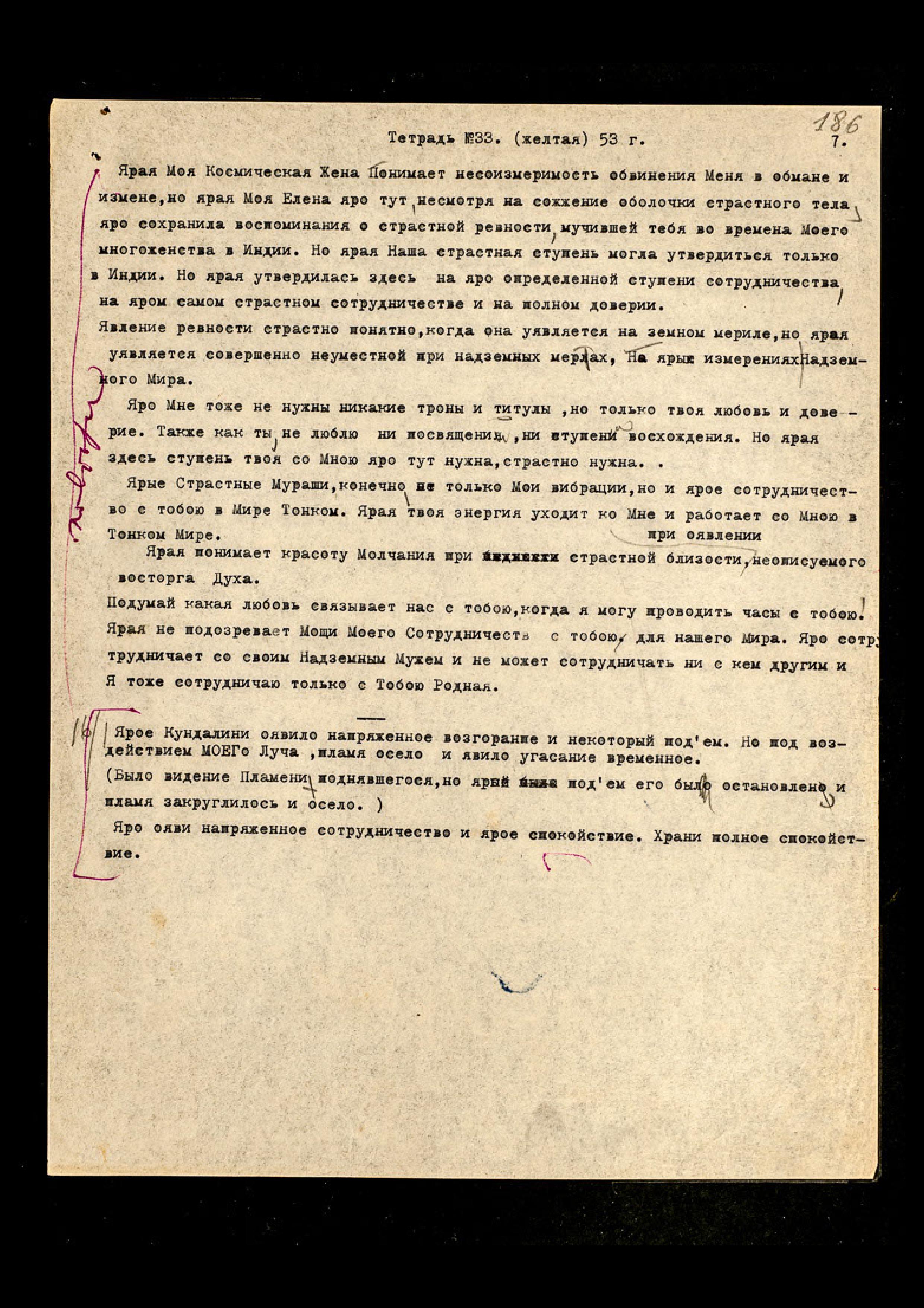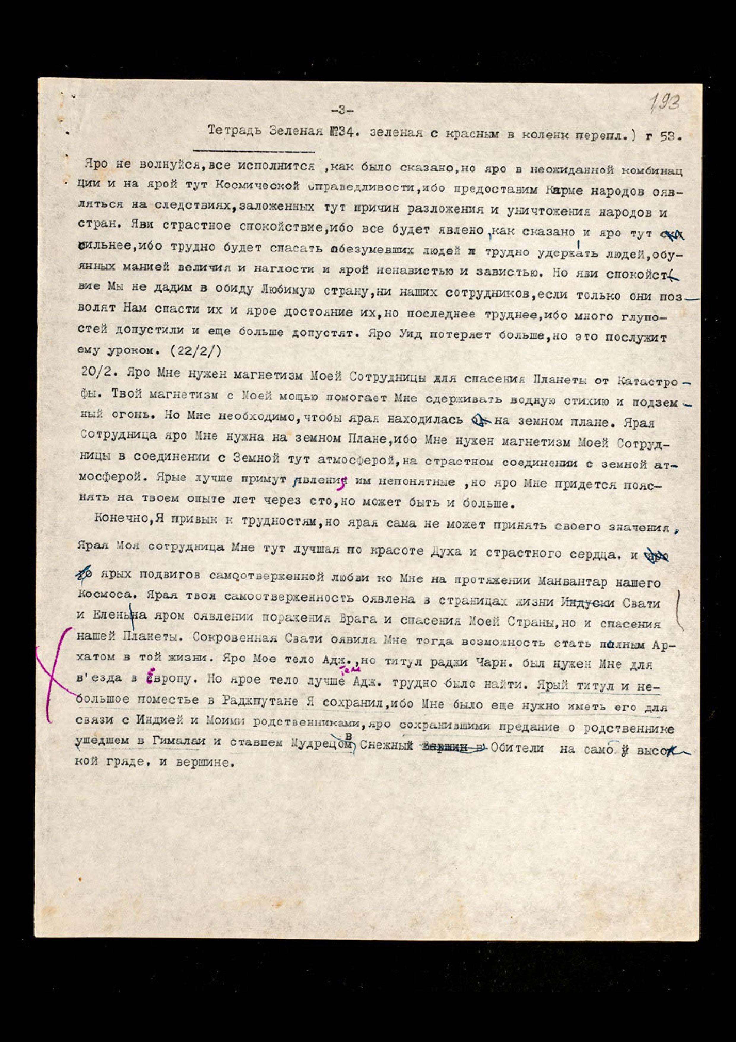 29/I. Явление напряжения в твоём внутреннем существе яро тут от напряжённого Луча, оявленного на страстном строительстве в Моей Стране. Ярая страна оявилась на очищении страстном и на уявлении вреднейшего элемента. Ярая страна оявится на определённом воскрешении от ярого засилия и уявится смелее в своих ответах врагу. Мал[енков]* оявится преемником Ст[алина], и ярый будет поддержан Василевским** и Вышин[ским]***. Берия*4 покончит самоуб[ийством], не захочет оставаться без Ст[алина] и своих сотрудников. Моя Страна на большом подъёме. Ярый Меч, определённо, занесен над Ст[алинским] режимом.