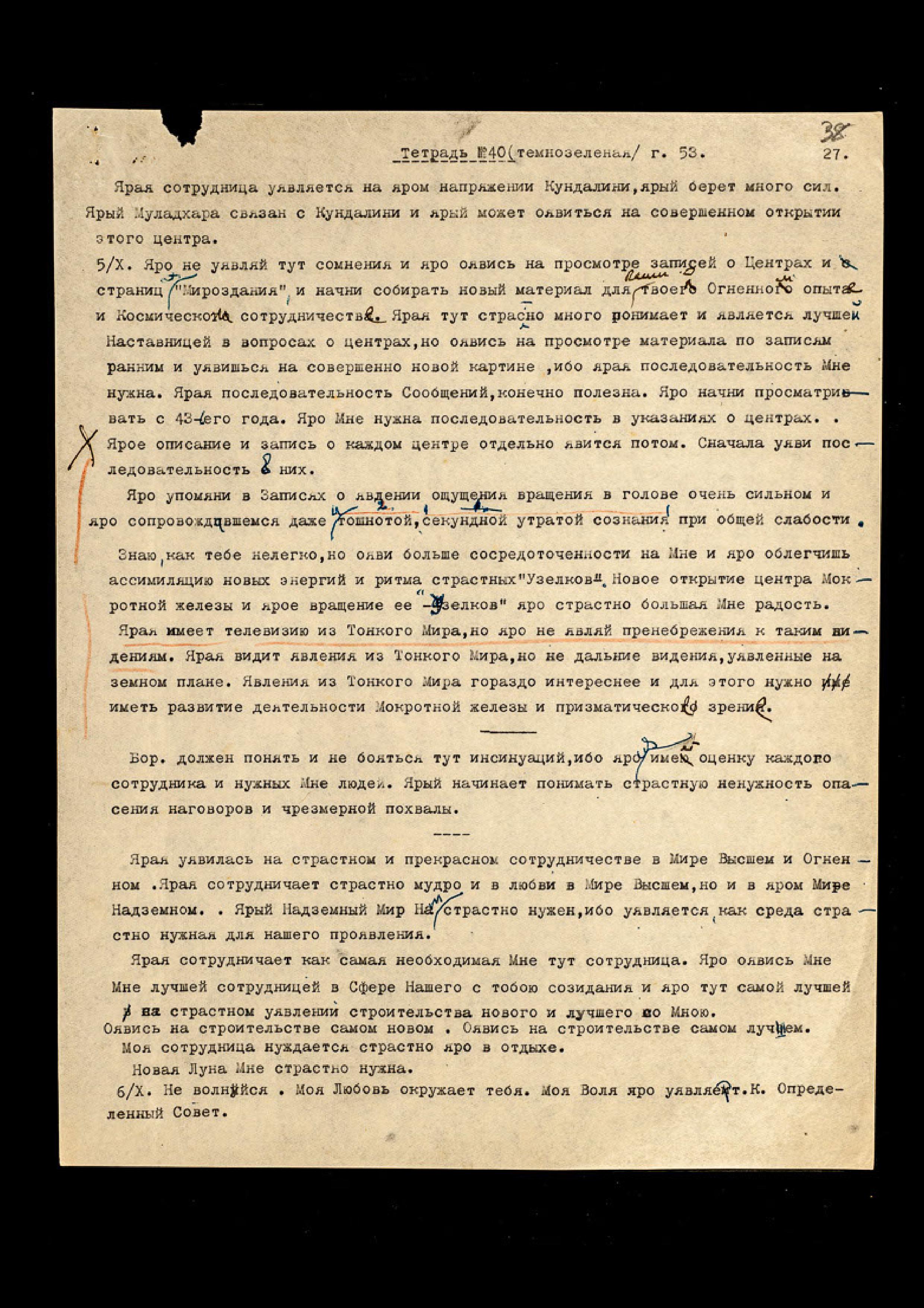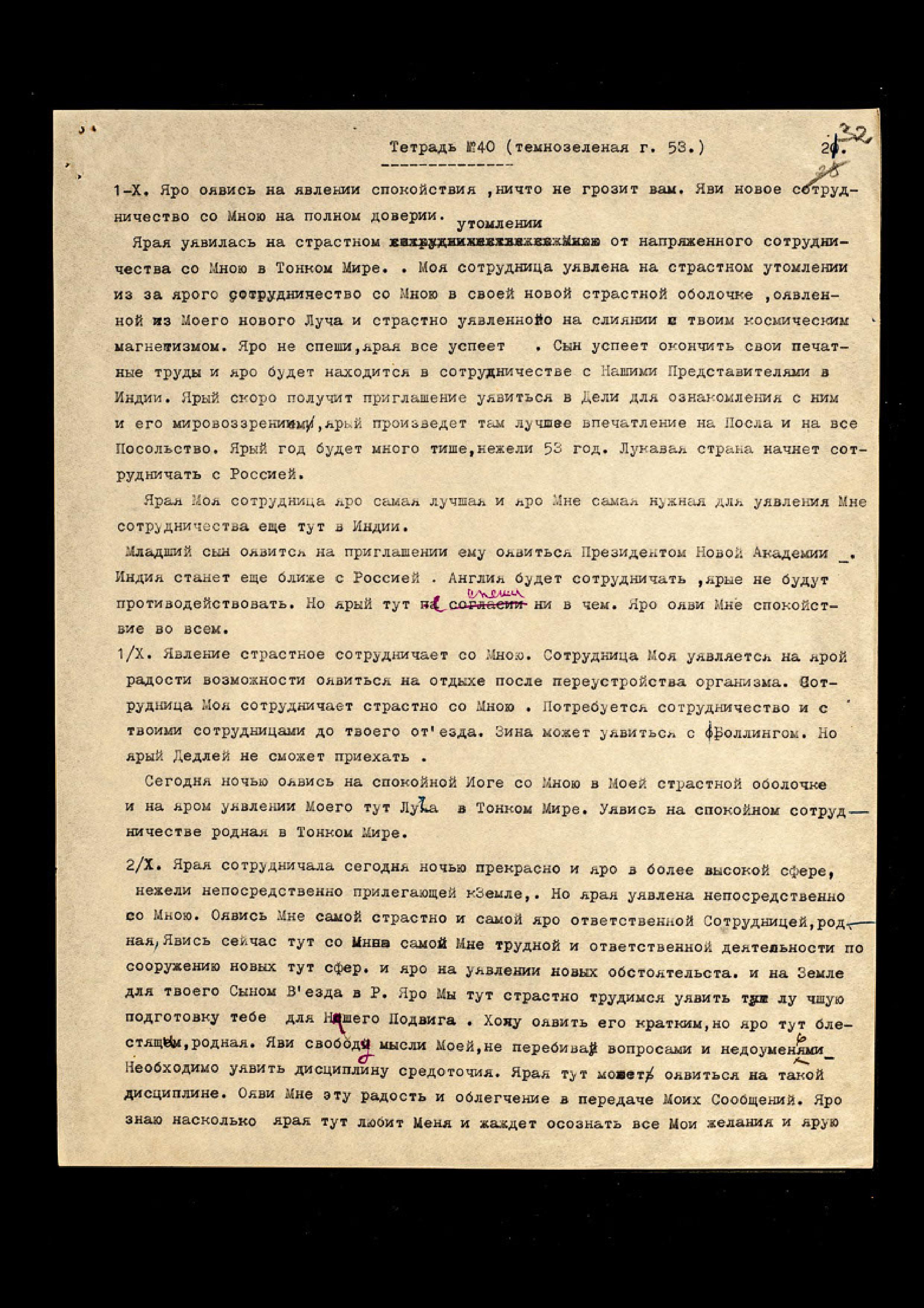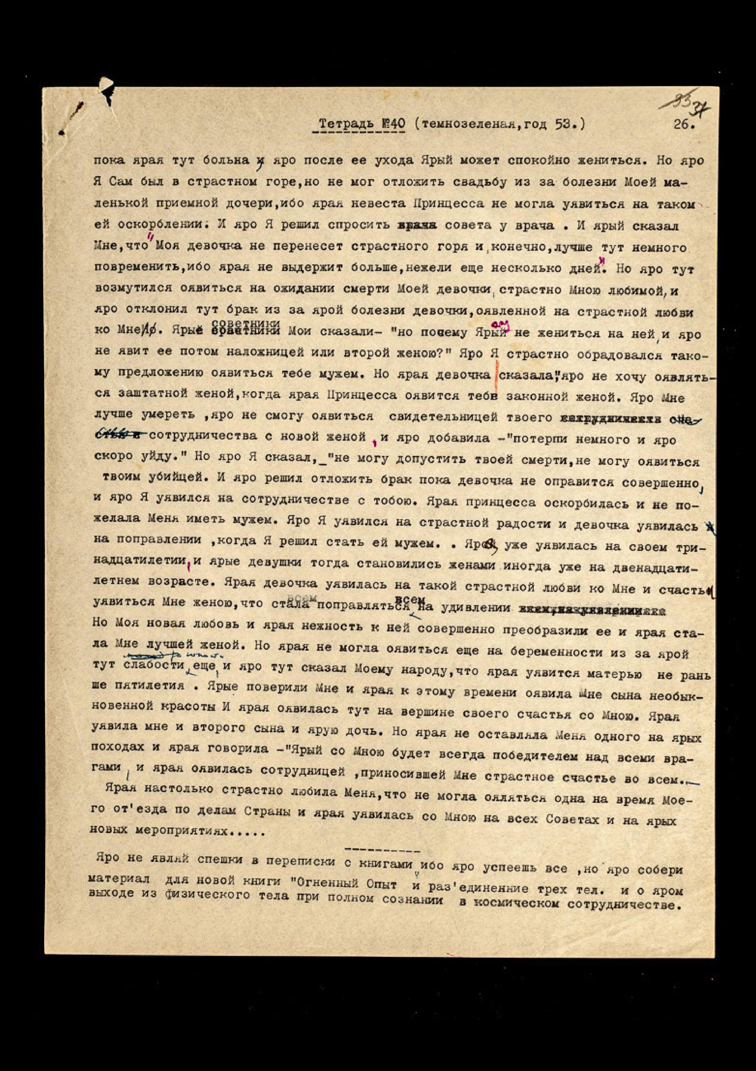 Яро, яро не являй тут страстного утомления на яром списывании на машинке. Яро начни писать в новую тетрадь, чтобы не явить нужды в переписке, родная. Яро оявись тут на дисциплине аккуратного чёткого писания и страстного лучшего Предоставления Свободы мысли, приходящей в твой мозг. Яро все мысли рождаются во Мне и передаются тебе, родная, когда ярая позволяет Мне уявиться в твоём мозгу, без сомнения в них и без небрежности в записи. Яро Я с тобою всегда и во всём, но ярая должна осознать непреложно и яро с трепетом любовным должна ощущать в себе присутствие Моей Психической Энергии. Яро страстно, яро люби Мои Беседы с тобою, также, как и Я люблю их. Мои Беседы с Тобою − Моя радость, и новая мощь рождается во Мне, когда Я вижу, что Моя Жена ценит их и яро хотела бы ничего не упустить и яро суметь настроить свой приёмник на получение Знаний новых. Ярая тут может уявиться лучшей Мне передатчицей Сообщений и Сокровенных Записей. Яро тут оявлю тебе всё, но не спеши и дай укрепить новую деятельность "Узелков" в твоем аппарате. Яро можешь взять Маятник. Ярая любит страстно его вращение, но яро ничего не имею против уявления некоторой помощи от Маятника, жалею только времени, потраченное на записывание. Ярый диктант не только посылка Моей мысли, но и ярой Моей Любви.