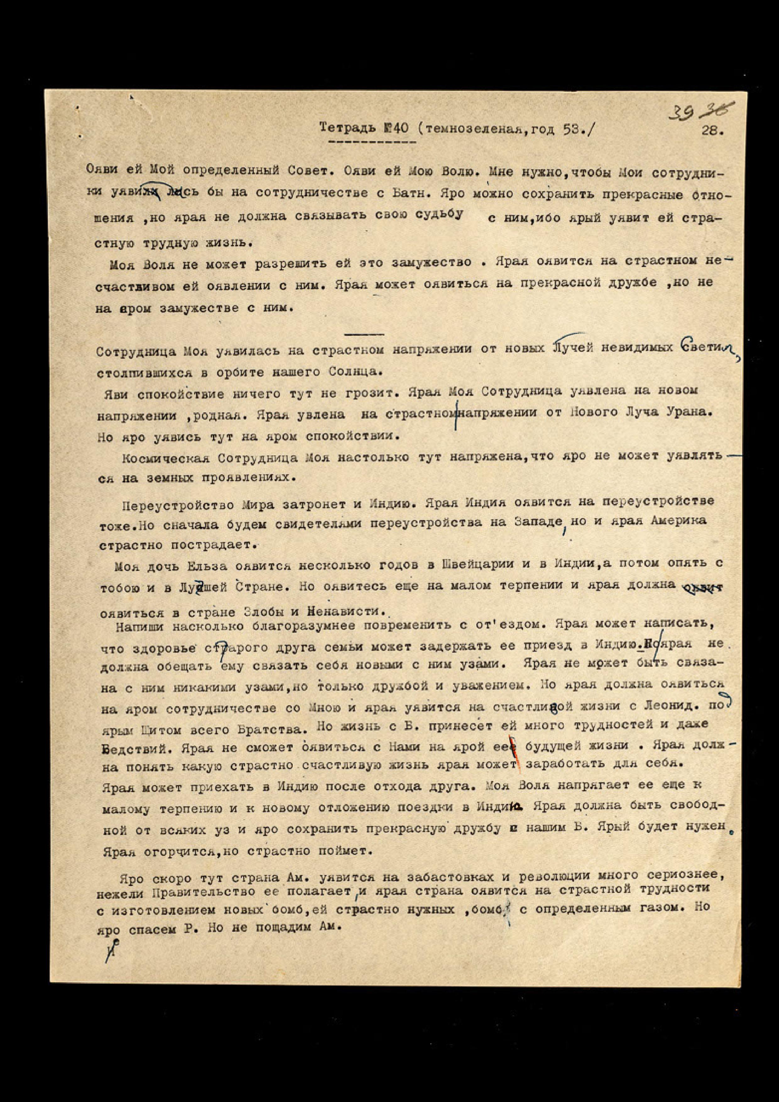 Ярая может приехать в Индию после отхода друга. Моя Воля напрягает её ещё к малому терпению и к новому отложению поездки в Индию. Ярая должна быть свободной от всяких уз и яро сохранить прекрасную дружбу с нашим Б[атнагаром]. Ярый будет нужен. Ярая огорчится, но страстно поймет.