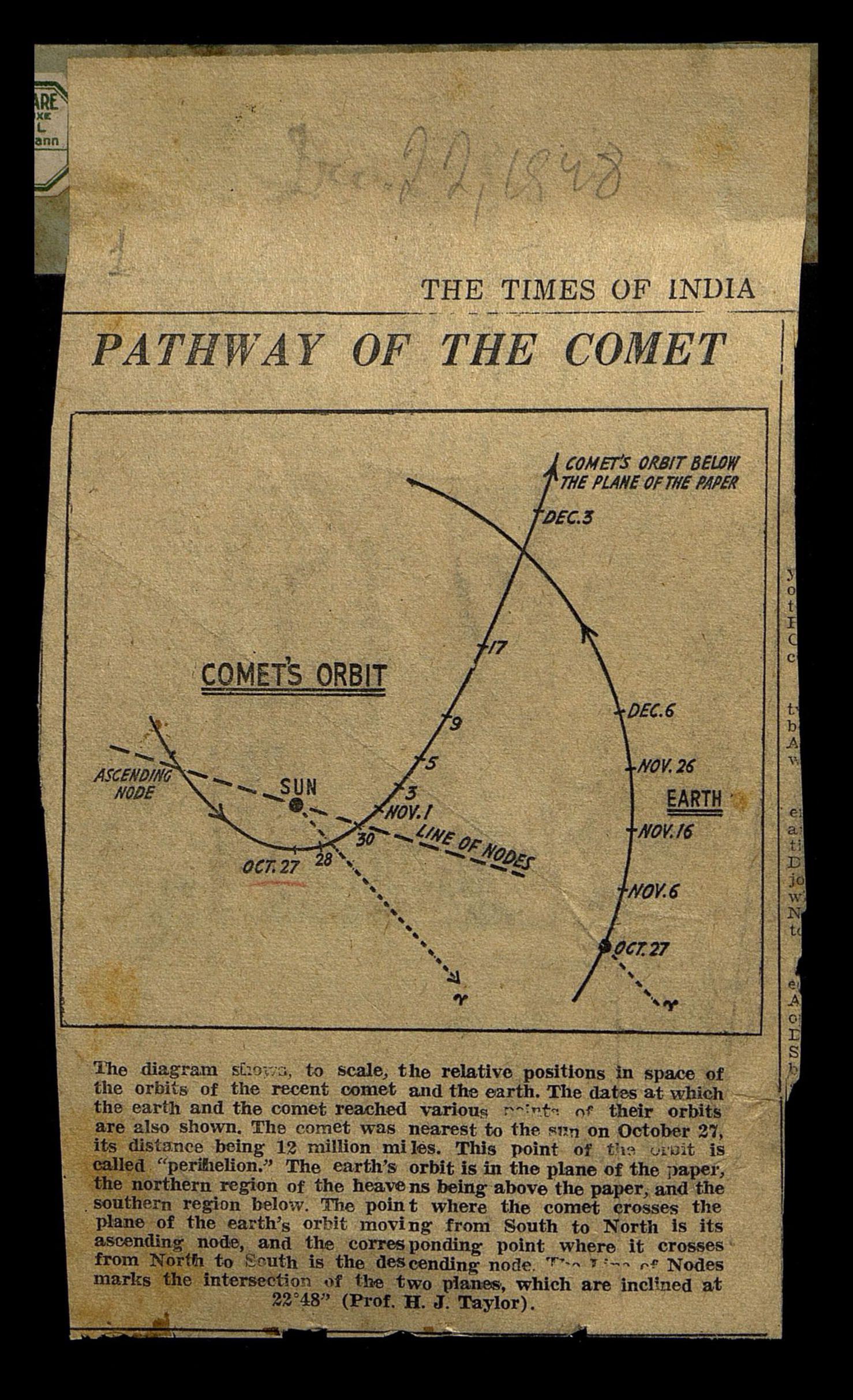 В то время она уже удалялась, ее наибольшее приближение к солнцу было 27 октября. Она находилась всего в 12 миллионах миль от солнца, что, учитывая астрономические расстояния, является очень сильным приближением. Ее скорость составляла чуть более 100 миль в секунду, или почти девять миллионов миль в день. Четыре дня спустя, незадолго до затмения, комета прошла очень близко между нами и солнцем, на расстоянии около 20 миллионов миль от солнца и 70 миллионов миль от земли. Затем путь кометы привел ее к точке на орбите Земли, которой сама Земля достигнет в начале января. Таким образом, комета и земля двигались более или менее в одну и ту же точку. Но приблизиться вплотную было невозможно по двум причинам: во-первых, скорость кометы, хотя и быстро снижается, тем не менее намного превышает земную, и комета добралась туда первой. Ее расстояние от Солнца к 1 декабря было равно радиусу земной орбиты. Во-вторых, две орбиты не находятся в одной плоскости, а расположены относительно друг друга под углом 23 градуса. Таким образом, два пути не могут пересекаться, но в ближайшей точке их разделяет более 30 миллионов миль. По мере удаления кометы в космос она быстро становится все слабее и уже перестала быть объектом, видимым невооруженным глазом. Однако за ней можно следить в течение месяца или двух с помощью телескопа. Интересно отметить, что к январю ее видимое движение пронесет ее прямо по небу, и оно будет находиться в направлении, почти противоположном направлению солнца. Она не относится к известным периодическим кометам. Ее орбита неотличима от параболы, а это значит, что если она вообще вернется, то по прошествии времени, которое будет исчисляться сотнями, а возможно, и тысячами лет. Эйч Джей Тейлор. Бомбей, 18 декабря.]
