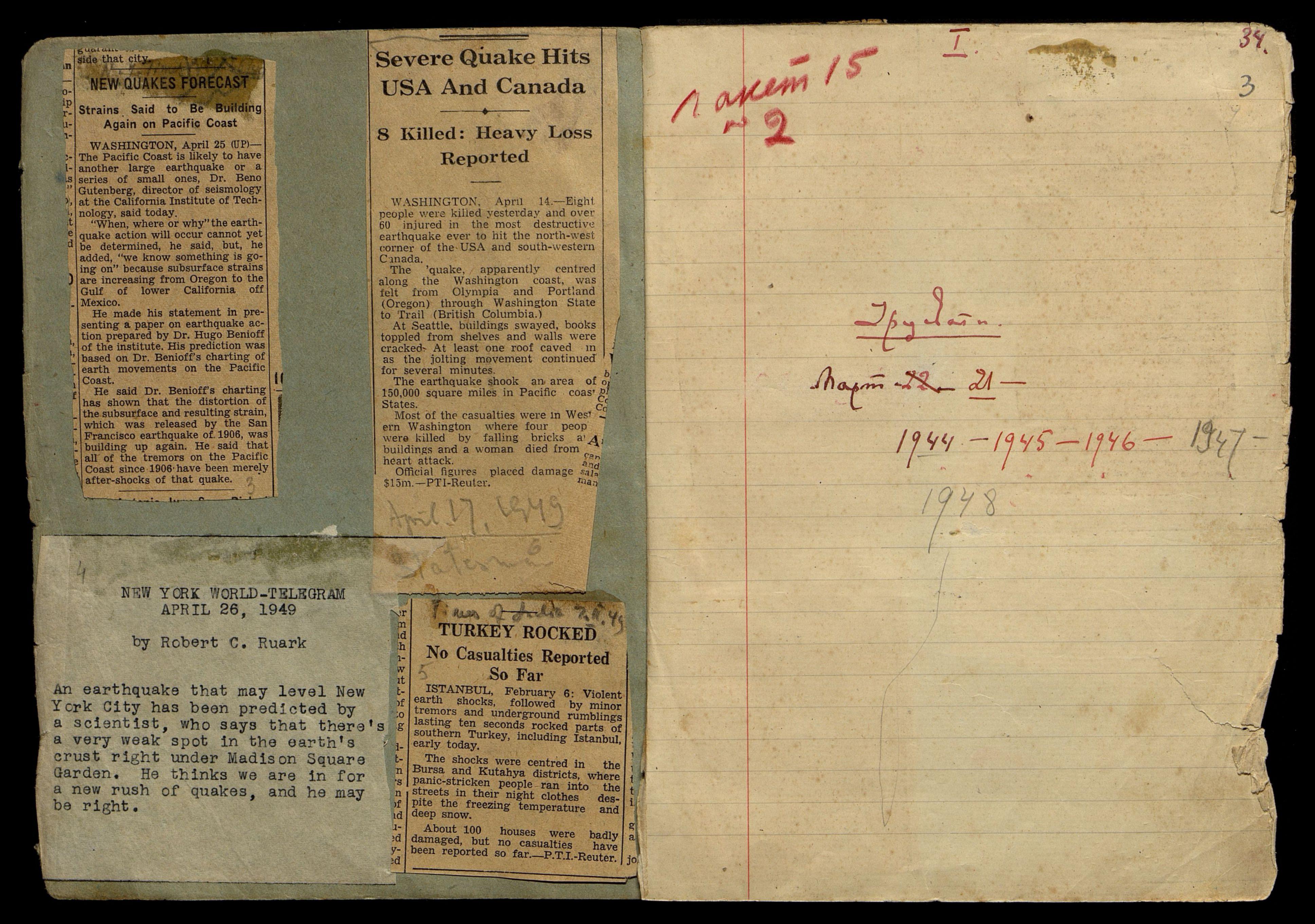 WASHINGTON, April 25 [1949] (UP) — The Pacific Coast is likely to have another large earthquake or a series of small ones, Dr. Beno Gutenberg, director of seismology at the California Institute of Technology, said today. "When, where or why" the earthquake actions will occur cannot yet be determined, he said, but, he added, "we know something is going on" because subsurface strains are increasing from Oregon to the Gulf of lower California of Mexico. He made his statement in presenting a paper on earthquake action prepared by Dr. Hugo Benioff of the institute. His prediction was based on Dr. Benioff's charting of earth movements on Pacific Coast. He said Dr. Benioff's charting has shown that the distortion of the subsurface and resulting strain, which was released by the San Francisco earthquake of 1906, was building up again. He said that all of the tremors on the Pacific Coast since 1906 have been merely after-shocks of the quake.