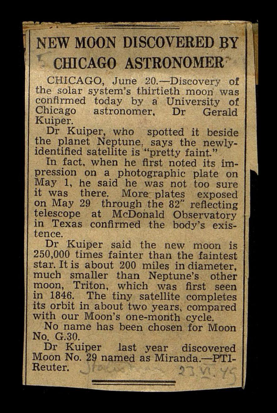 Чикаго, 20 июня [1949]. — Открытие тридцатой луны Солнечной системы было подтверждено сегодня астрономом Чикагского университета. Доктор Джеральд Койпер, который заметил ее рядом с планетой Нептун, говорит, что недавно идентифицированный спутник "довольно слабый". На самом деле, когда он впервые заметил его изображение на фотографической пластинке 1 мая, он сказал, что не слишком уверен, что он там был. Другие пластины, экспонированные 29 мая с помощью 82-дюймового телескопа-отражателя в обсерватории Макдональда в Техасе, подтвердили существование тела. Доктор Койпер сказал, что новая луна в 250 000 раз слабее самой слабой звезды. Ее диаметр составляет около 200 миль, что намного меньше, чем у другого спутника Нептуна, Тритона, который впервые был замечен в 1846 году. Крошечный спутник совершает оборот по своей орбите примерно за два года, по сравнению с месячным циклом нашей Луны. Для Луны № G.30 название не выбрано. Доктор Койпер в прошлом году открыл Луну № 29, названную Мирандой.]