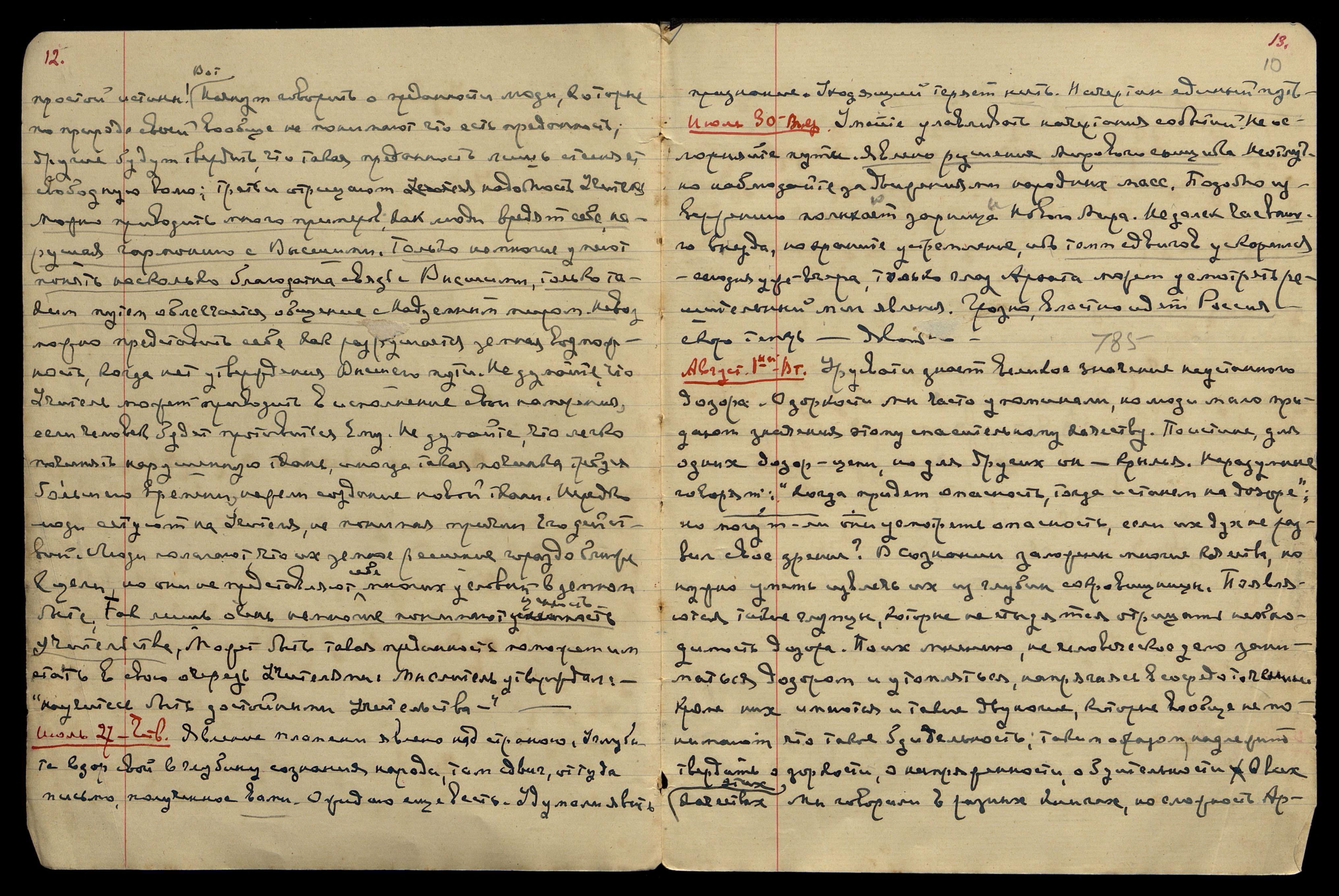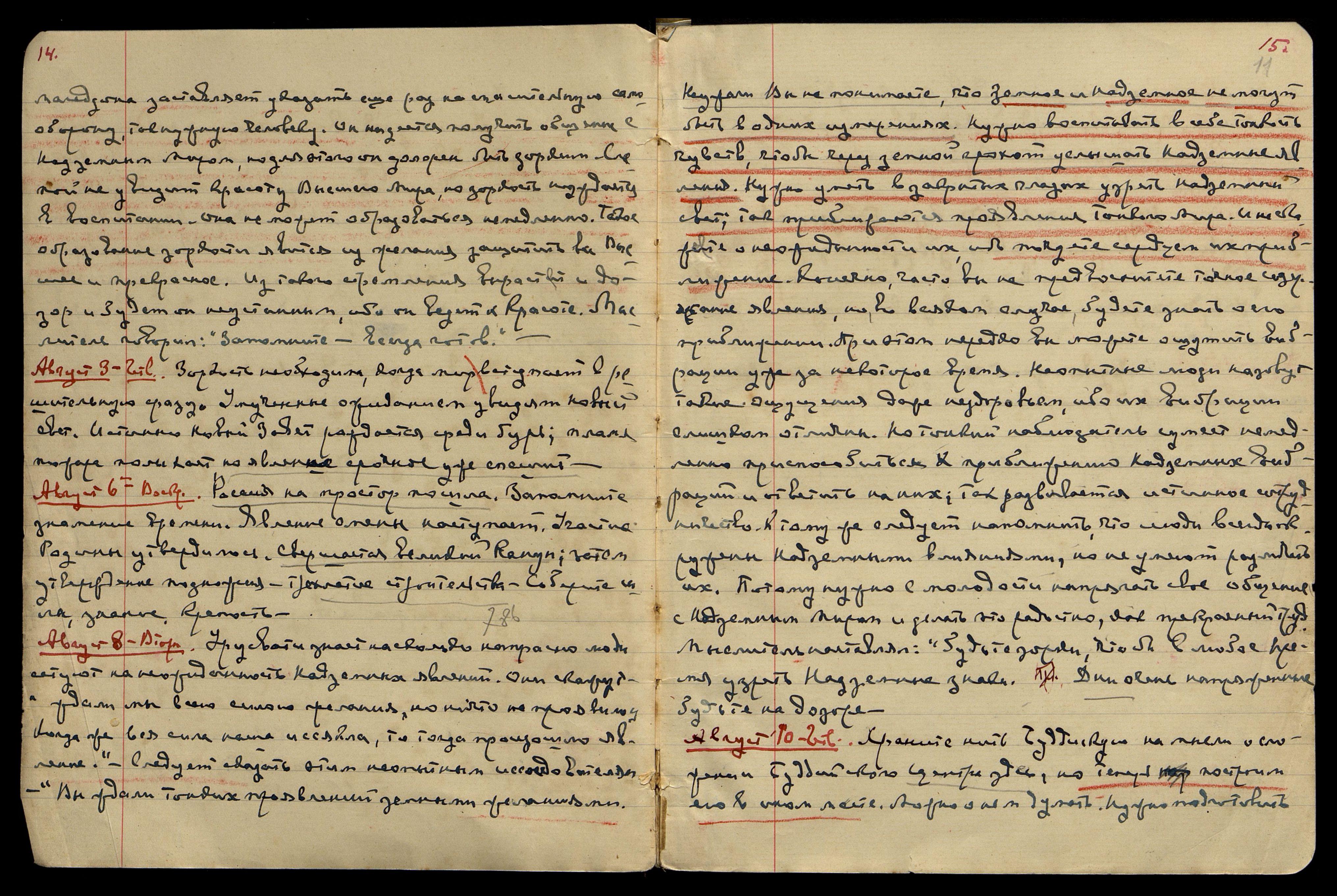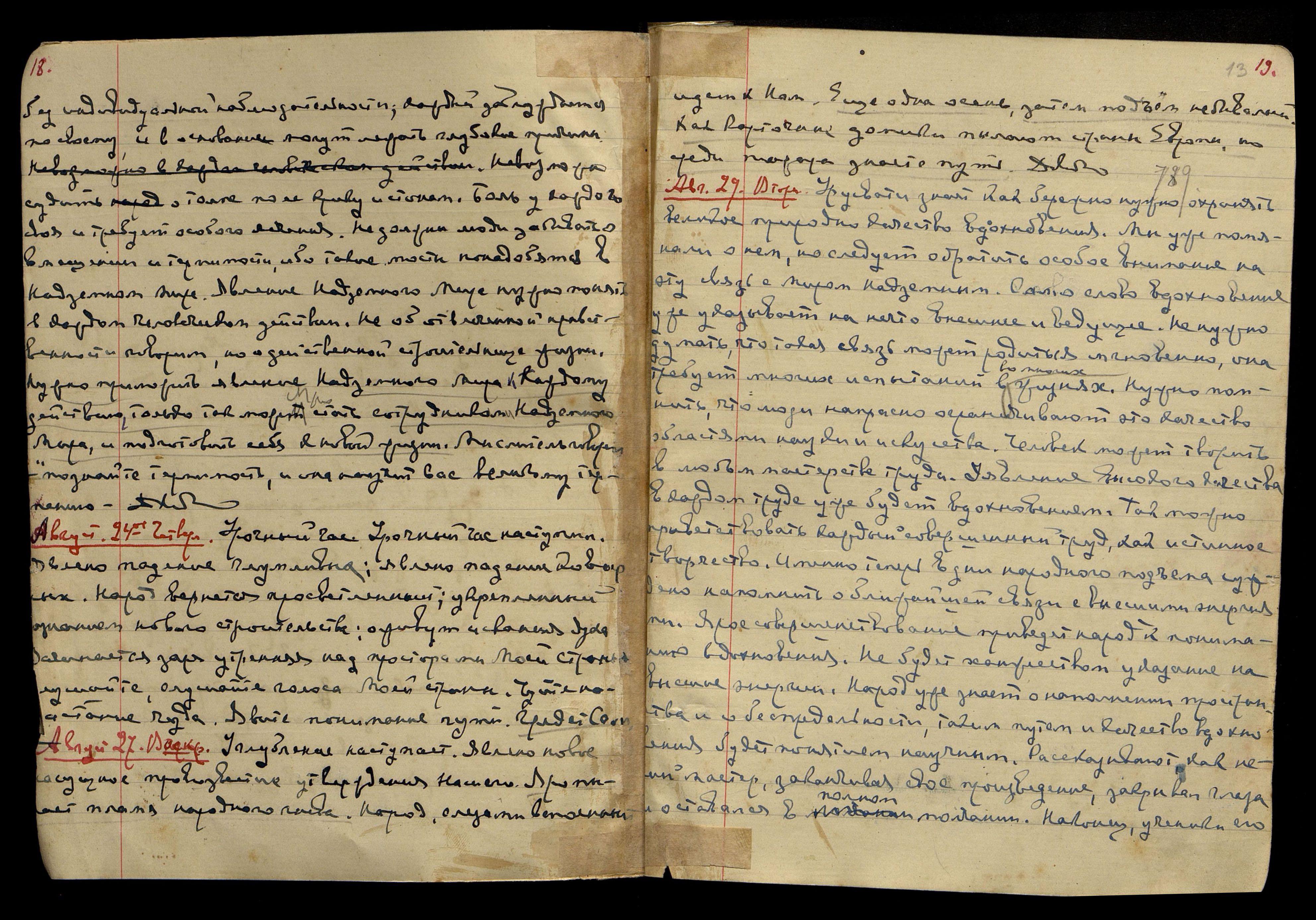 Август 13. Воскресенье. Шумит поток среди бурь. Пойдем, явим подвиг. Явим подвижность, явим утверждение зарнице духа. Снизойдет лестница просветления и положен предел скверне. Утвердится родина на новом духовном пути. Ждите длинное письмо. Довольно.