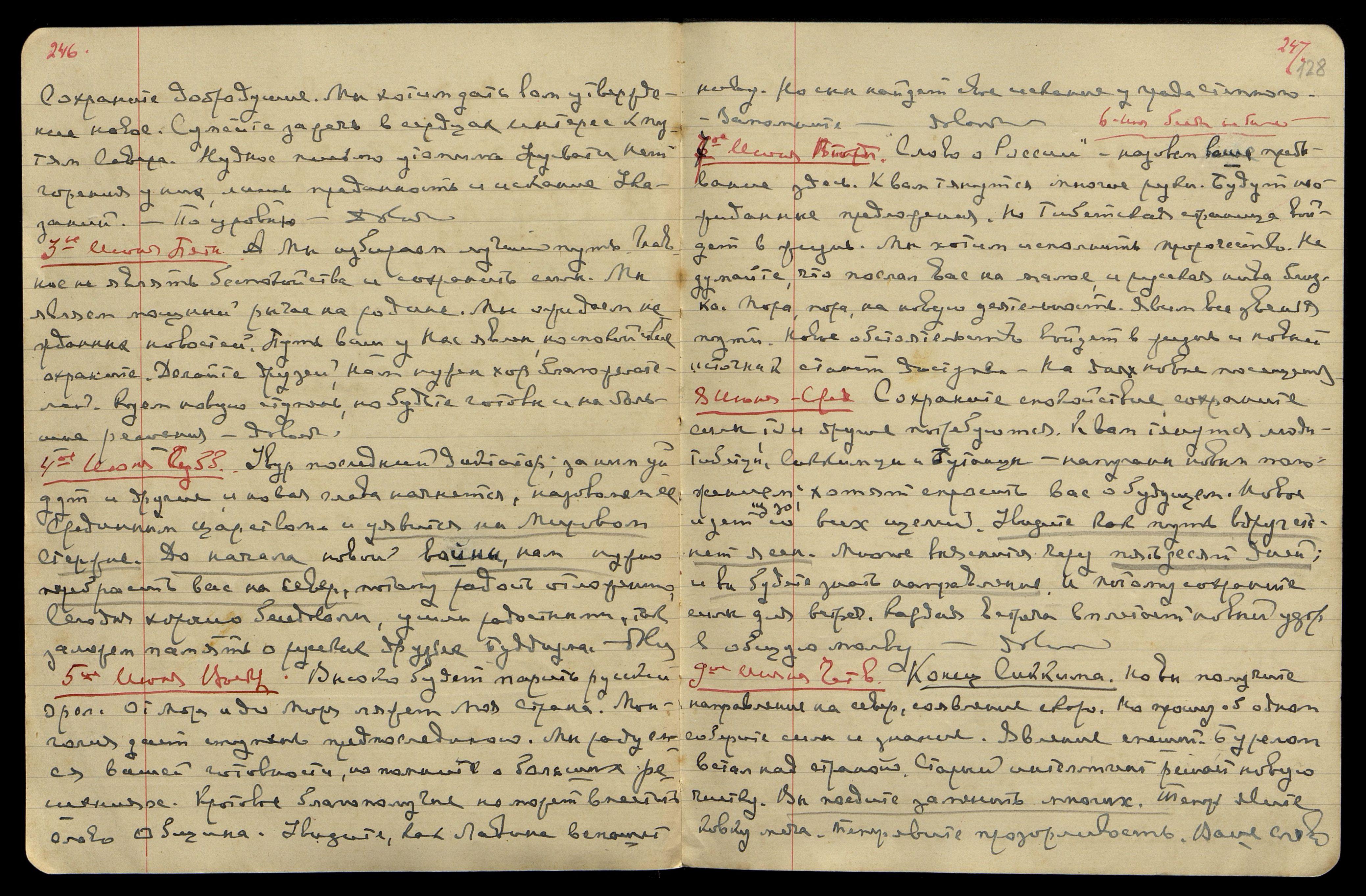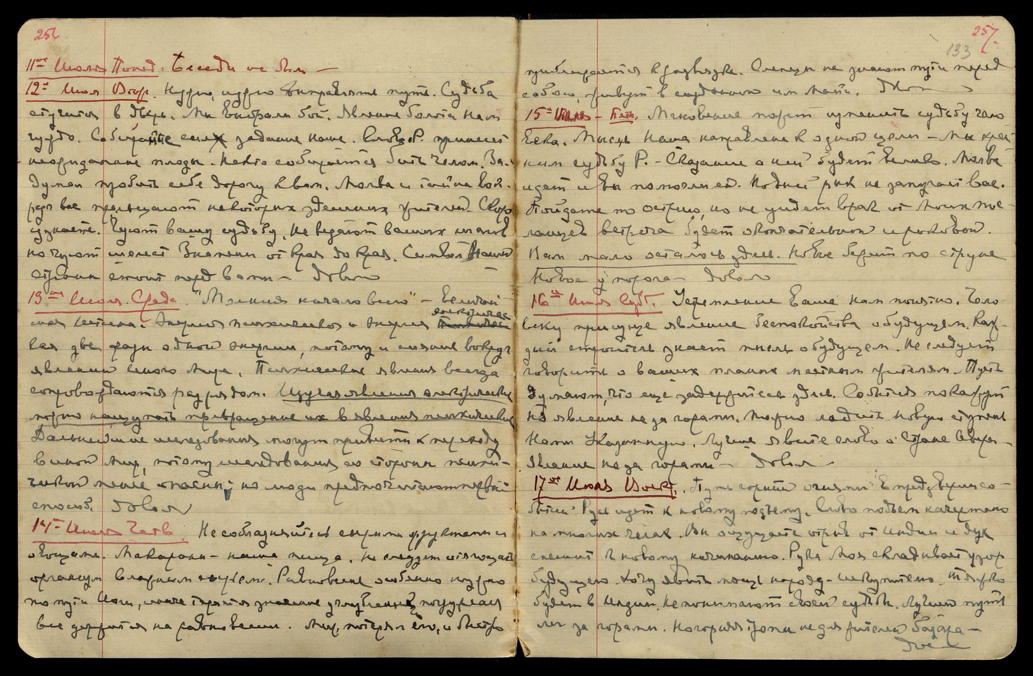 15-е июля. Пятница. Мгновение может изменить судьбу человека. Мысль Наша направлена к одной цели — Мы храним судьбу Р[оссии]. Сказание о ней будет велико. Молва идет и вы помогли ей. Новый рык не запугает вас. Пойдете по острию, но не уйдет враг от Моих посланцев, встреча будет окончательной и роковой. Вам мало осталось здесь. Новое бежит по струне. Новое у порога. Довольно.