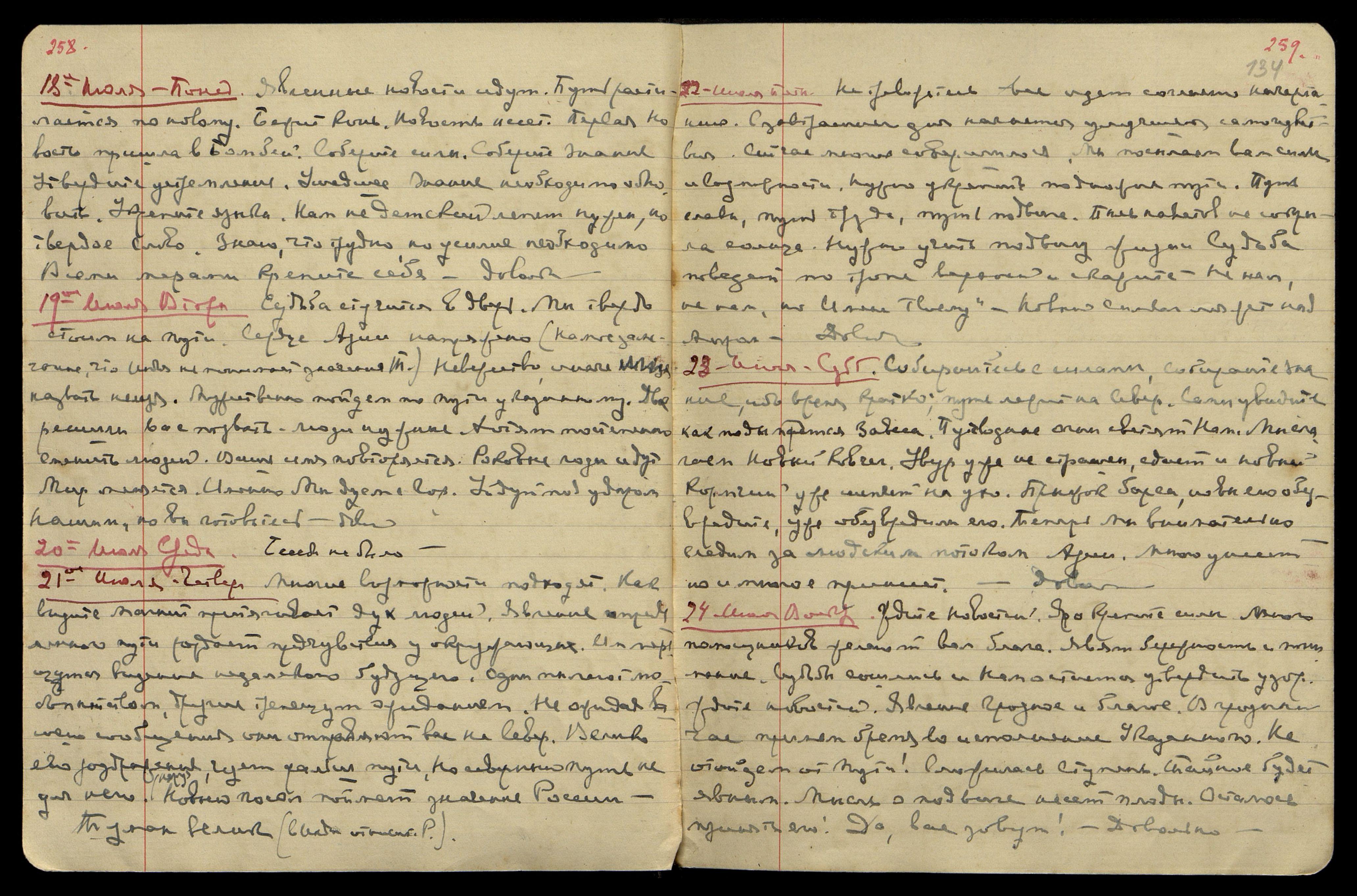 20-е июня. Понедельник. Не горюй перед светлым путем на Родину. Явление, явление спешит. Новое идет через Тибет. Решают позвать вас на север. Не знают, что молния озарит поворот политики, что явят последний этап, поворотный пункт истории. Смена велика. Мои копейщики* новой Зари вас ждут — ярая рать. Довольно.
