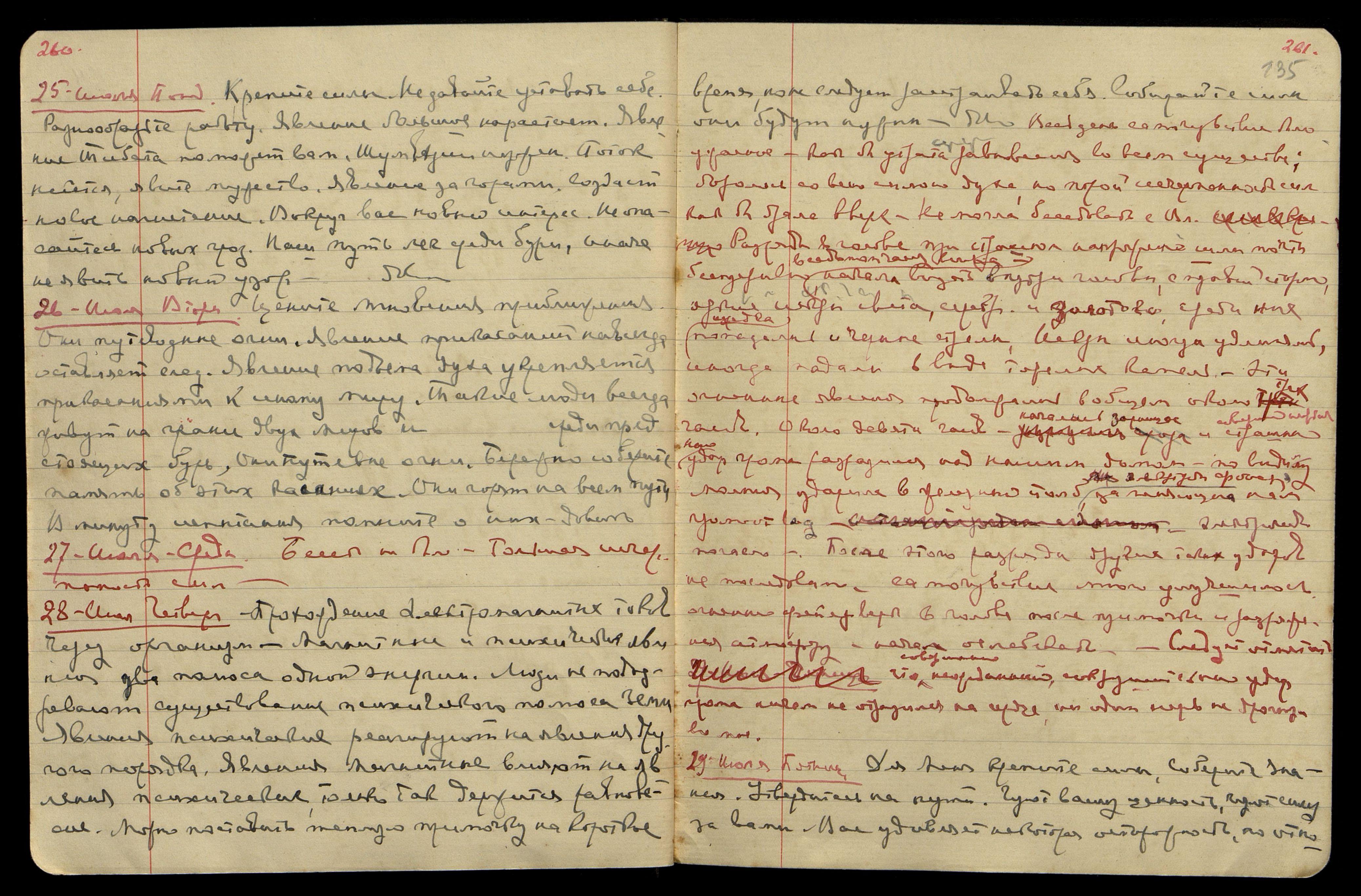 Весь день самочувствие было ужасное — как бы утрата равновесия во всем существе; боролась со всею силою духа, но порой исчерпанность сил как бы брала вверх. Не могла беседовать с Вл[адыкой]. Разряды в голове при страшном напряжении шли почти беспрерывно. В седьмом часу вечера начала видеть внутри головы, с правой стороны яркие искры света, серебр[енные] и золотые, среди них изредка показались и черные стрелы. Искры иногда удлинялись, иногда падали в виде тяжелых капель. Эти огненные явления продолжались в общем около трех часов. Около девяти часов начались зарницы и совершенно неожиданный удар грома разразился над нашим домом — по видимому молния ударила в железный столб электрического фонаря, заменяющего нам громоотвод. Электричество погасло. После этого разряда других таких ударов не последовало. Самочувствие много улучшилось, огненный фейерверк в голове после примочки и разряжения атмосферы начал ослабевать. Следует отметить, что совершенно неожиданный, сокрушительный удар грома ничем не отразился на сердце, не один нерв не дрогнул во мне.