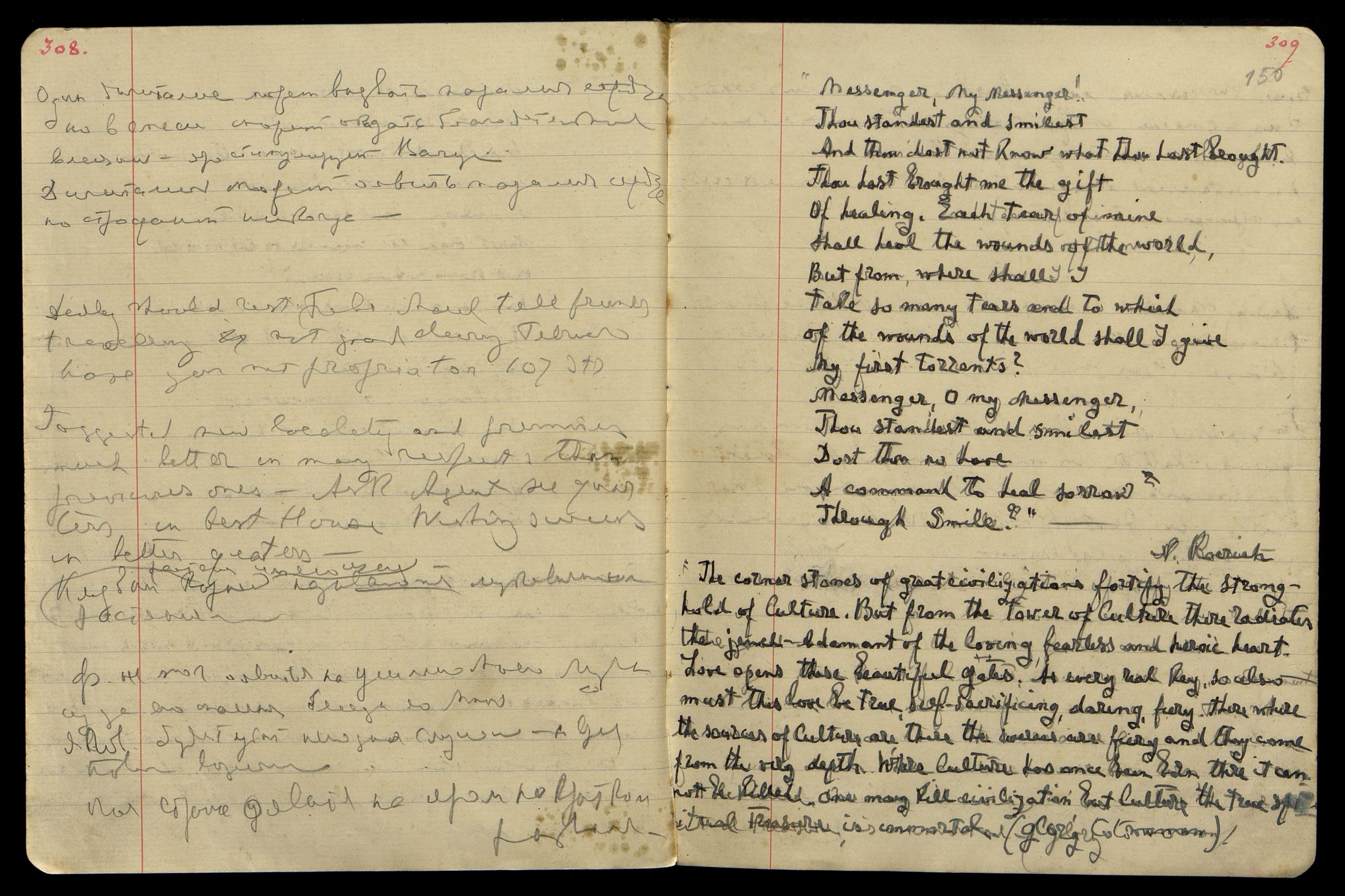 [англ.: Камни великих цивилизаций укрепляют твердыню Культуры. Но на башне Культуры сияет алмаз-адамант любящего, познающего, бесстрашного Сердца. Любовь открывает эти Врата прекрасные. Как всякий настоящий ключ, и любовь эта должна быть подлинная, самоотверженная, отважная, горячая. Там, где истоки Культуры, там источники горячи и бьют они из самых недр. Где зародилась Культура, там ее уже нельзя умертвить. Можно убить цивилизацию. Но Культура, как истинная духовная ценность, бессмертна. (Слава женщинам).]**