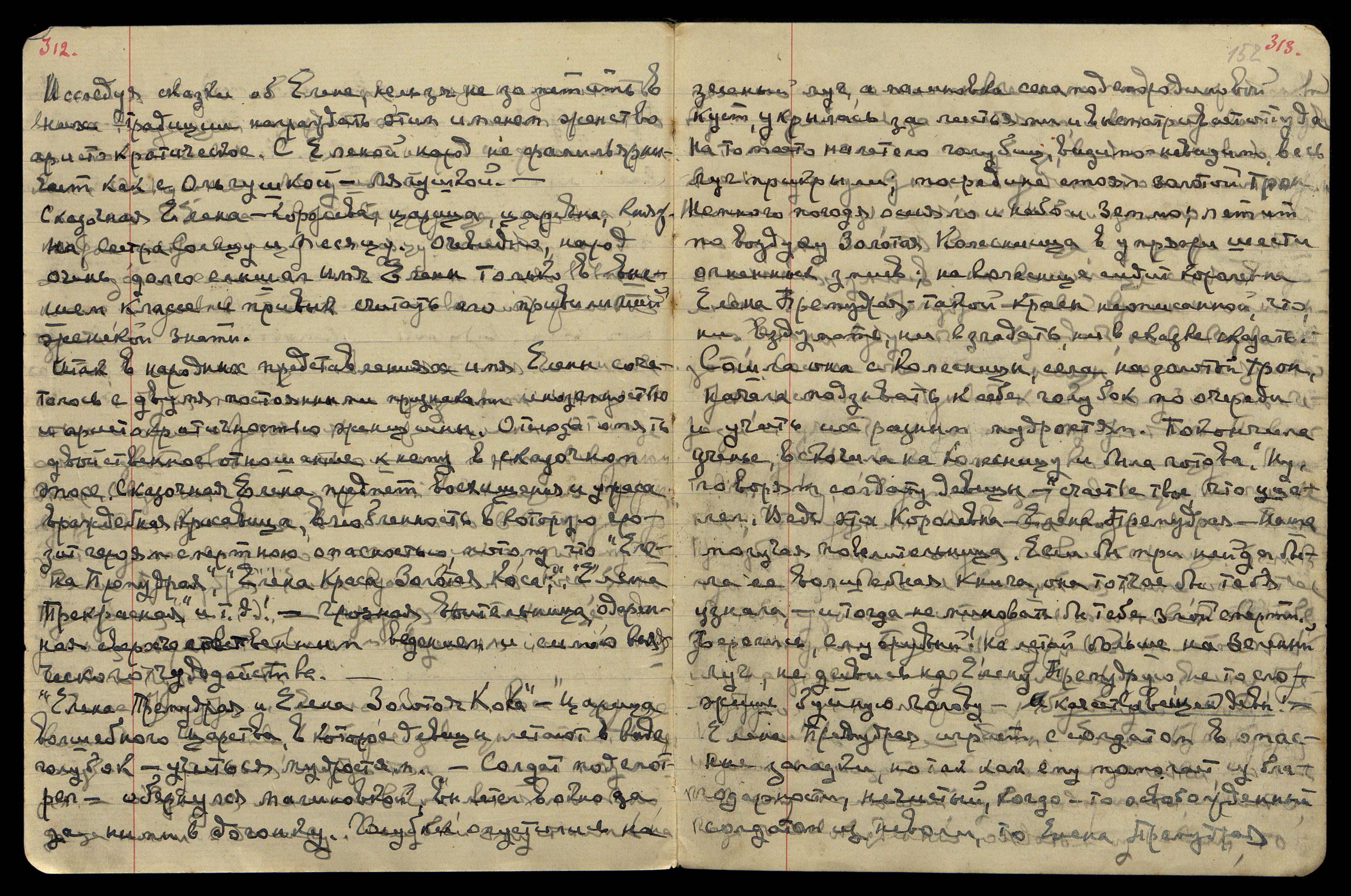 "Елена Премудрая и Елена Золотая Коса" — Царица волшебного царства, в которое девицы летают в виде голубок — учиться мудростям. Солдат подсмотрел — обернулся малиновкой, вылетел в окно, да за ними в догонку. Голубка опустилась на зеленый луг, а малиновка села под смородиновый куст, укрылась за листьями и высматривает оттуда. На то место налетело голубиц, видимо-невидимо, весь луг прикрыли; посредине стоял золотой трон. Немного погодя осияло и небо и землю; летит по воздуху Золотая Колесница в упряжи шести огненных змиев; на колеснице сидит королевна Елена Премудрая — такой красы неописанной, что ни вздумать, ни взгадать, ни в сказке сказать. Сошла она с колесницы, села на золотой трон, начала подзывать к себе голубок по очереди и учить их разным мудростям. Покончила ученье, вскочила на колесницу и была готова. "Ну, — говорят солдату девицы, — счастье твоё, что уцелел. Ведь эта Королевна — Елена Премудрая — наша могучая повелительница. Если бы при ней да была её волшебная книга, она тотчас бы тебя узнала, — и тогда не миновать бы тебе злой смерти. Берегись, служивый! Не летай больше на Зеленый Луг, не дивись на Елену Премудрую, не то сложишь буйную голову". И качество вещей девы! Елена Премудрая играет с солдатом в опасные загадки, но так как ему помогает из благодарности, нечистый, когда-то освобожденный солдатом из неволи, то Елена Премудрая