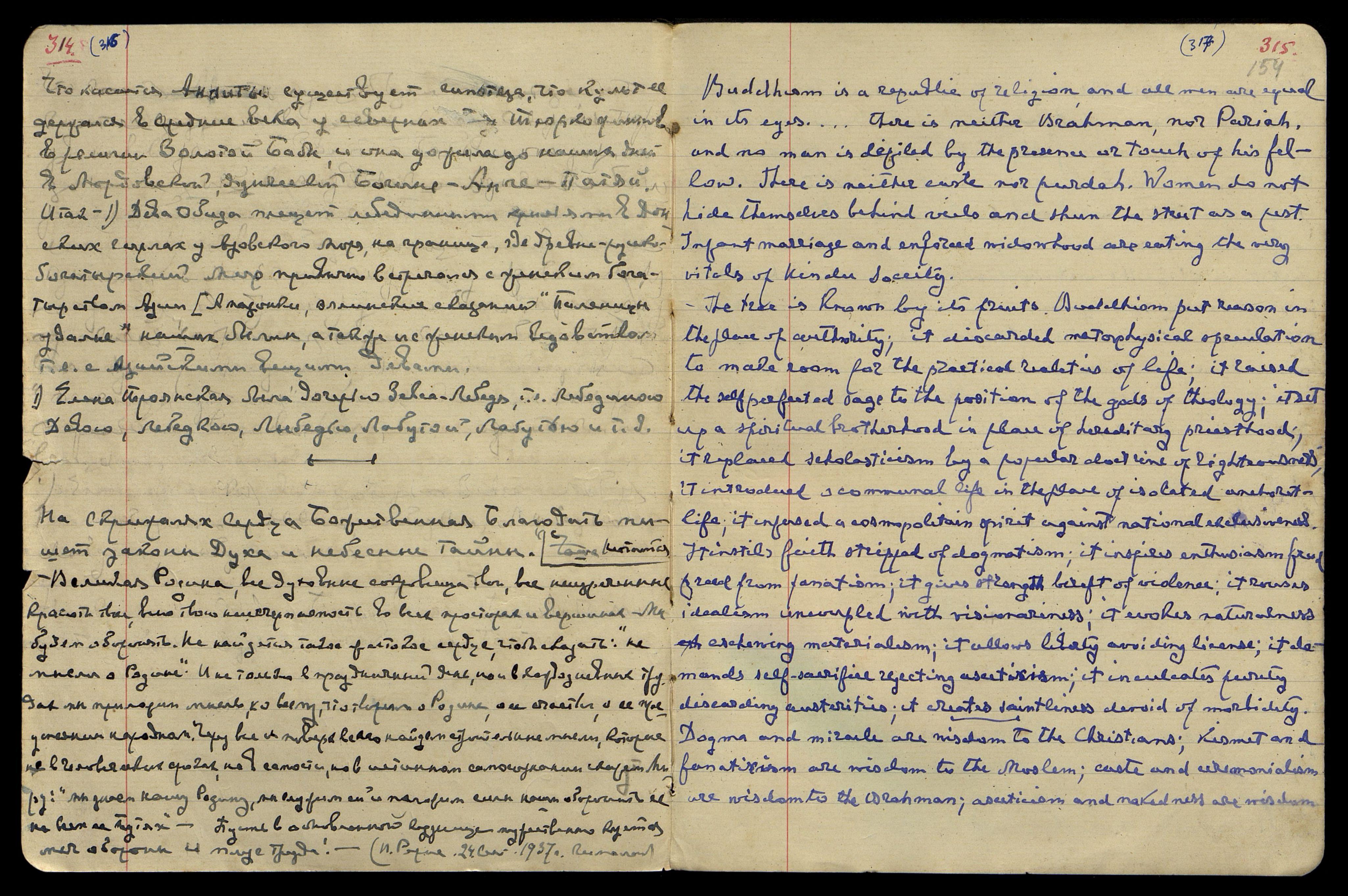 [англ.: Буддизм — это мир религии, и в его глазах все люди равны... Нет ни брамина, ни парии*, и ни один человек не оскверняется присутствием или прикосновением своего ближнего. Нет ни касты, ни пурды**. Женщины не прячутся за вуалями и не сторонятся улицы как чумы. Младенческие браки и вынужденное вдовство разъедают основные жизненные силы индуистского общества.