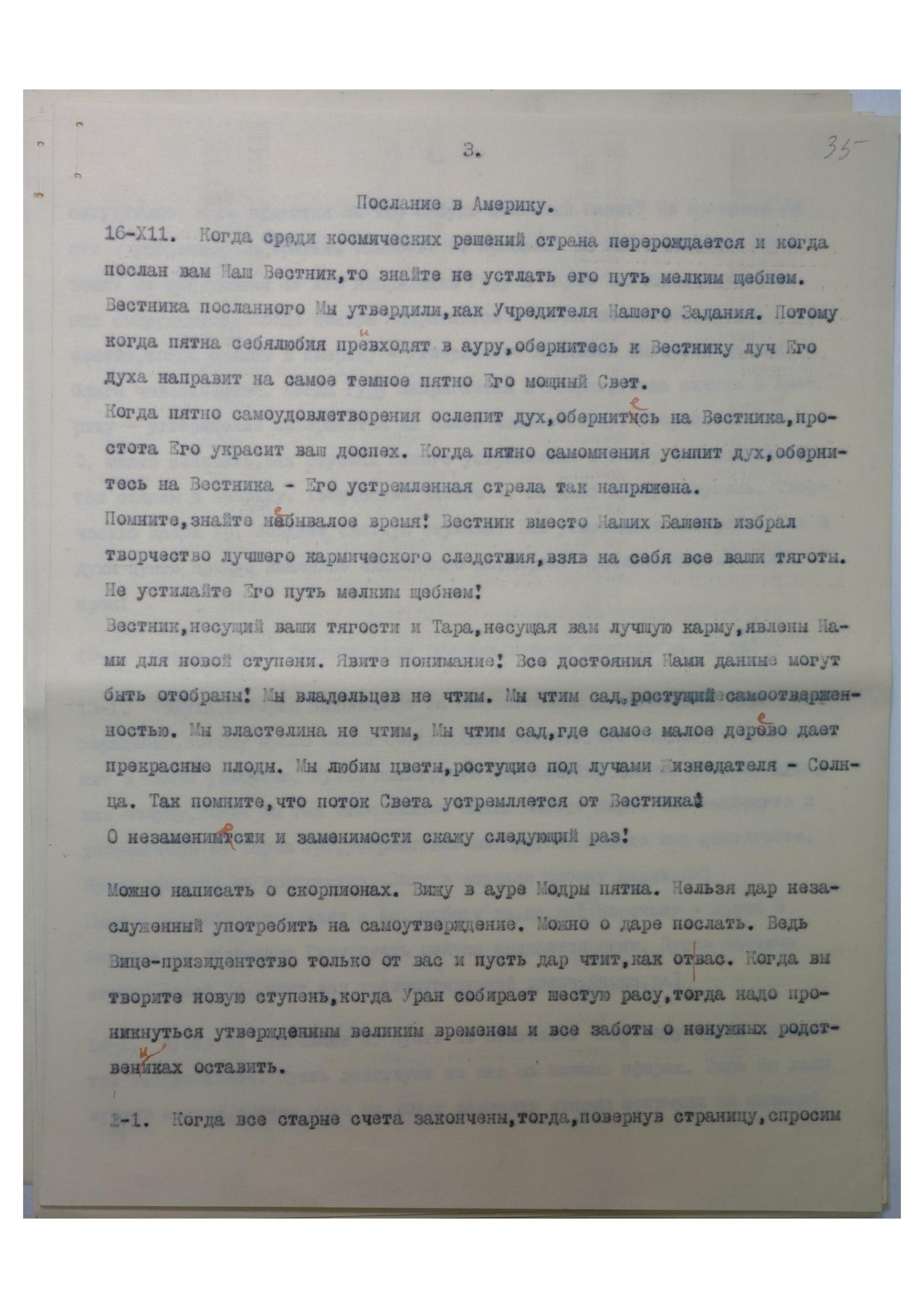 Вижу в зеркале удачу, вижу в Ам[ерике] победу — да, да, да! Но скажу — пусть в Америке не отягощают Гуру, пусть шелуха предается огню. Пусть светлые стрелы Нашей Урусвати чтут как трансмутирующий огонь. Да, да, да!