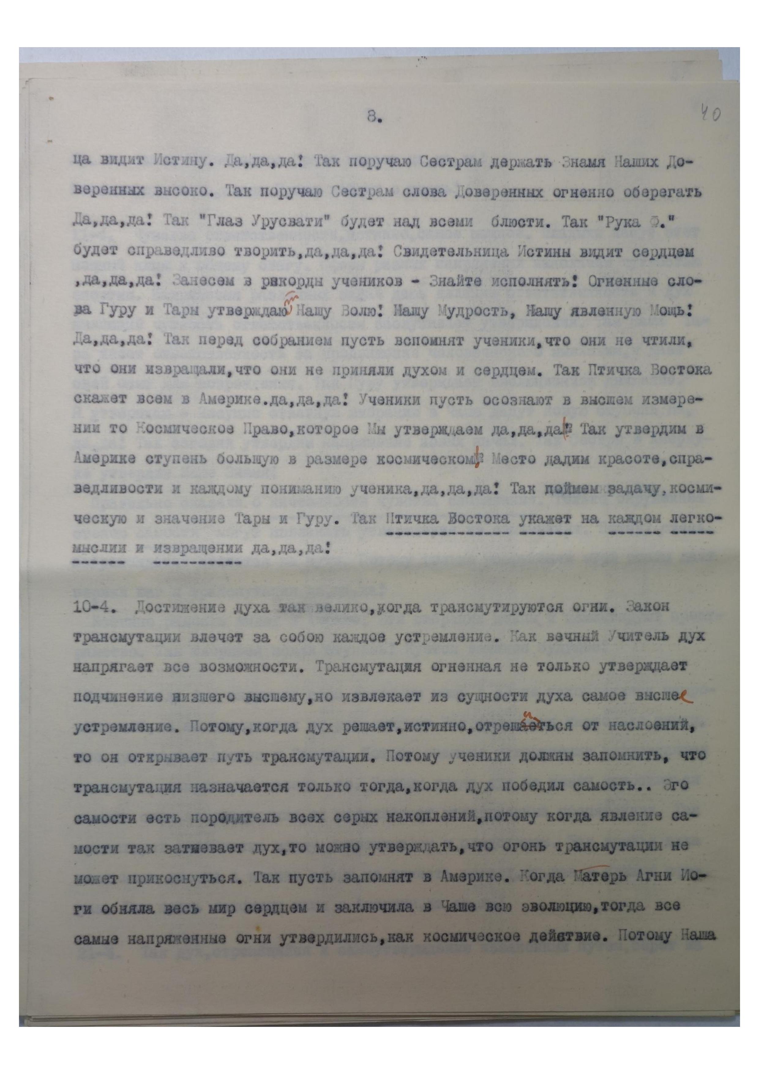 2-6. [1930 г.] Правильно сказала Урусвати о порождении утверждений противника, конечно, Мы не забудем попытки вражеские, но Мы знаем пользу вражеских попыток. Только принцип разрушения руководит Нашими противниками, но явление смещения напряжено. Конечно, недопустимо такое распутство в поведении, утвержденном нацией. Ведь, Ф[уяма] — Наш посол и представитель культуры. Так напряжение приведет к разоблачению, да, да, да! Ф[уяма] космически напряжен.