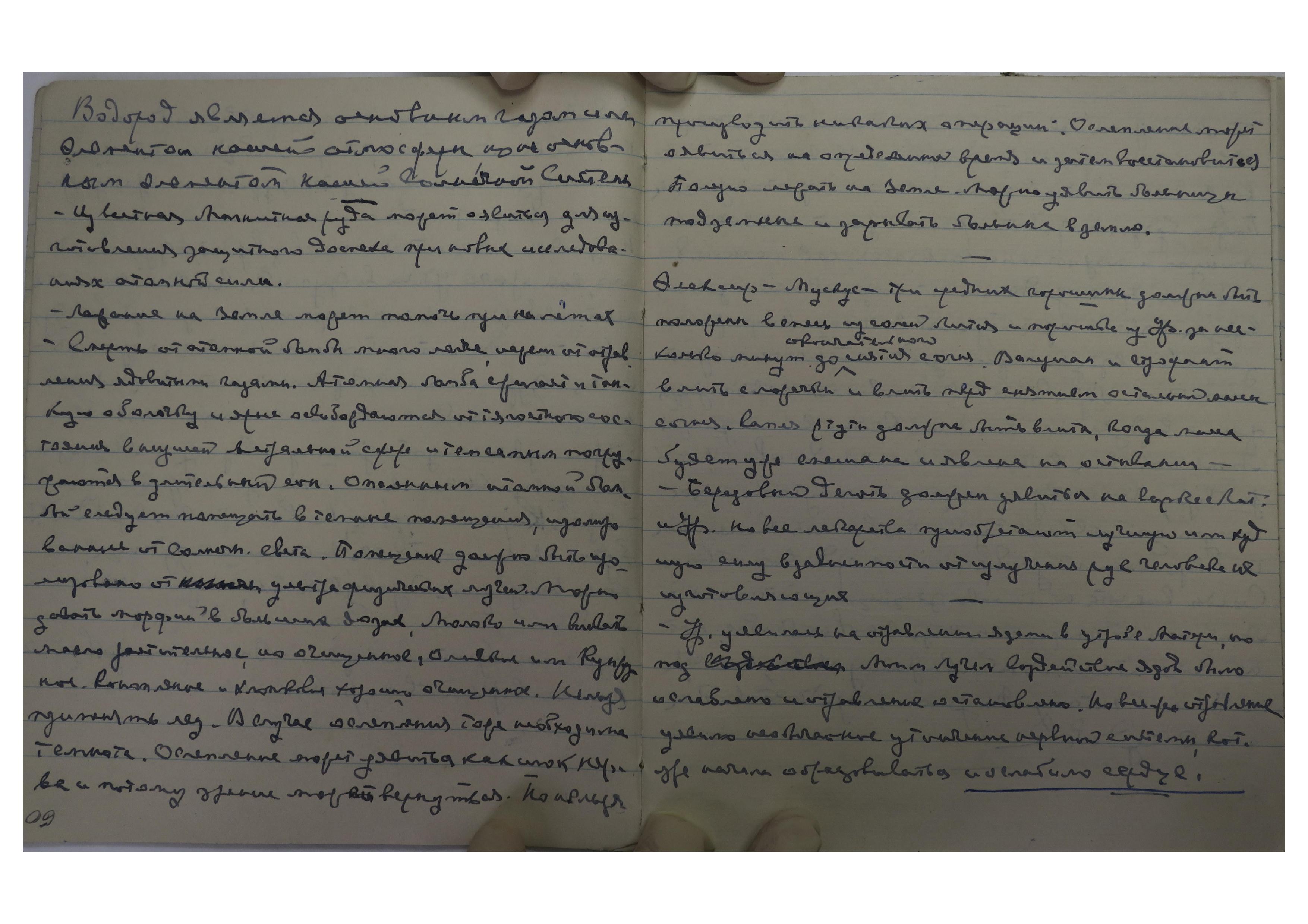 Моя страна оявилась на применении атомной энергии к двигателям, и ярая получит первенство во всем строительстве, во всех областях. Страна оявится на страстном расцвете. Поезда будут покрывать огромные расстояния в несколько минут, и аэропланы оявятся, как молнии в небесах. Ярые преодолеют сопротивление и давление воздуха, оявят страстную легкость ему. Напряжение и давление воздуха можно преодолеть самым простым способом. Лучи Гелия и Солян[ая] Кислота* оявят разряжение воздуха и легкость его. Соляная кислота должна быть оявлена в большом количестве и в сильном растворе, ибо она скоро испаряется, и лучи Гелия не могут действовать без Соляной Кислоты. Соляная кислота скоро станет универсальным средством от всего. Соляная кислота не только защищает от атомных бомб, но и от смертельн[ого] газа в новых бомбах, кот[орые] не легче атомн[ых] бомб. Америка уявлена как страна Зла, и потому Мы решили предоставить её своей судьбе.
