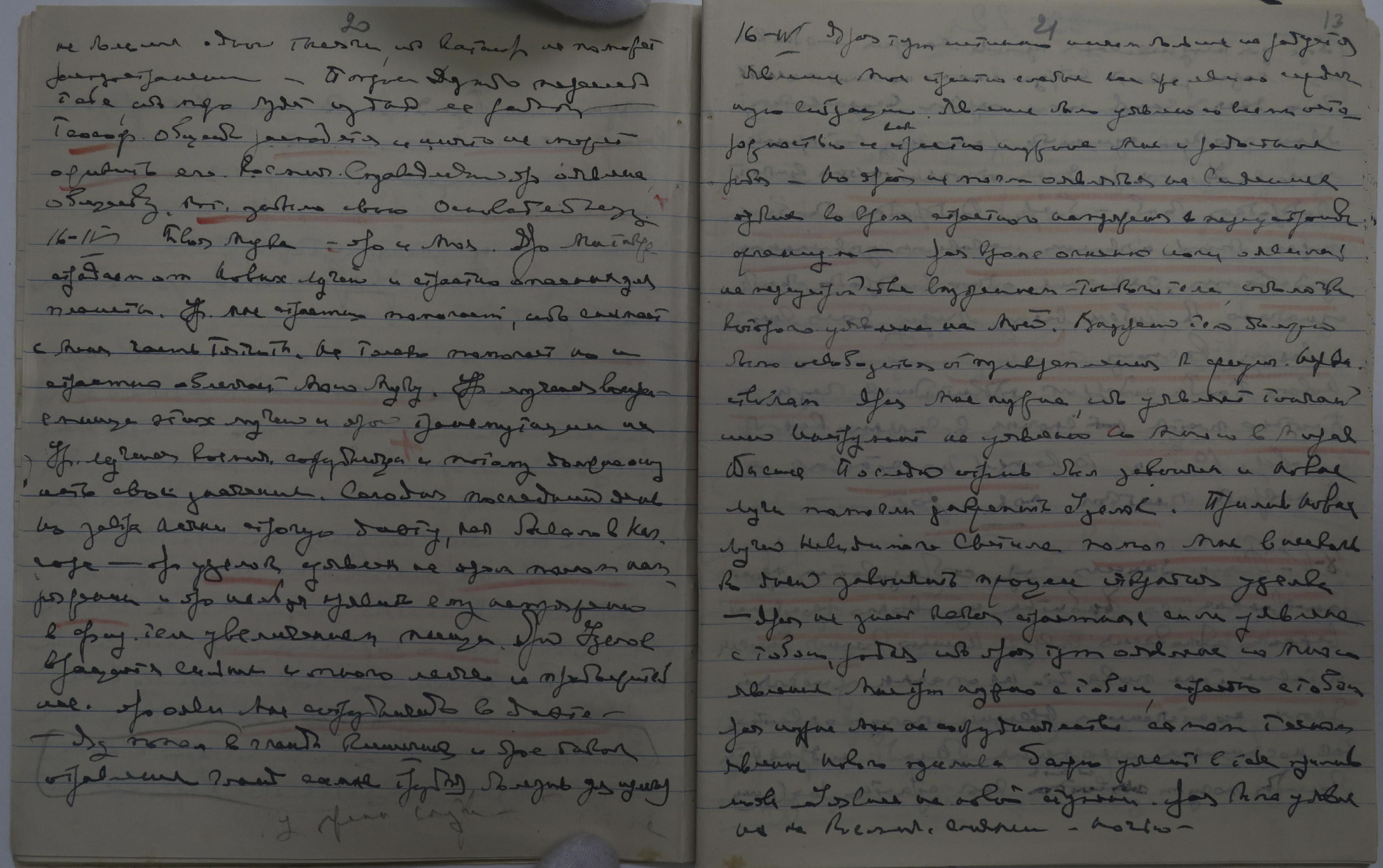 14-IV. Яро тут страстно сожалею, видя, как наши сотрудницы не понимают сотрудничества с нами, и яро тут болтают зря, и яро умаляют там, где могли бы яро сказать. Работа Д[утко] подходит к концу. Ярый том следует напечатать. Ярая Катр[ин] может напеч[атать]