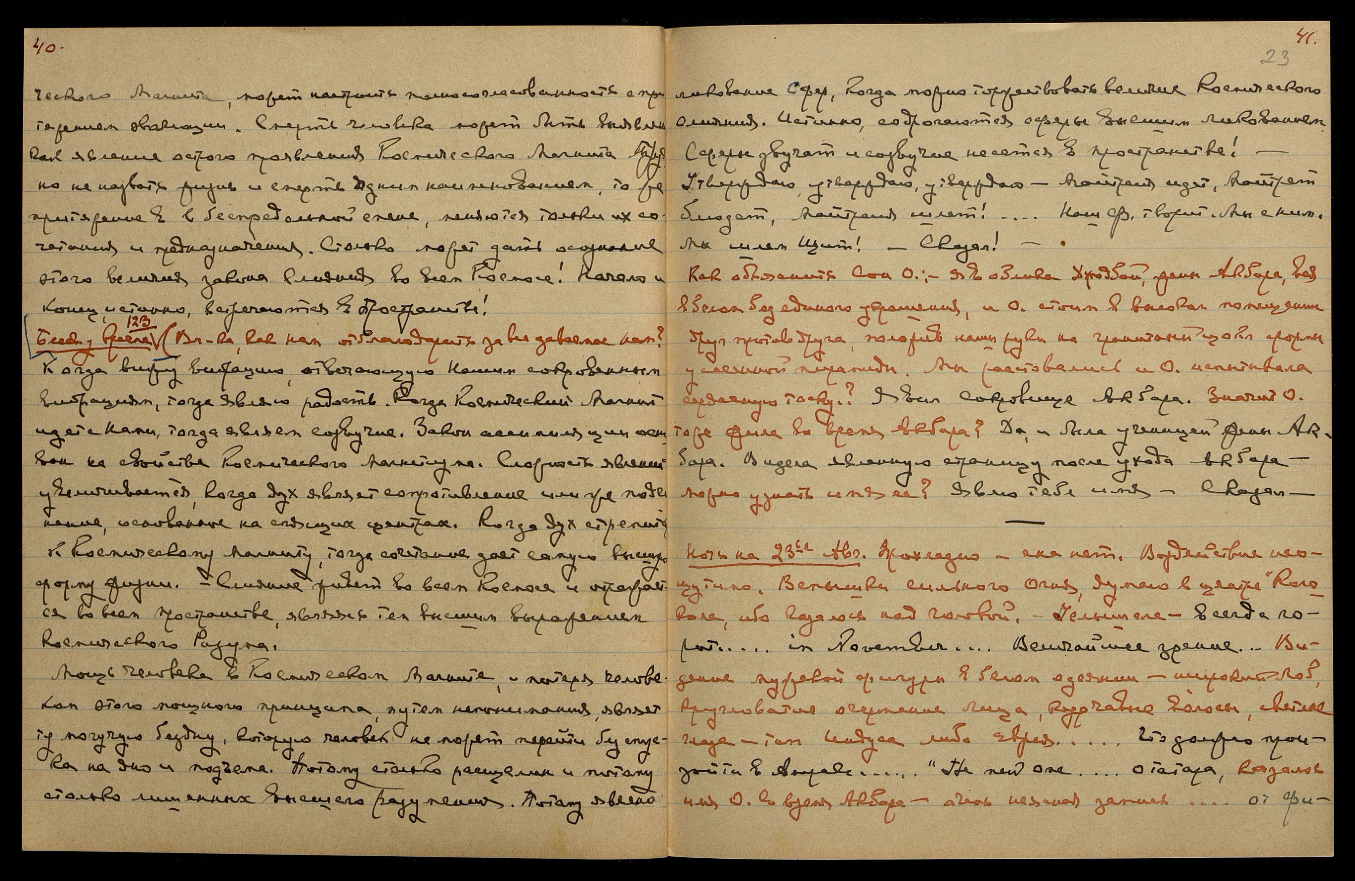 Ночь на 23-ье авг[уста]. Прохладно, сна нет. Воздействие неощутимо. Вспышки сильного огня, думаю, в центре "Колокола", ибо, казалось, над головой. Услышала: "Всегда горит... in november... [англ: в ноябре...] Величайшее зрение..." Видение мужской фигуры в белом одеянии. Широкий лоб, кругловатое очертание лица, курчавые волосы, светлые глаза. Тип индуса либо еврея. "Что должно произойти в Америке... The new one... [англ: Новый...]" "Отатара", − казалось, имя О[яны] во время Акбара. Очень неясная запись. "...от Фи-