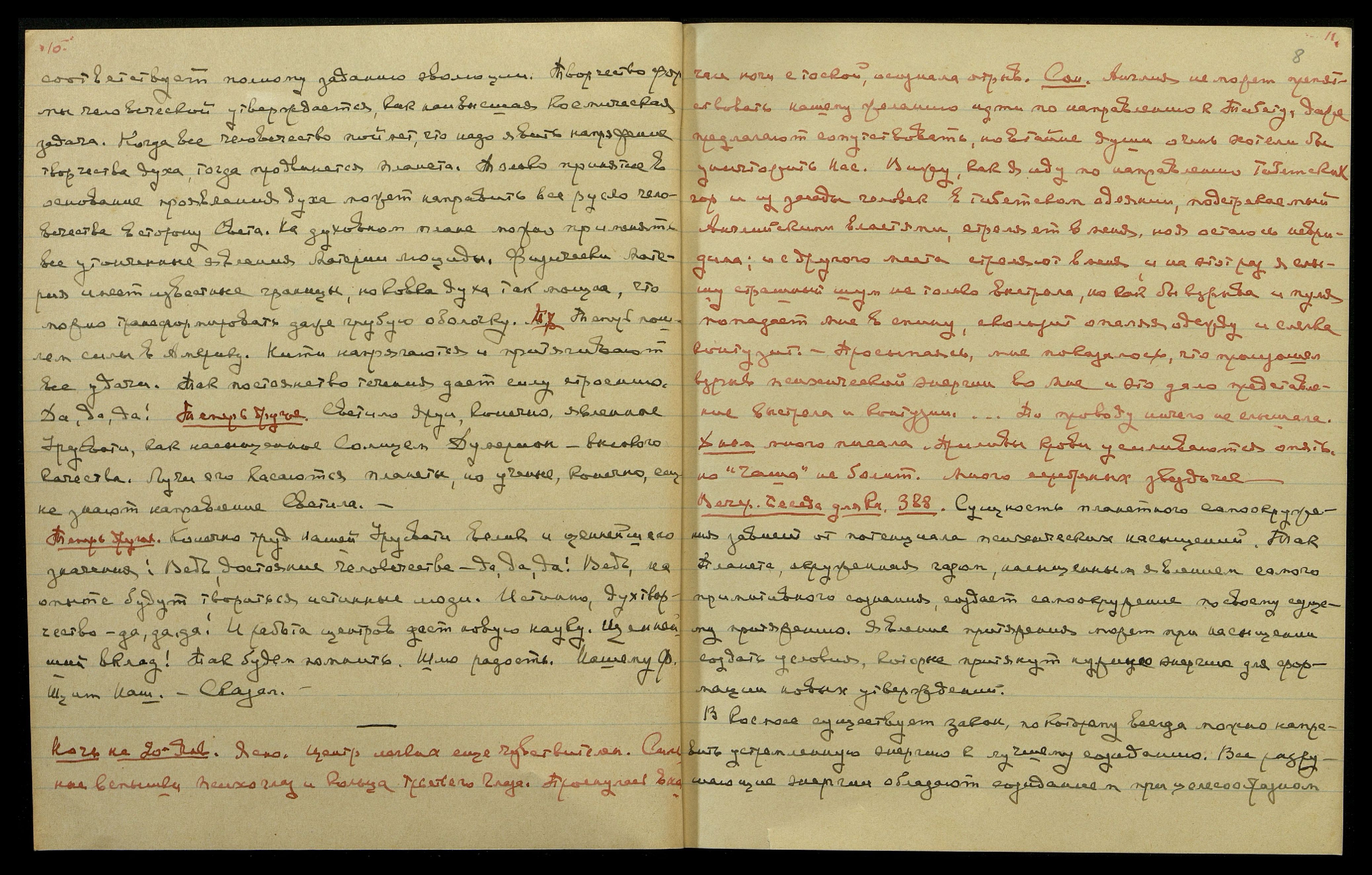 1) Видение встало в центре Колокола − пламя несколько как бы свечей объединены в один огненный круг. Видение это [было] на фоне серебряного света. 2) Видение водной поверхности как бы моря, освещённой лунным светом. Два корабля, шхуны − на носу одной стоит человек в рубахе с открытым воротом и кричит: "Save me, save me! [англ.: Спаси меня, спаси меня!]" 3) Видение. Ущелье среди гор − несётся широкий водный поток. Впечатление, что поток этот несёт бедствие. Сон: лечу с близкими как бы на светящуюся гору, подъём очень крутой. На самой вершине срываюсь и лечу вниз, ощущаю это падение. Трудно, малейшее движение вызывает боль, но долго сидеть в одном положении не могу, затекают члены. Дремлю, просыпаясь, слышу, но, конечно, записывать не могу. Под утро немного легче. Воздушный матрас много облегчает. 4) Видение. Рая бежит к моей двери и останавливается. За ней гонится слуга, вижу только его светлый ачкан. Знаю, что это Гриту, и [в] чём-то недоволен мною и вымещает злобу на Рае. Через два часа после этого видения, Рая рассказала мне, что Гриту хочет получить одну из выписанных нами фуфаек для слуг и требует, чтобы она позвала Людмилу, которая лучше неё сможет передать мне его просьбу.