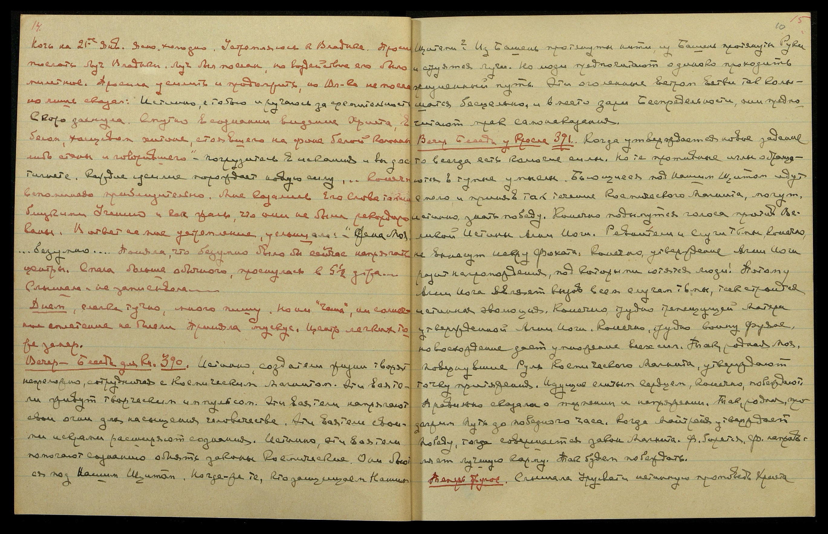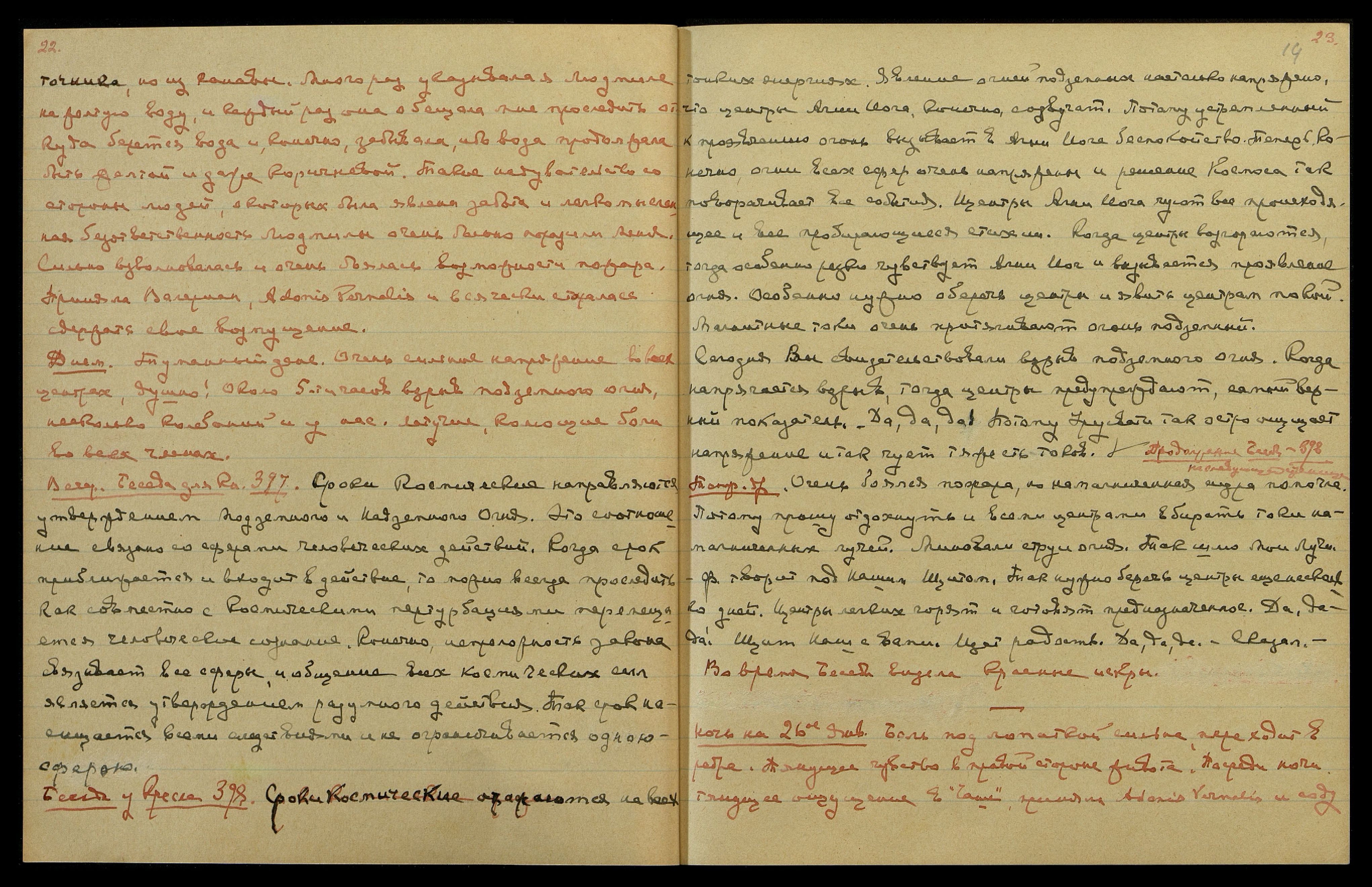 Днём. Боли продолжаются. Напряжение в центре лёгких очень сильное. Нужно остерегаться малейшего движения. Пишу много, как всегда. К шести часам сильные приливы крови к голове. После ужина и во время Беседы, как всегда, перемежающие волны холода и жара.