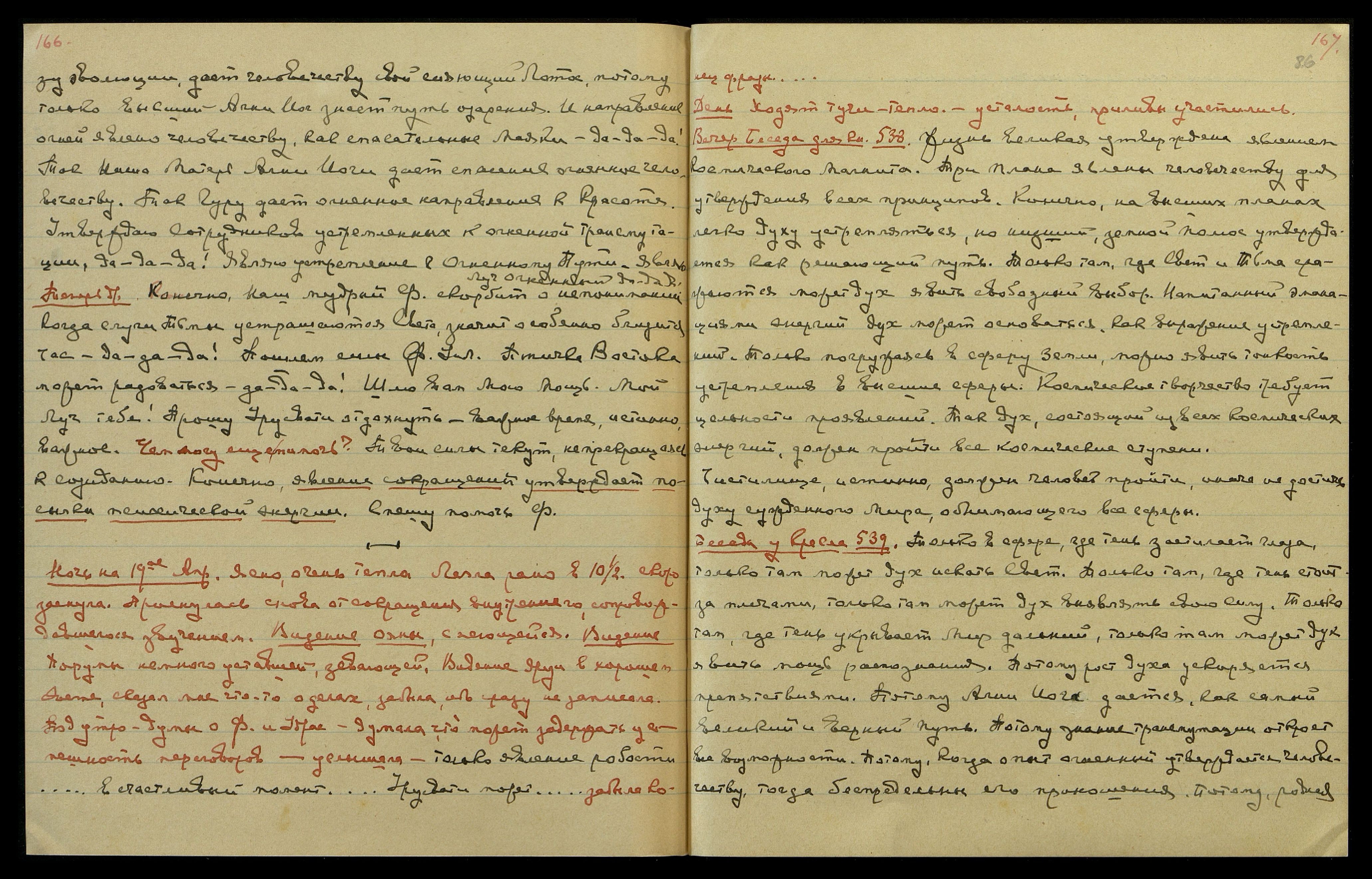 Ночь на 18-ое апреля. Ясно, очень тепло. После Беседы тянущие боли в "Чаше" и под рёбрами. Обычные синие, серебряные, пурпурные волны света. Заснула скоро. Дважды просыпалась от внутреннего сокращения со звучанием, внутри меня. После двенадцати начались сильные тянущие боли в солнечном сплетении и в " Чаше", и передались в рёбра и [в] колени. После приёма соды успокоились. Слышала, немного записала. "Послезавтра...", − длинное сообщение упустила. "Guard the heart... a current against the wall... [англ.: Храни своё сердце... течение у стены...] Соявление Нашего тока, волшебно творит..." Казалось, боли вызваны этим током. Видение Ояны − светлое лицо со слезами на глазах. Видение Порумы, очень напряжённо думающей, старается понять. Видение Н[иколая] К[онстантиновича] − очень светлый, весь светится, весь в напряжении, вызывающем в нём боли − слёзы катятся из глаз. Мне тяжко было видеть это напряжение! "Срок Космического Слияния утверждён... Thou wilst reach the summits of the Existence... [англ.: Ты достигнешь вершин Существования...] Только предрассудок лишает Моих Лучей".