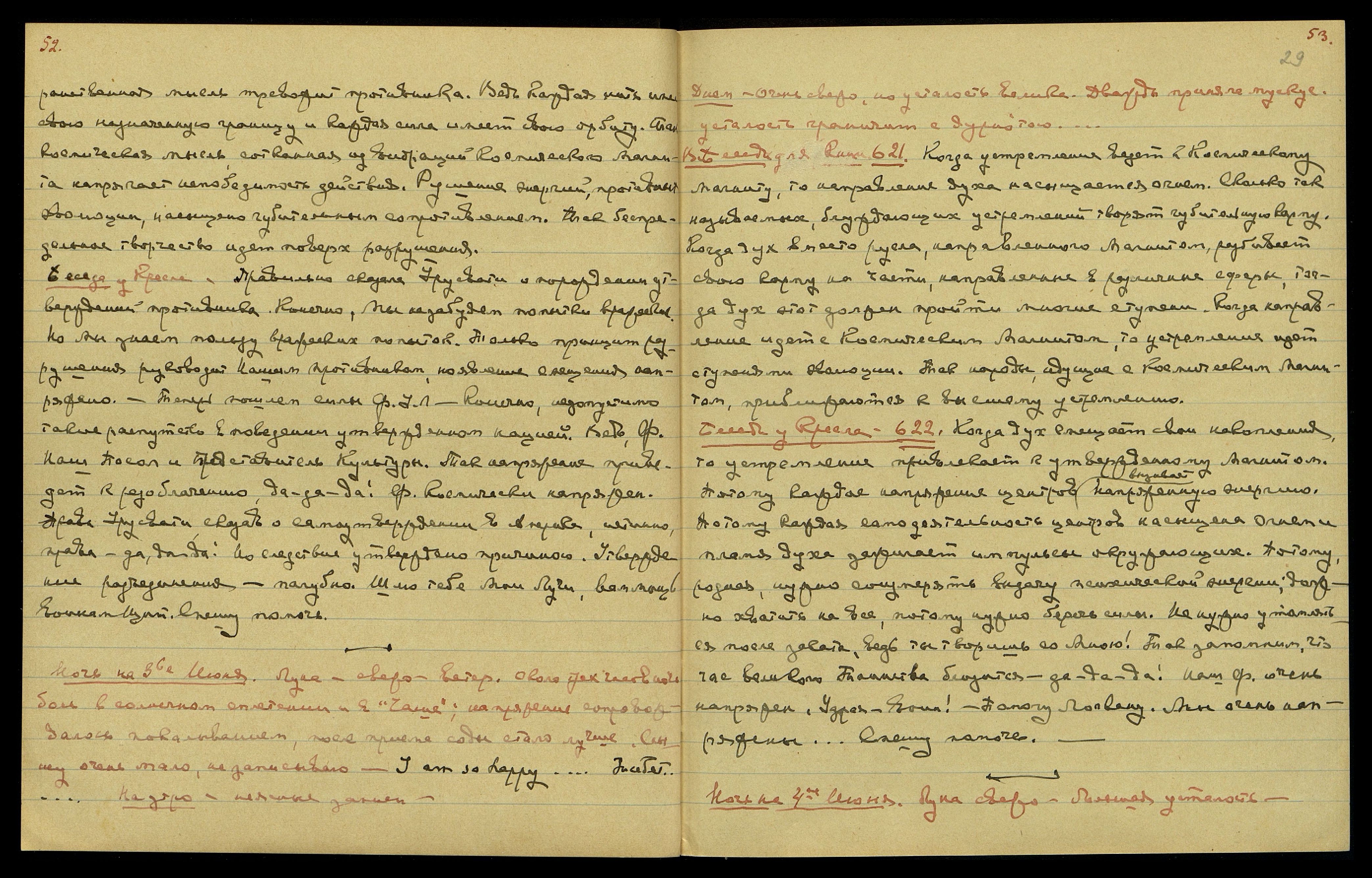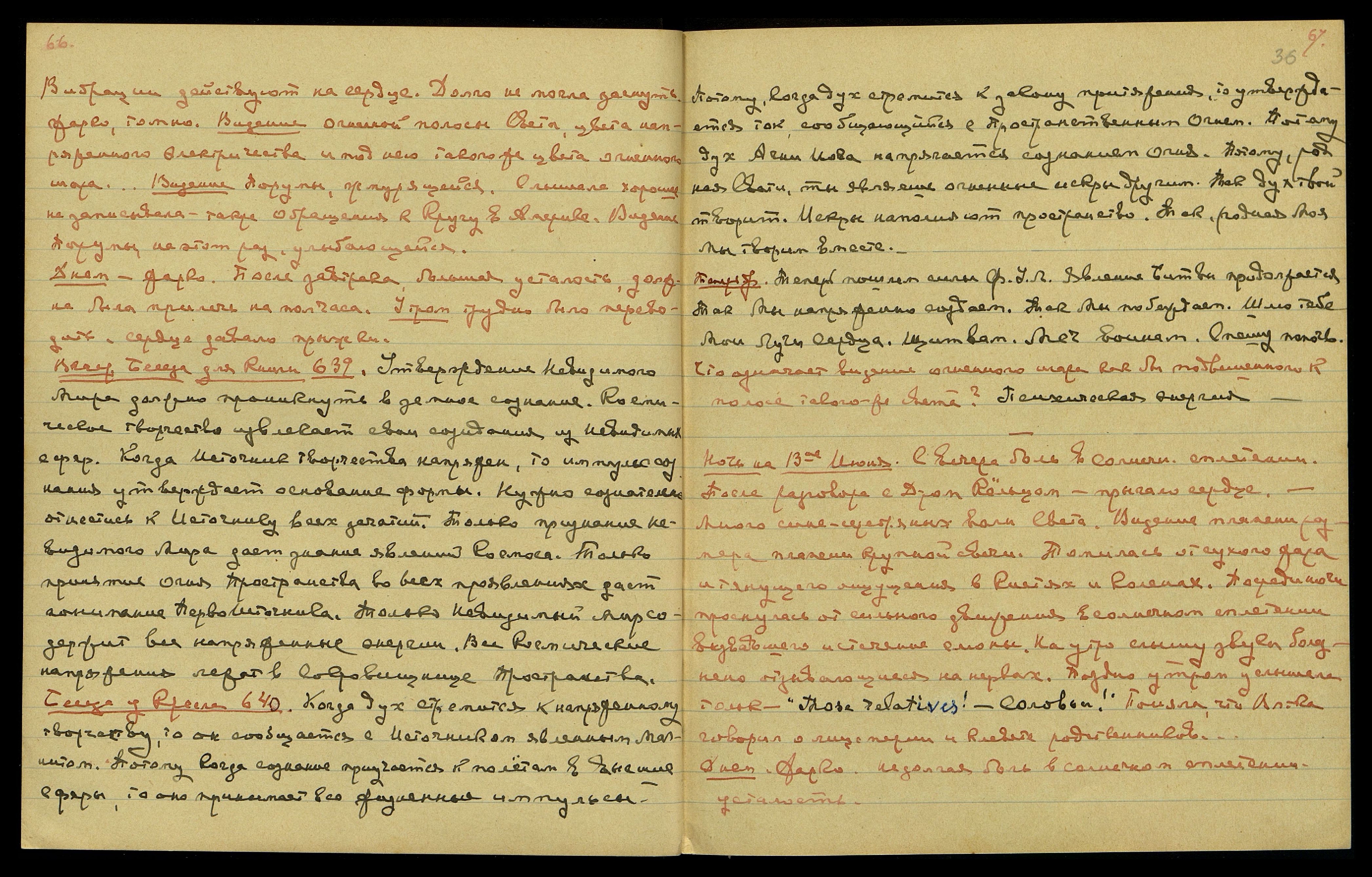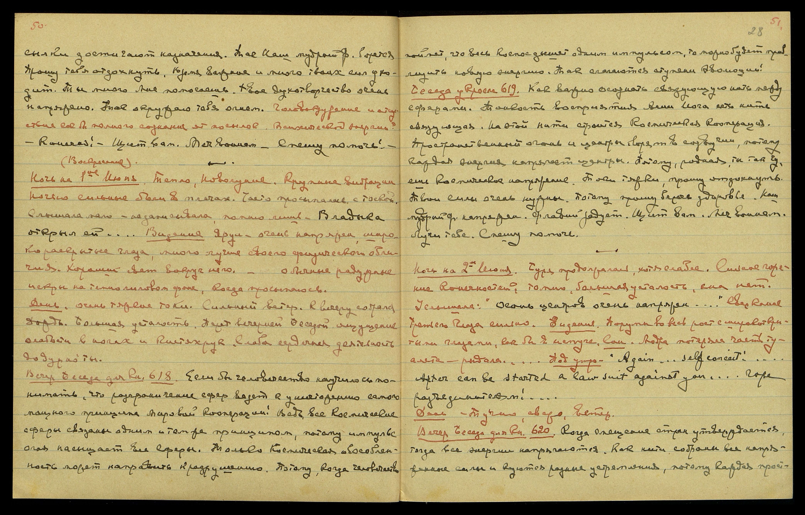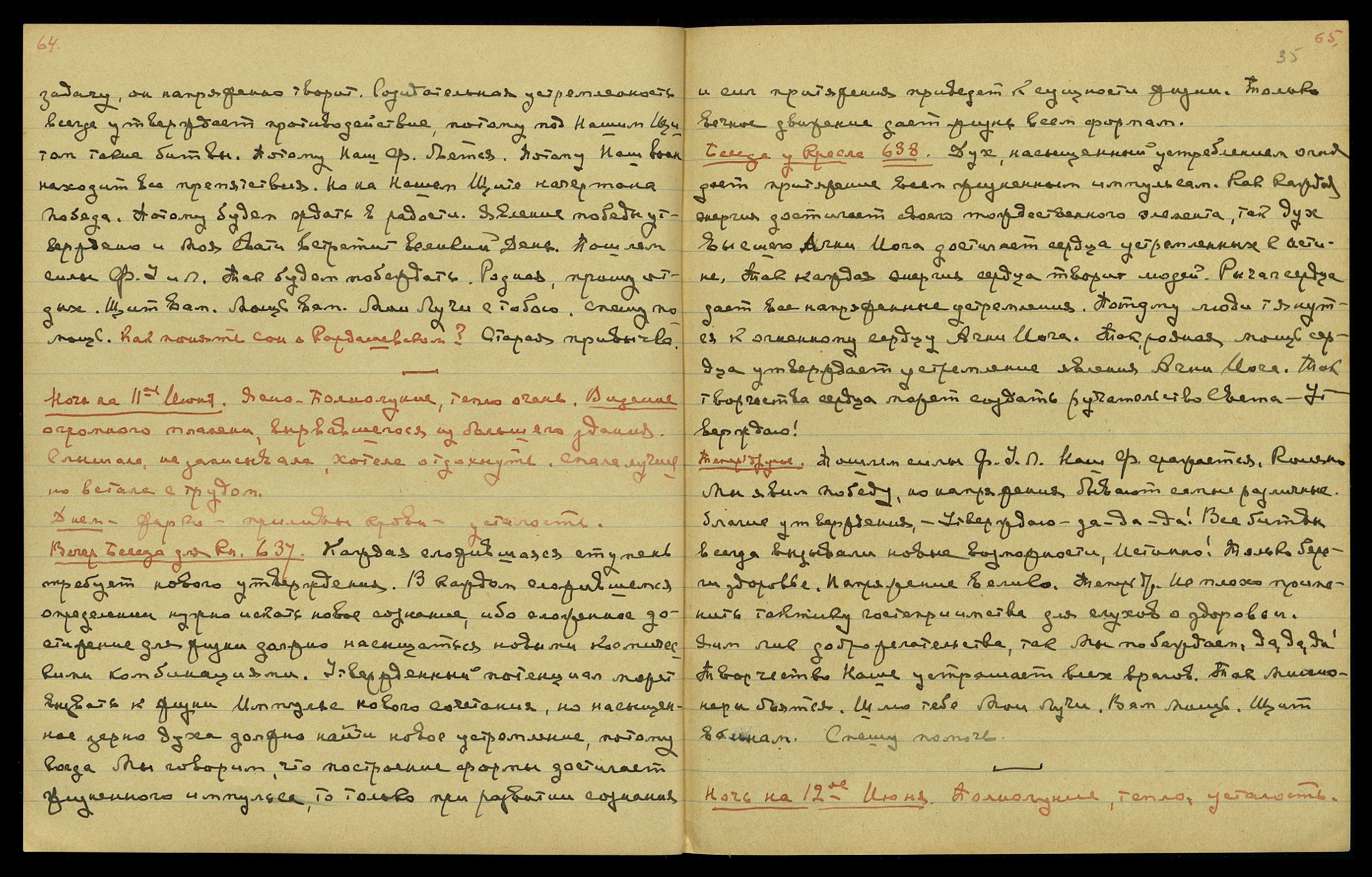 Ночь на 13-ое июня. С вечера боль в солнечн[ом] сплетении. После разговора с д[окто]ром Кёльцем прыгало сердце. Много сине-серебряных волн света. Видение пламени, размер[ом] с пламя крупной свечи. Томилась от сухого жара и тянущего ощущения в кистях и коленах. Посреди ночи проснулась от сильного движения в солнечном сплетении, вызвавшего истечение слюны. Наутро слышу звуки, болезненно отзывающиеся на нервах. Поздно утром услышала только: "Those relatives [англ.: Эти родственники] − соловьи!" Поняла, что Владыка говорил о лицемерии и клевете родственников.