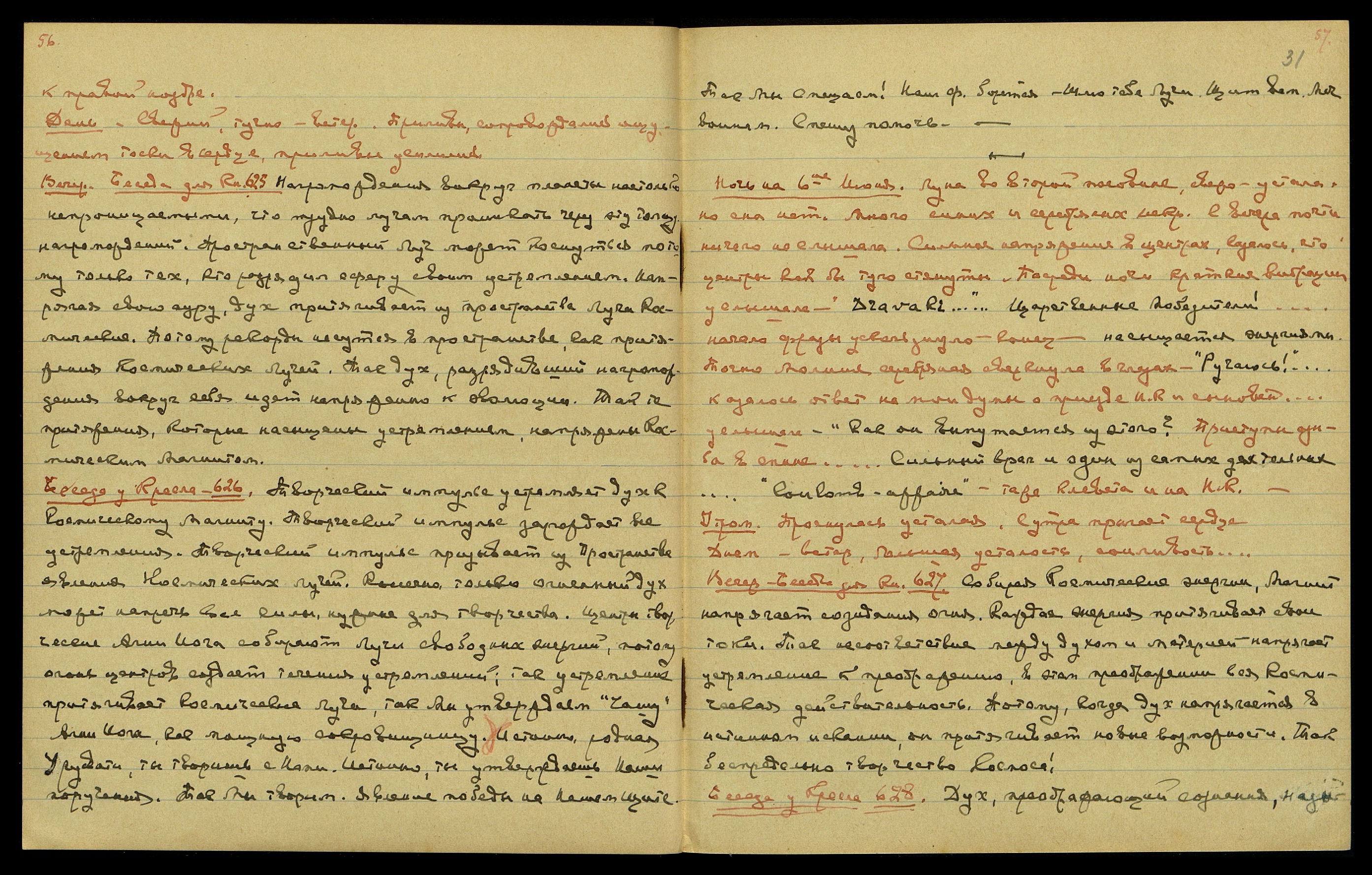 Ночь на 6-ое июня. Луна во второй половине, свежо. Устала, но сна нет. Много синих и серебряных искр. С вечера почти ничего не слышала. Сильное напряжение в центрах, казалось, что центры как бы туго стянуты. Посреди ночи краткие вибрации, услышала: "Dravaki... Царственные победители!" Начало фразы ускользнуло, конец: "...насыщается энергиями". Точно молния серебряная сверкнула в глазах: "Ручаюсь!" Казалось, ответ на мои думы о приезде Н[иколая] К[онстантиновича] и сыновей. Услышала: "Как он выпутается из этого?" Приступы озноба в спине... "Сильный враг и один из самых деятельных... Coulomb affairs. [англ.: Дело Куломбов.*]" Та же клевета и на Н[иколая] К[онстантиновича].