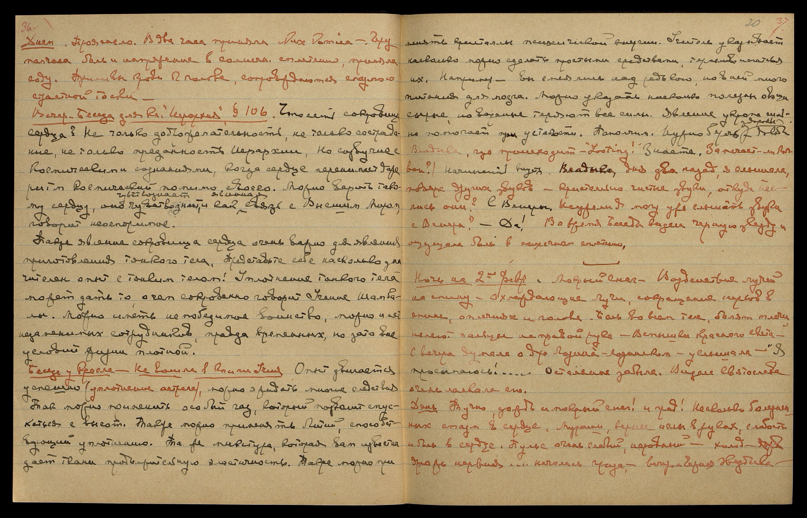 С вечера сильные боли в солнечн[ом] сплетении, приняла соду. Слабость пульса, приняла строфант с валерианом. Радужные и пурпуровые световые образования. Воздействие на сердце Лучей. Сна нет. Частые спазмы тоски отдаются болезненно между лопатками. Чёрные волны чередуются с радужными. Слышу, не записываю. Боль в сердце с вечера довольно сильная, к 6 час[ам] утра прекратилась. Всю ночь пульс неровный.