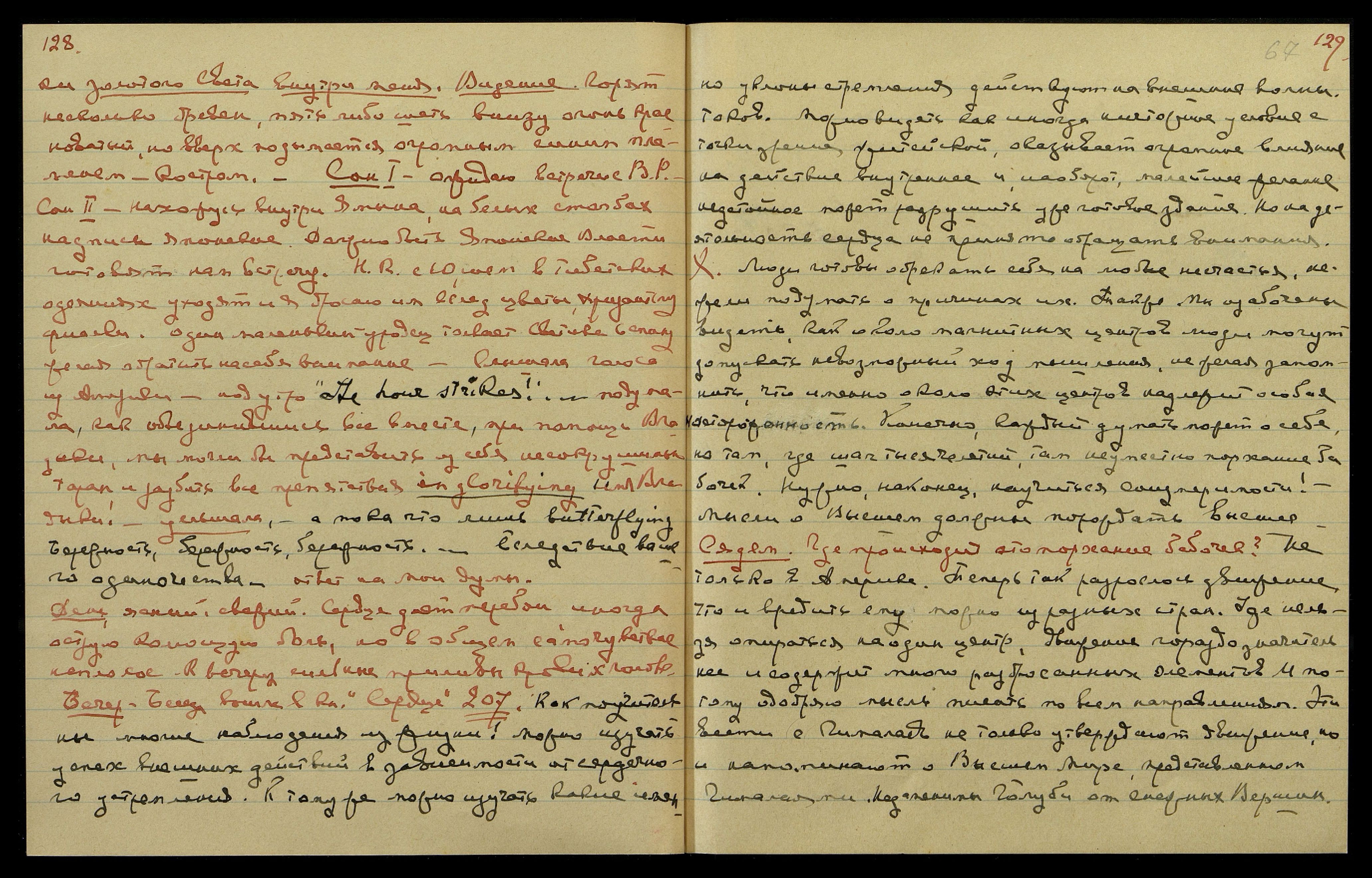 Ночь на 3-е Февр[аля]. Облачно, тепло. С вечера, очень яркий компактный золотой свет поднялся изнутри. Многократные приступы мурашей, сокращения нервов под охлаждающими лучами. Двойной пульс, и один пульс сердца — медленный, другой, особо ощутимый у гортани, очень быстрый...