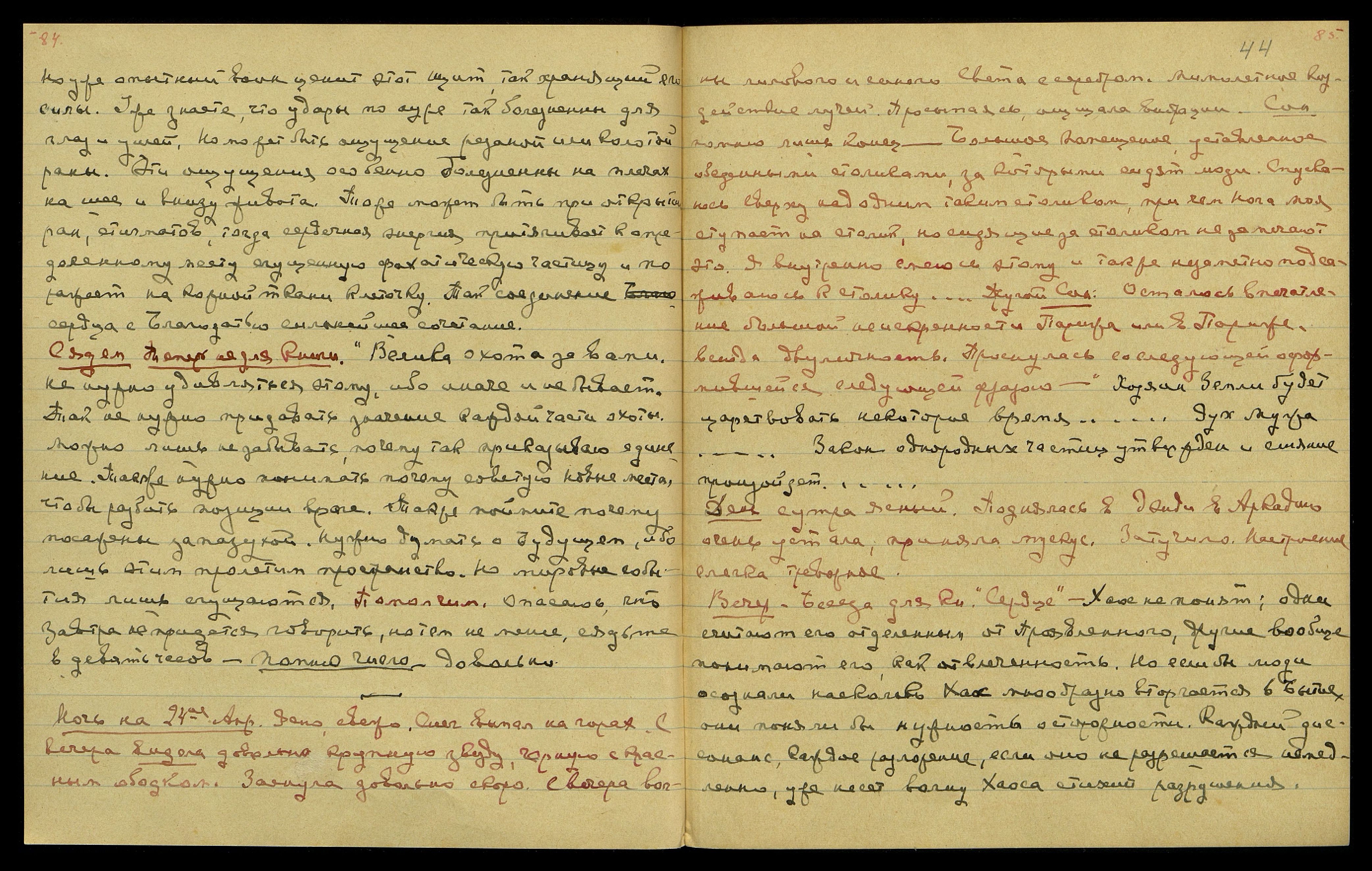 Ночь на 22-ое апр[еля]. Ясно, чувство тоскливое, но скоро заснула. Просыпаюсь, вся голова наполнена сообщениями − не записывала. Посреди ночи сильнейшие мураши на область живота и грудь. Охлаждающие лучи. Сон. Видела Катрин, очень огрузла, потеряла интерес к жизни. Я послала её на работу с определённым поручением... Под утро. "Я слежу за ним..." Поняла, что это относится к Кёльцу, приехавшему 18-го апр[еля] в New-York.