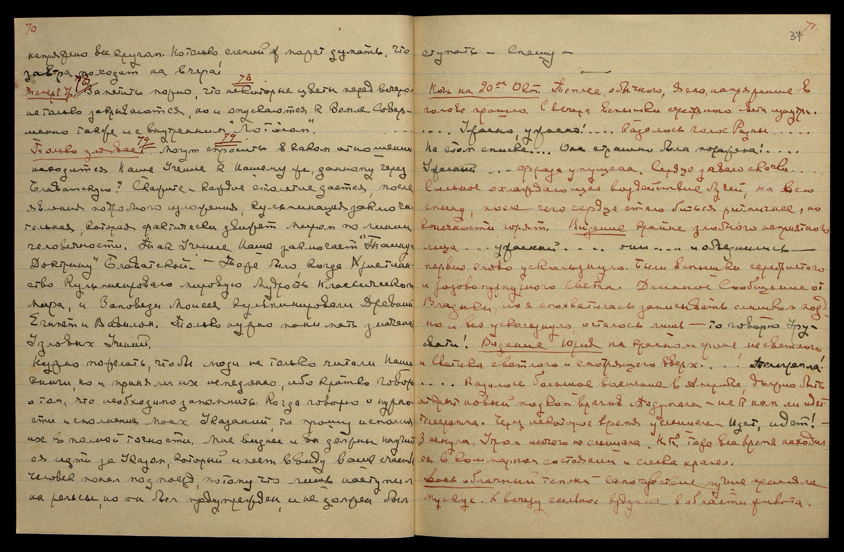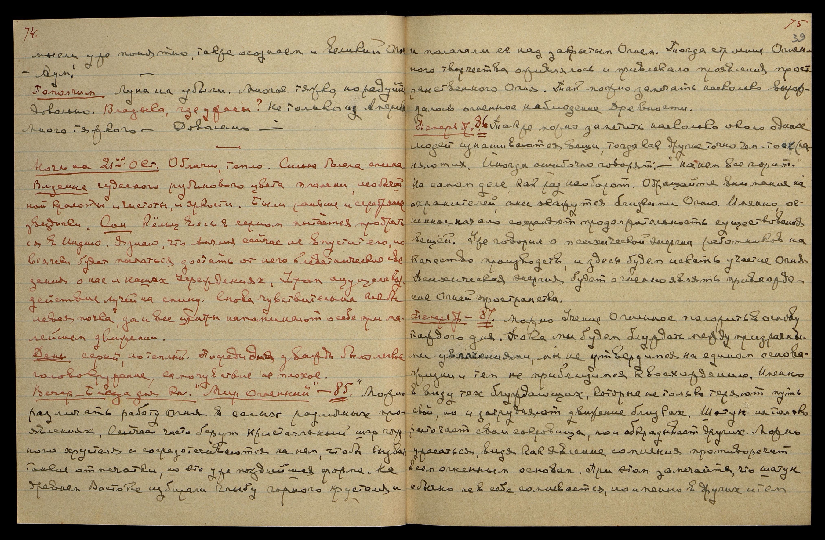 Ночь на 21-ое Окт[ября]. Облачно, тепло. Сильно болела спина. Видение чудесного рубинового цвета пламени, необычайной красоты и чистоты, и яркости. Были раньше и серебряные звёздочки.