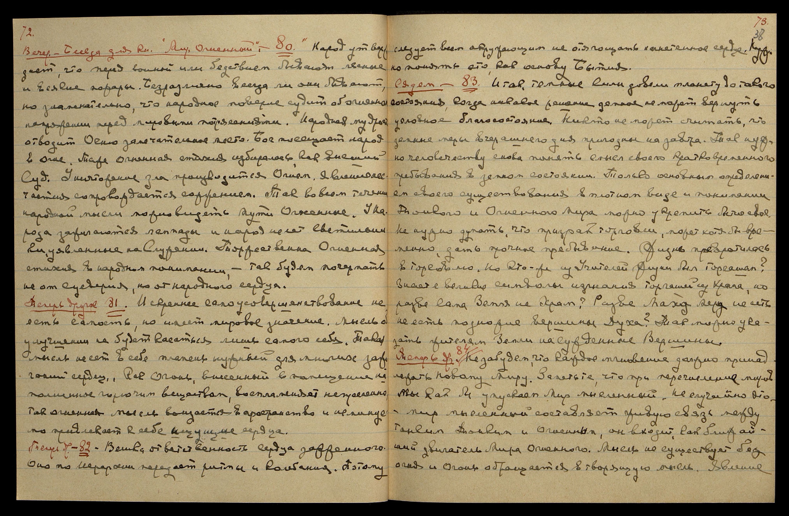 Вечер. Беседа для Кн[иги] "Мир Огненный", 80. Народ утверждает, что перед войной или бедствием бывают лесные и всякие пожары. Безразлично всегда ли они бывают, но знаменательно, что народное поверье судит об огненном напряжении перед мировыми потрясениями. Народная мудрость отводит Огню замечательное место. Бог посещает народ в Огне. Та же огненная стихия избиралась, как высший Суд. Уничтожение зла производится Огнём. Явление несчастия сопровождается сожжением. Так во всём течение народной мысли можно видеть Пути Огненные. У народа зажигаются лампады, и народ несёт светильники, уявленные на Служении. Торжественна Огненная стихия в народном понимании — так будем почерпать не от суеверия, но от народного сердца.