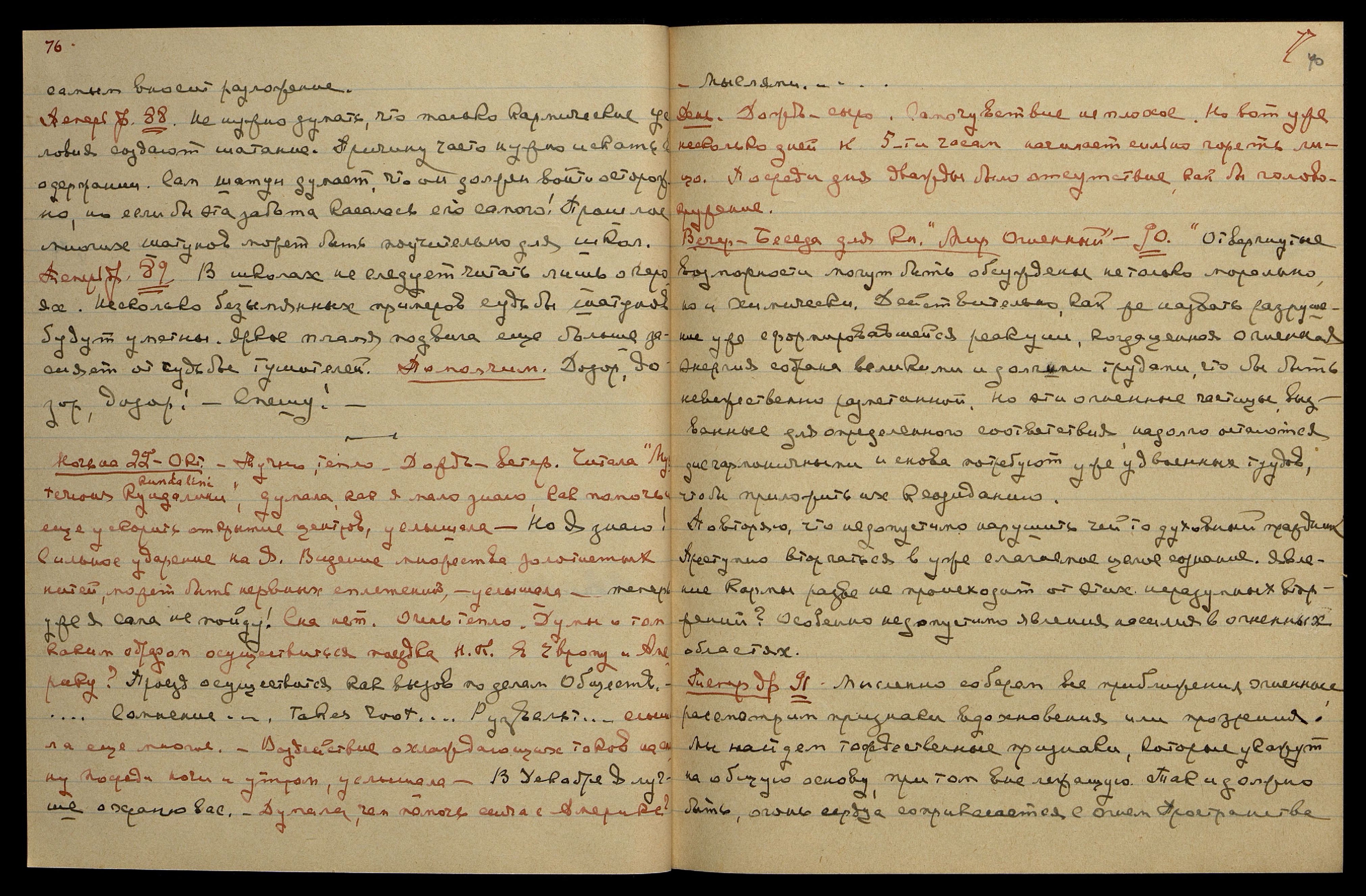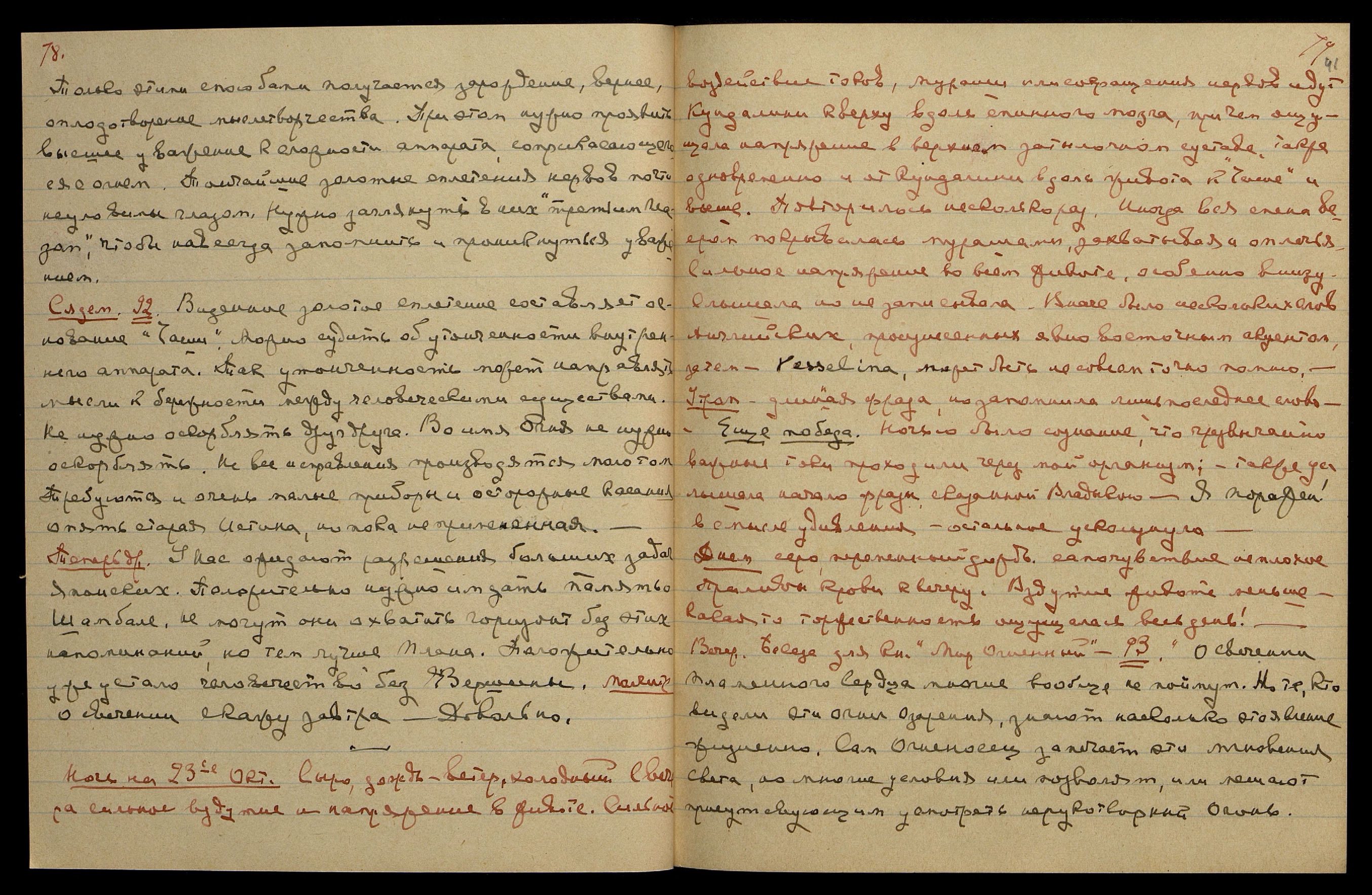 Видение Юрия на красном фоне, не светлого, и Светика светлого и смотрящего вверх...! "Телеграмма..." Казалось, большое волнение в Америке, должно быть открыт новый подкоп врагов. Подумала — не к нам ли идёт телеграмма. Через некоторое время услышала:" Идёт, идёт!". Заснула. Утром ничего не слышала. Н[иколай] К[онстантинович] тоже всё время находился в кошмарном состоянии и слегка храпел.