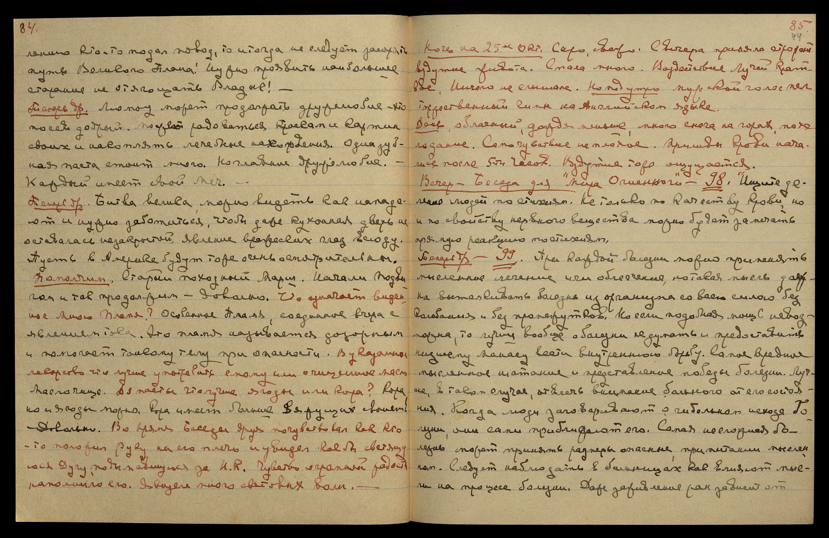 Ночь на 25-ое Окт[ября]. Сыро, свежо. С вечера приняла строфант, вздутие живота. Спала много. Воздействие Лучей краткое. Ничего не слышала. Но под утро мужской голос пел торжественный гимн на английском языке.